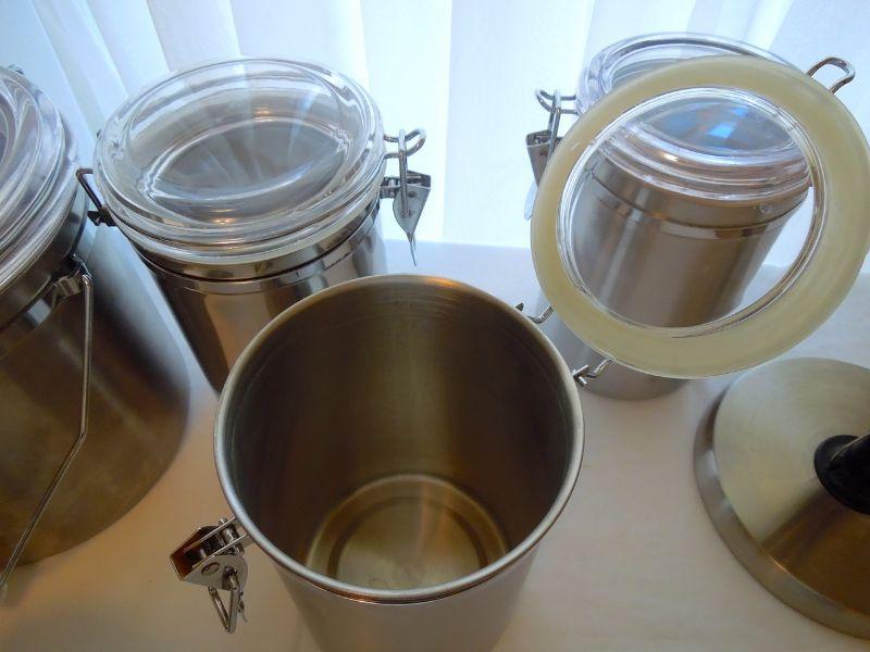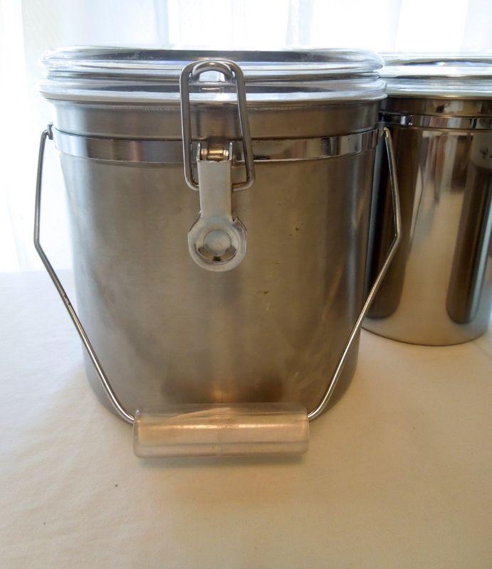 The lids are plastic and the canisters are stainless. No dents in canisters. One lid is slightly warped and the rubber gasket is loose. All the others are working fine. Stainless paper towel rack is 13" high and like new.