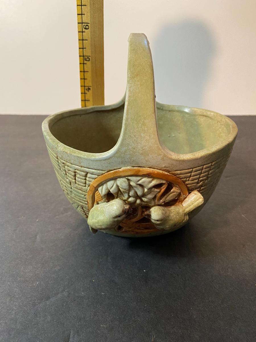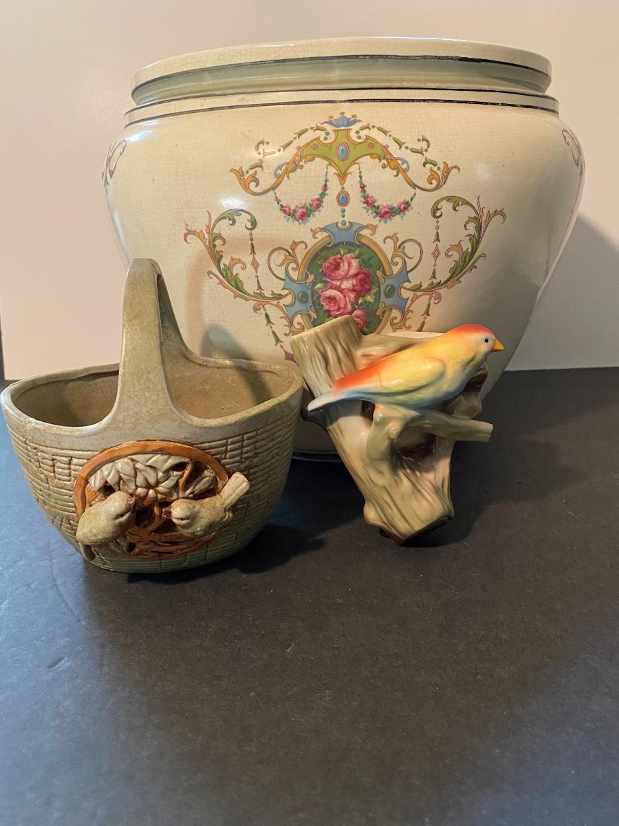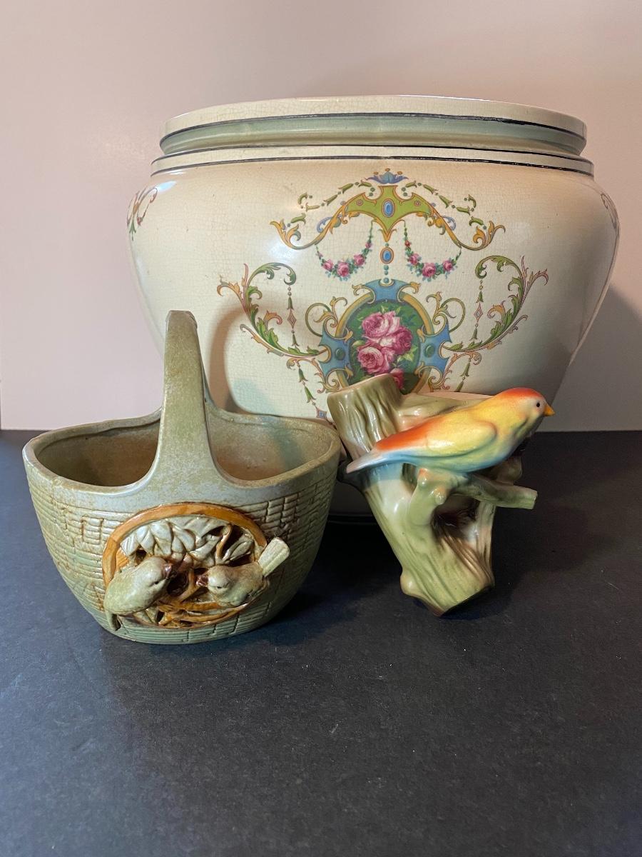 Beautiful large jardiniere/planter, modern pottery basket with birds, and bird wall pocket. Please see pictures as they are the best representation of the item, the condition of the item, and the size of the item.