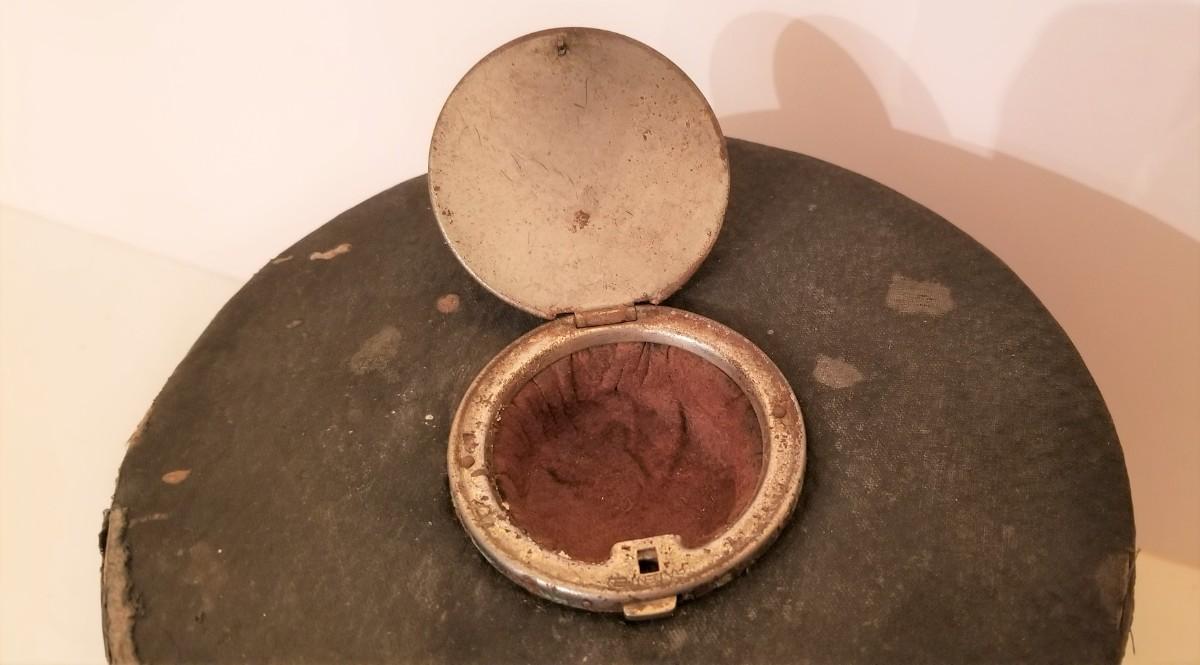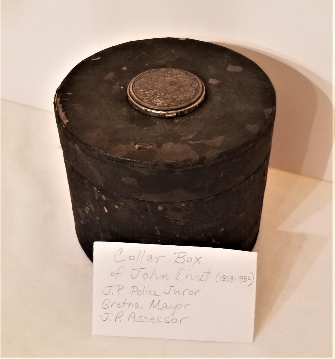 Turn of the century collar/stud box, descended in the Ehret family and previously owned/used by the first Mayor of Gretna, member of the Police Jury, and Jefferson Parish Assessor, John Ehret. Antique condition, as found. Built in stud box on top - an unusual feature. 5.25" tall, 6.25" across.