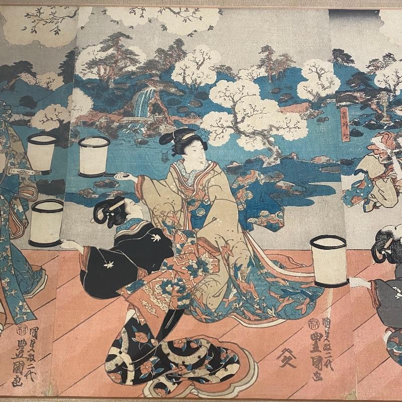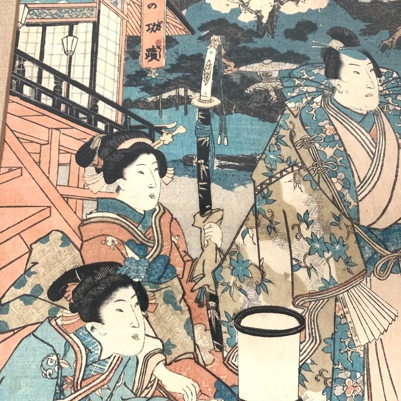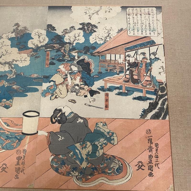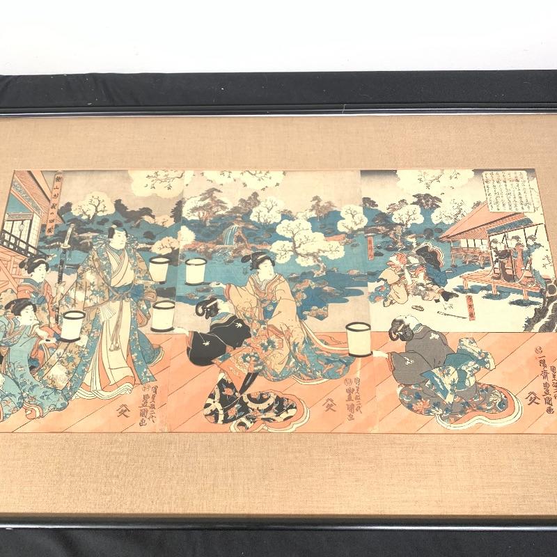 This lot includes one Asian art scene that is framed, mated, and behind glass. Appears to be on paper . The paper on the back of frame has some minor rips (see pictures). It measures 36in x 22in.