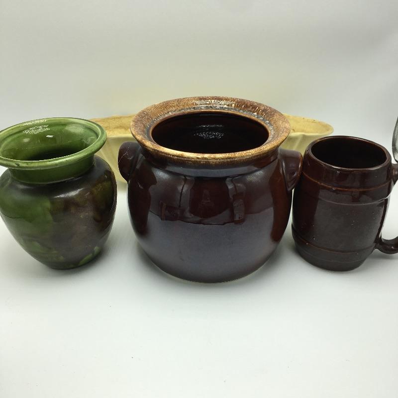 Assorted pottery includes Hull pot , small Haeger multi colored pot, mug and a large yellow tray.