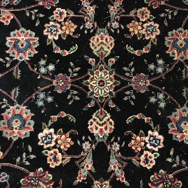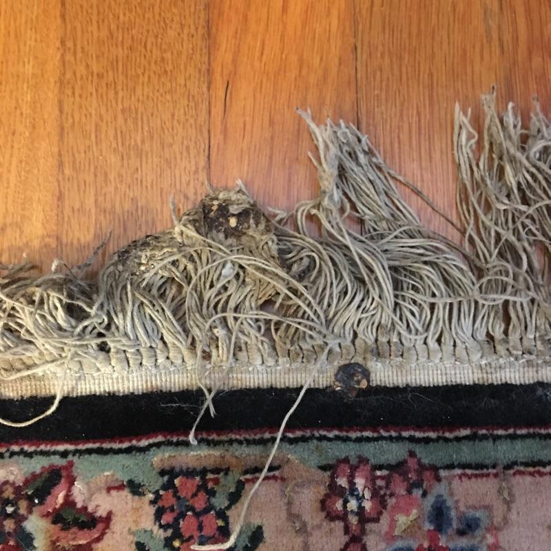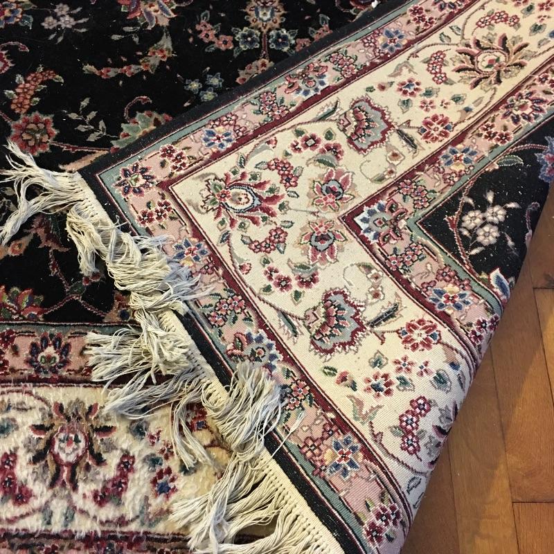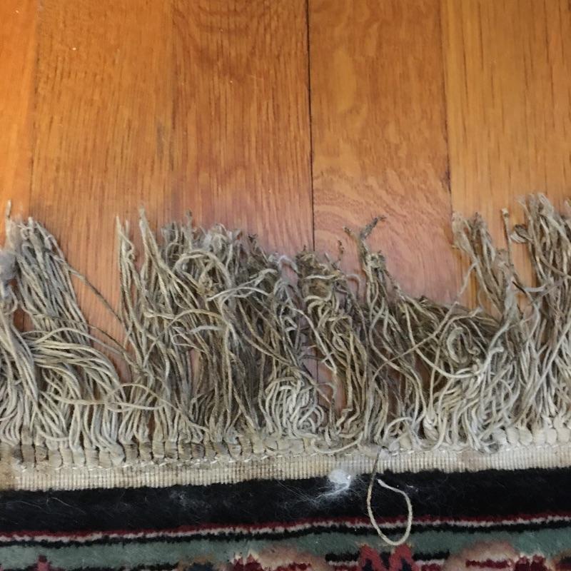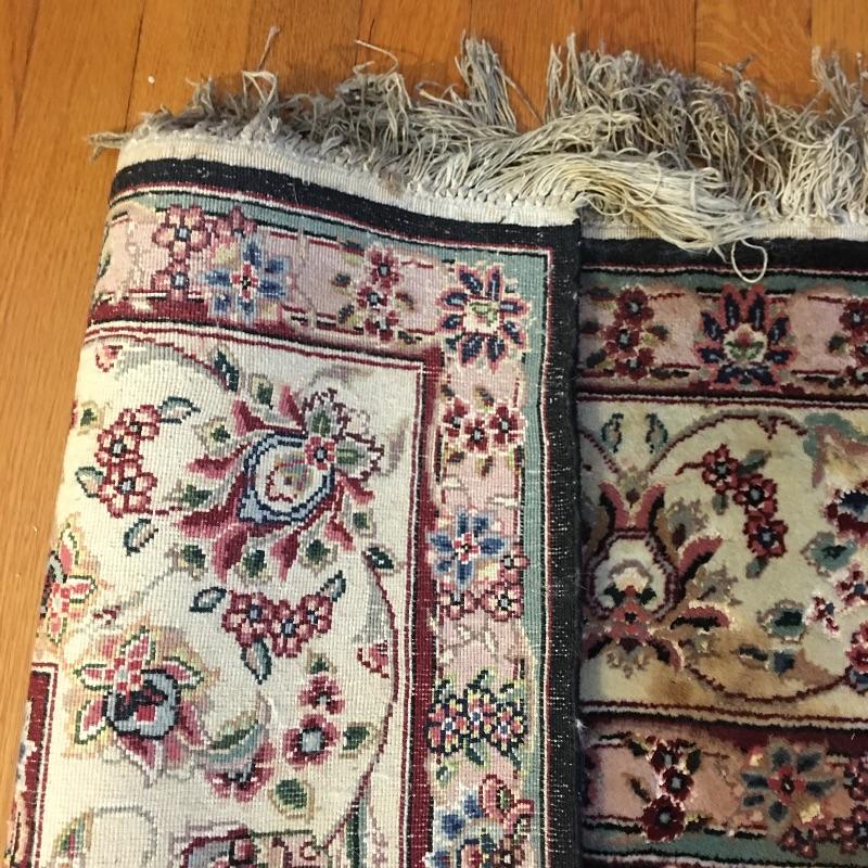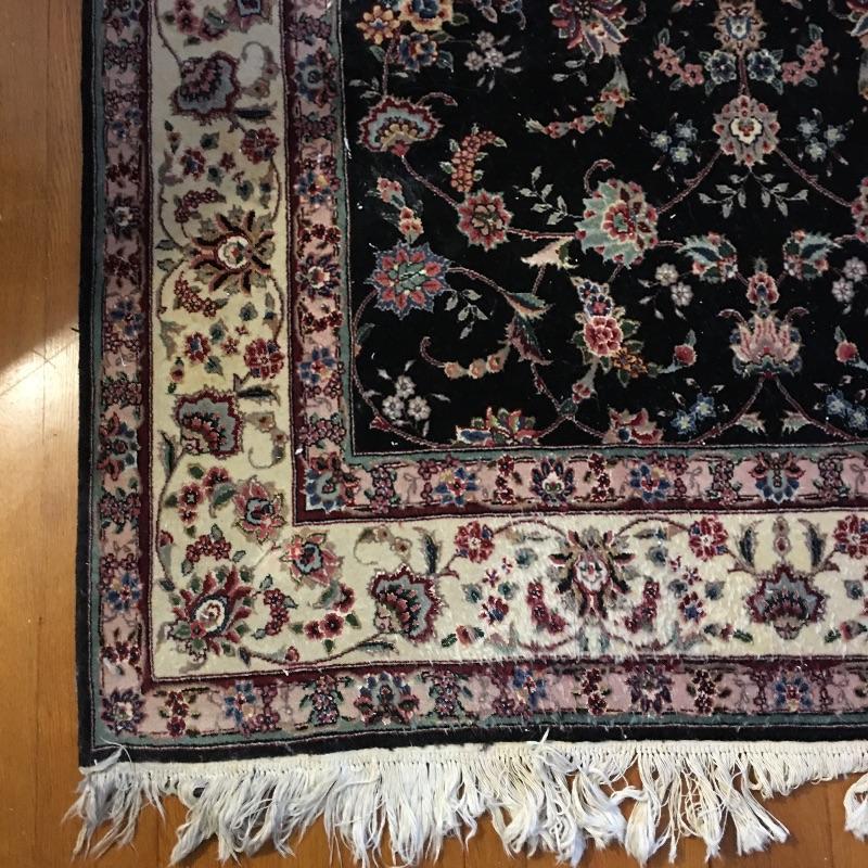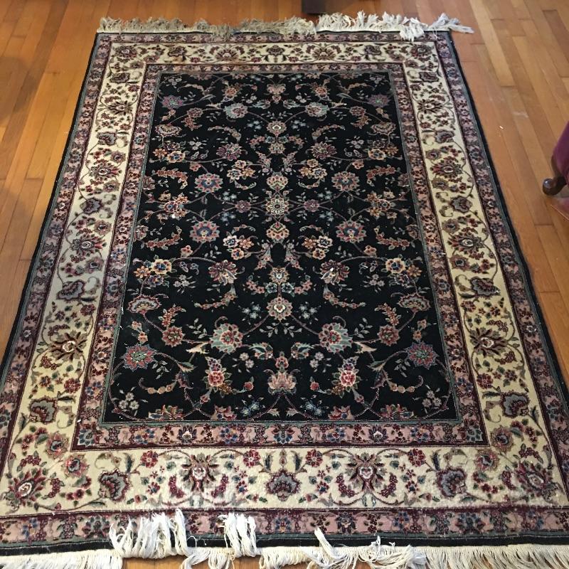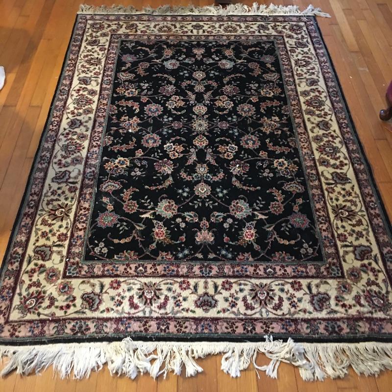 Black and cream area rug. Protect your hardwood floors and keep your feet warm all while adding beauty to your home. Rug has staining on one end of fringe, see pictures. Rug measures 54” x 85”.