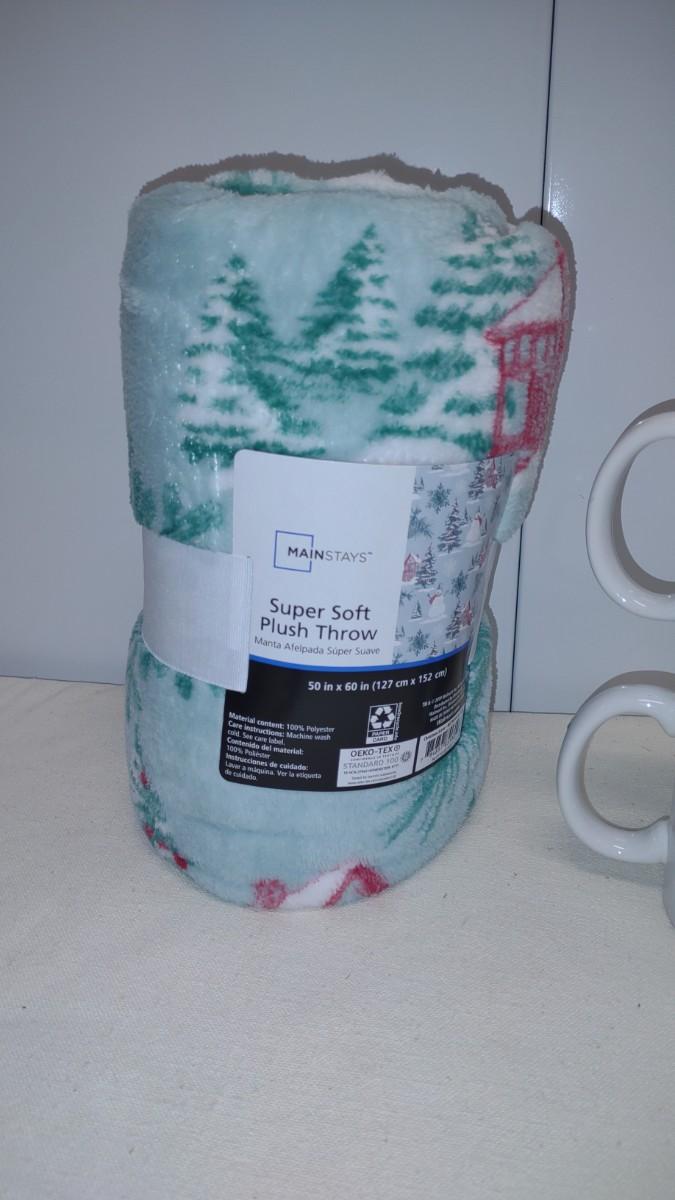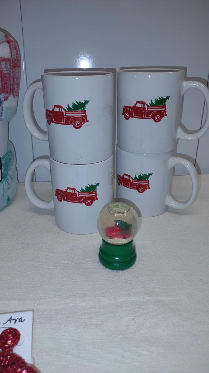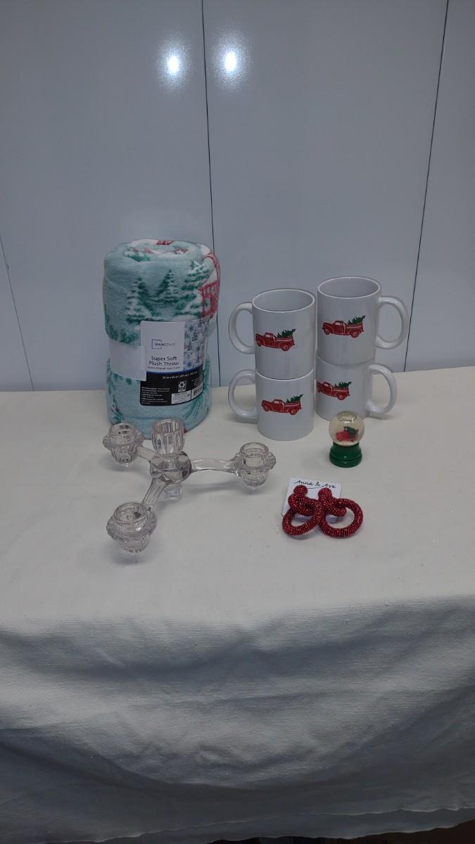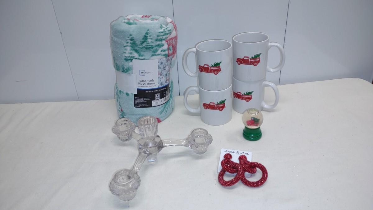 NEW THROW BLANKET, 4 COFFEE MUGS WITH A RED TRUCK AND CHRISTMAS TREE IN THE BACK, A MATCHING MINI SNOW GLOBE, A THREE PRONG ACORN CANDLESTICK HOLDER, AND LASTLY A PAIR OF RED EARRINGS BY ANNA AND AVA