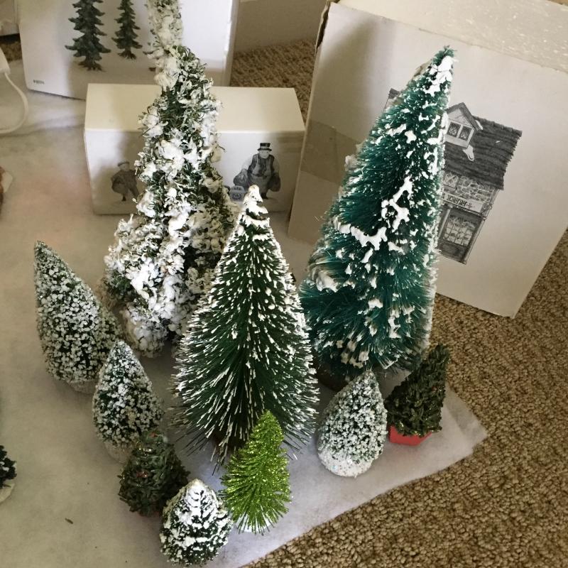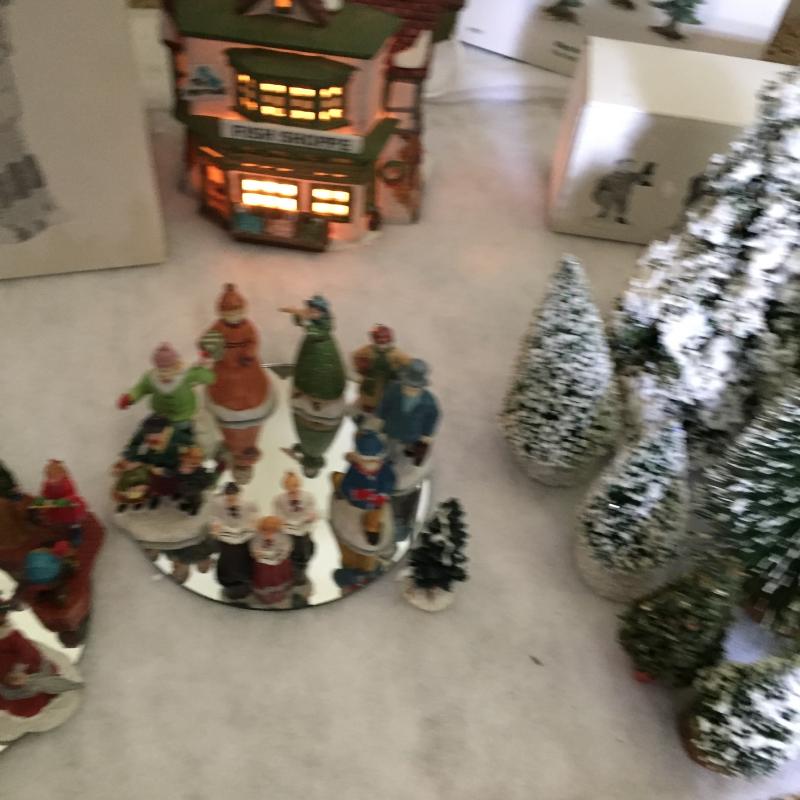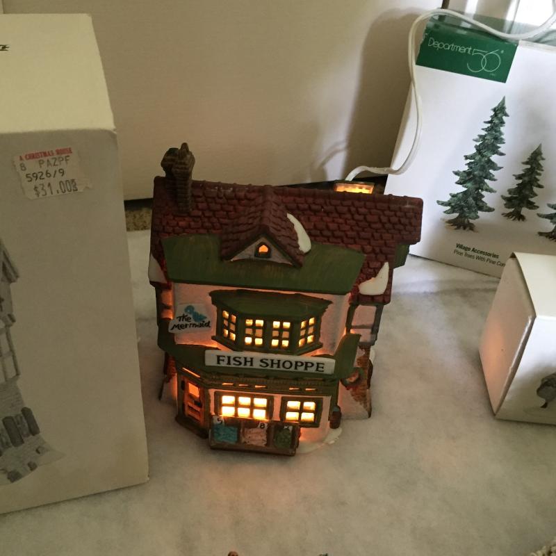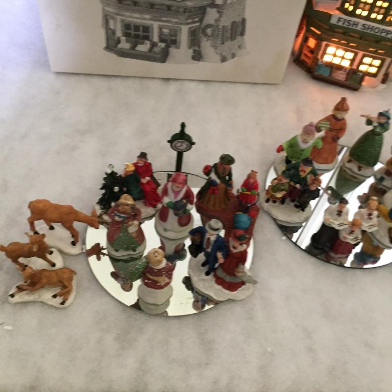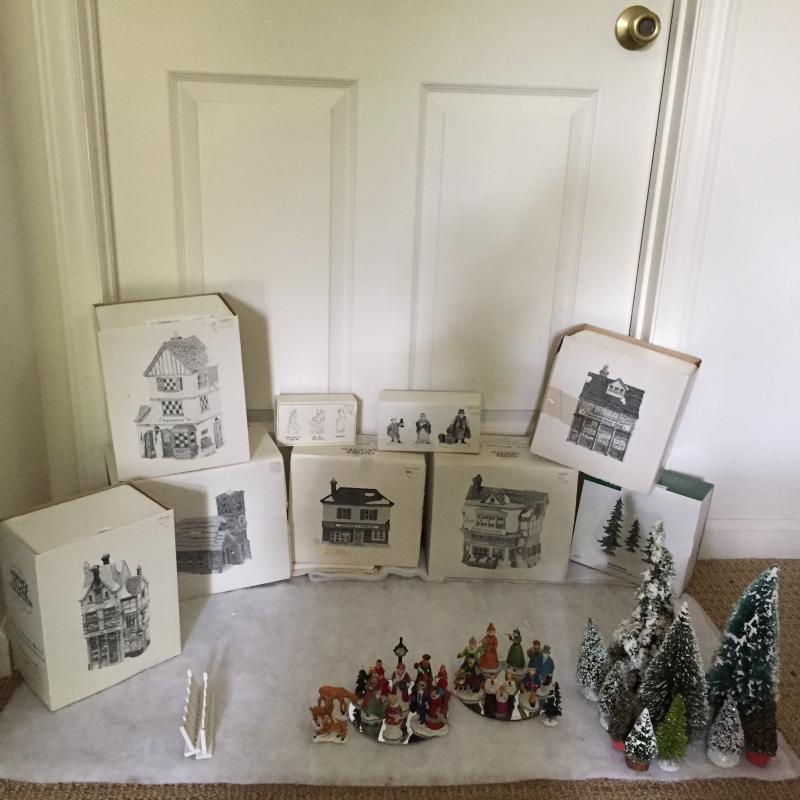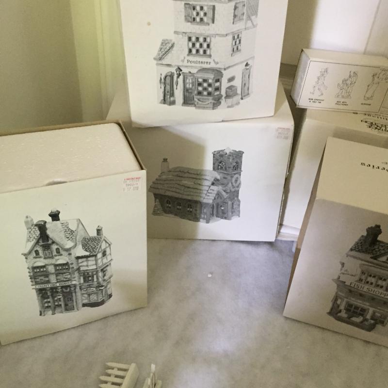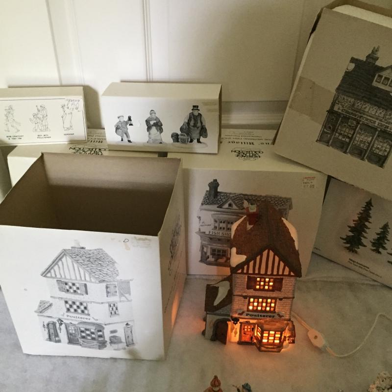 Delightful Christmas Village by The Heritage Village Collection. These make up the Dickens' Village Series and are made of handpainted porcelain. Department 56. Most of the shops light up when plugged in. Many are with original boxes. Some extra pieces. Local Pickup Only