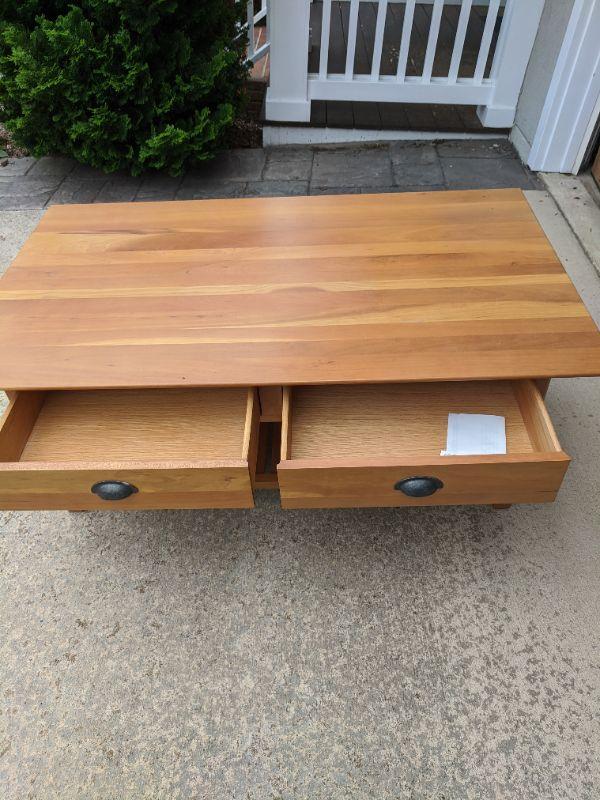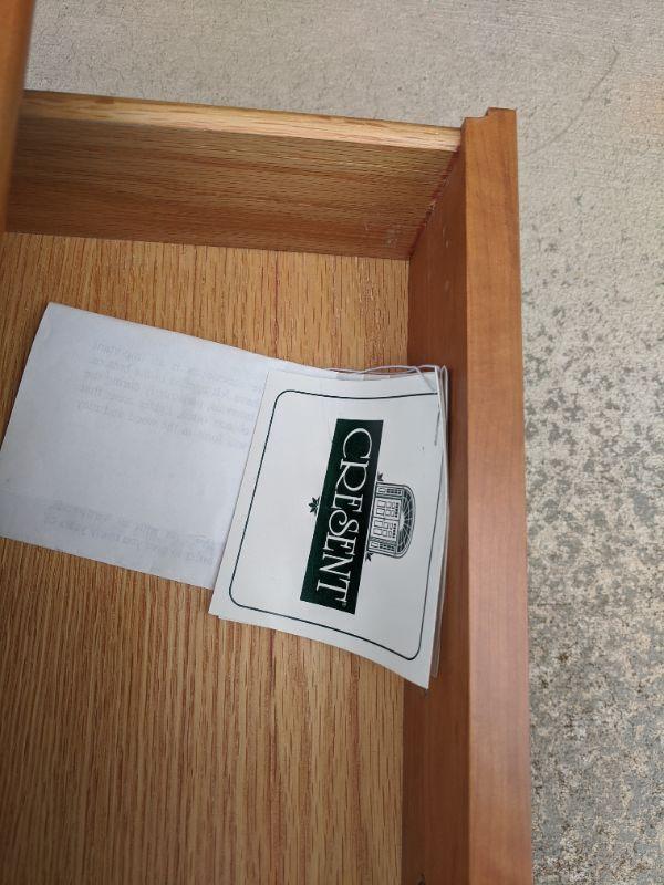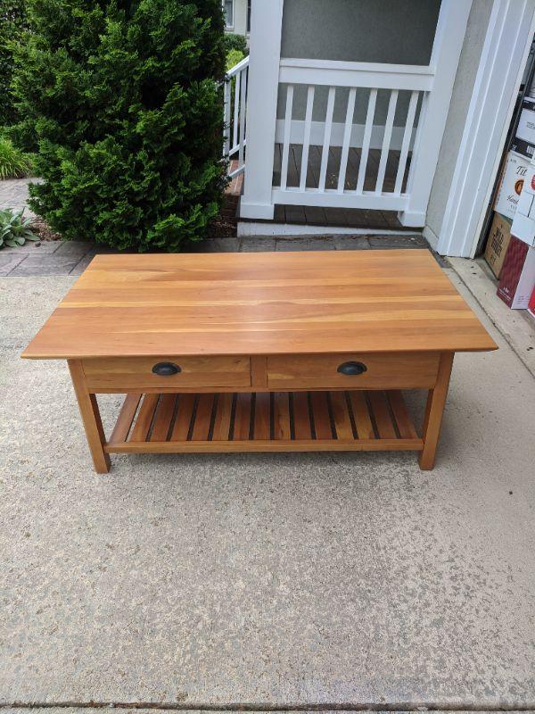 This beautiful coffee table is perfect for you living or TV room. There are two drawers along with a shelf. This table is exactly the table to kick you feet up after a long day. Reference lots 179 and 183 for other Crescent pieces. 48” x 28” x 19” high. No shipping