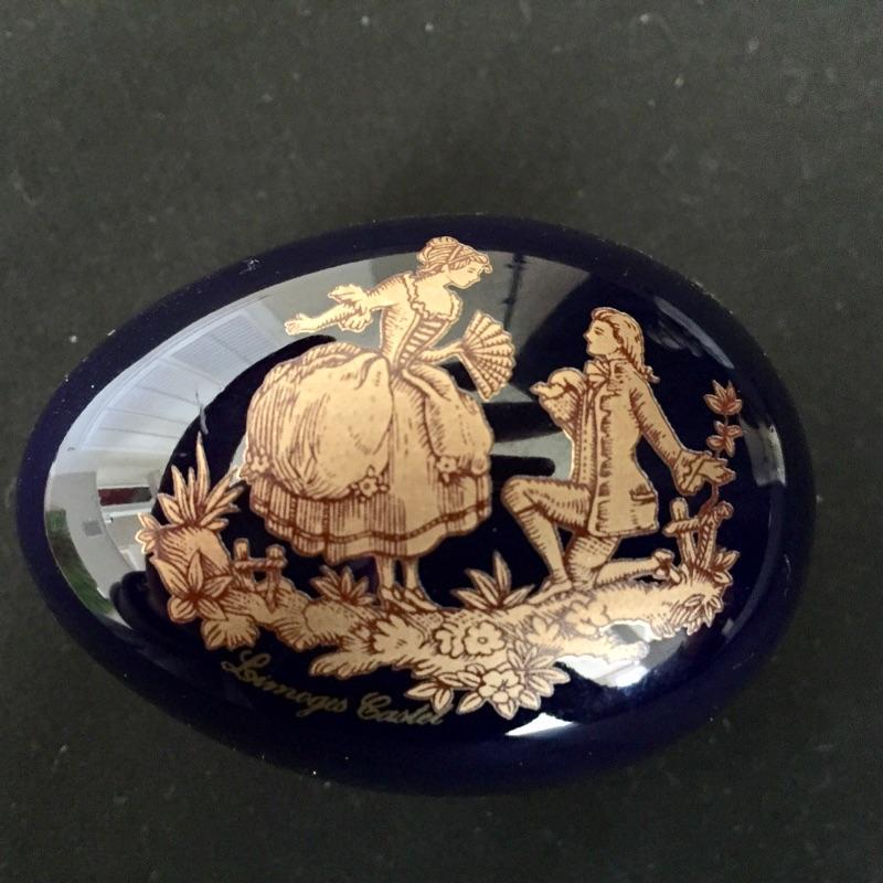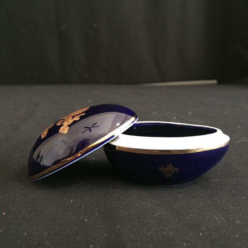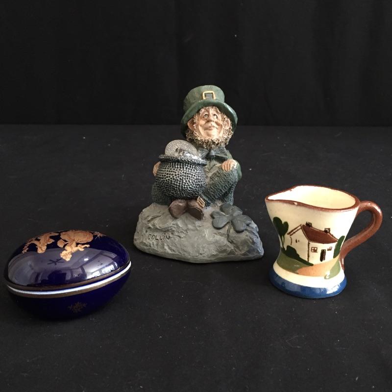 Have the luck of the Irish in your home with “˜Colin’, an adorable small leprechaun statue with his pot of money. Also included is a tiny ceramic jug ornament from England, made by Watcombe and a collectible porcelain cobalt blue and gold Limoges Castel egg made in France.
