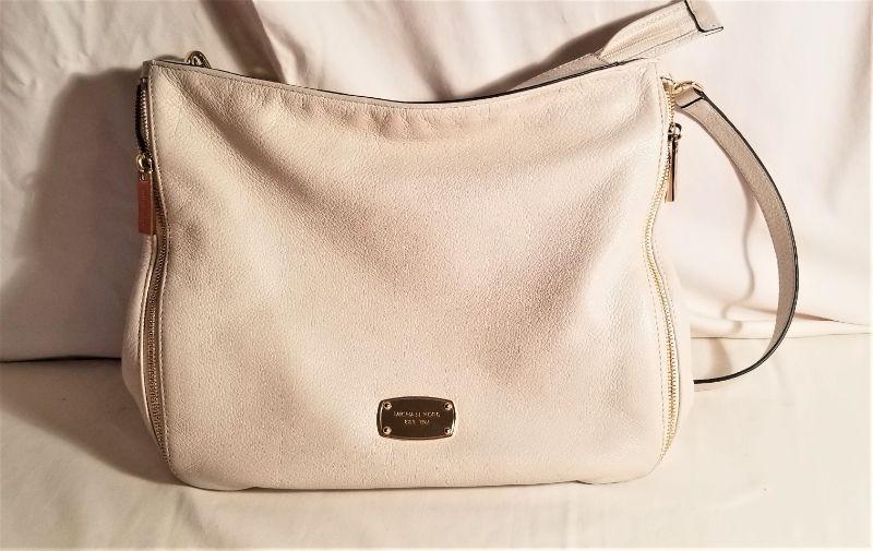 Nice Ivory colored Michael Kors handbag - very gently used. Measures 13" across, 11" tall.
