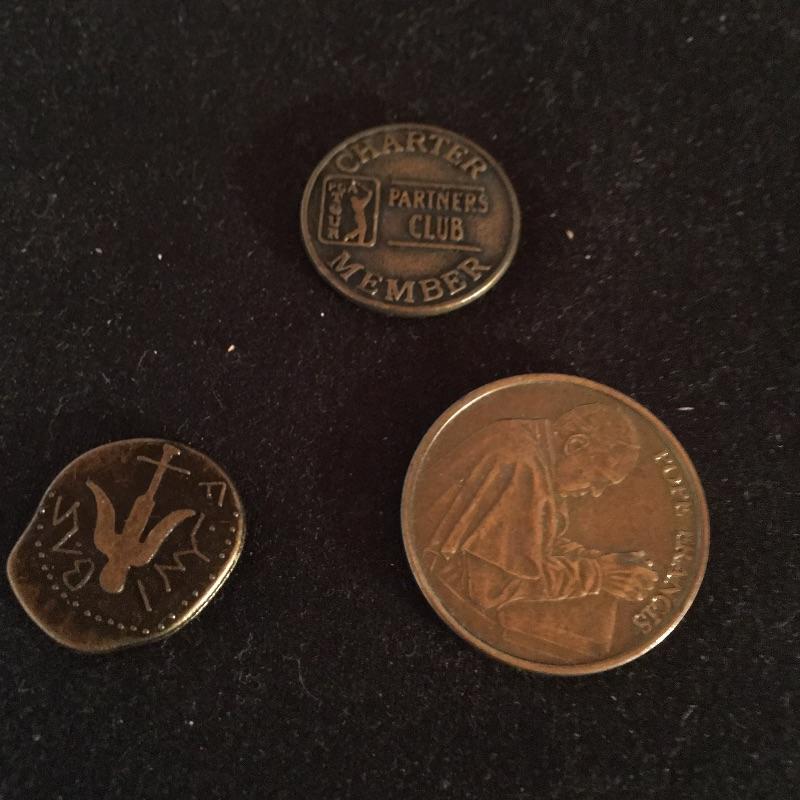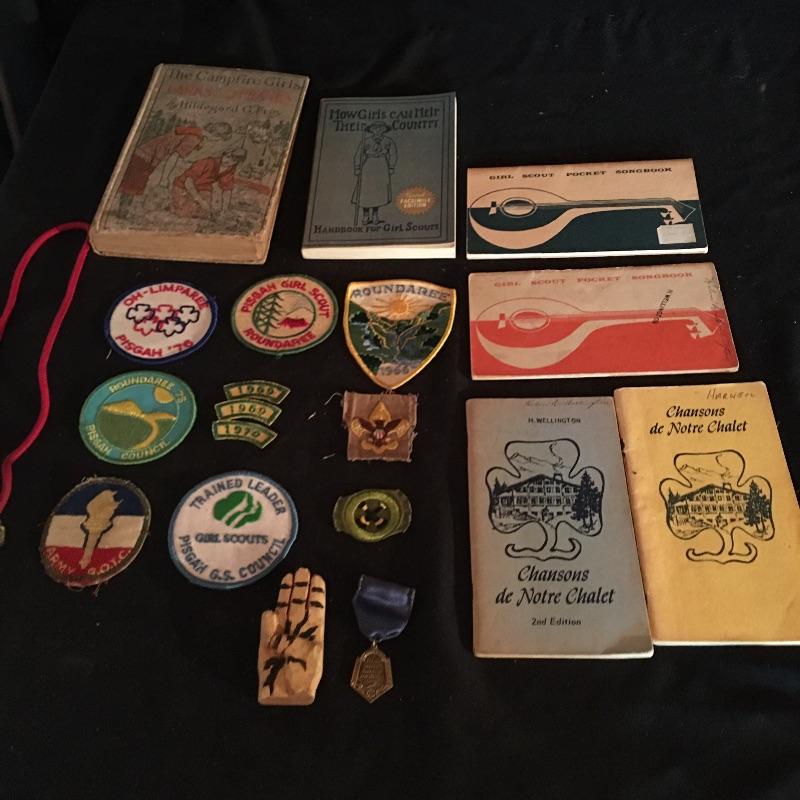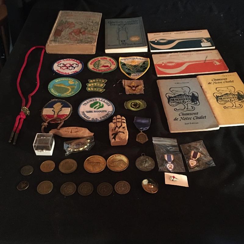 This lot includes Girl Scout badges, songbooks Bolo tie and handbook. Also includes The Campfire Girl Book, Marine coins, Worlds Fair coin, Pope Francis coin and more.