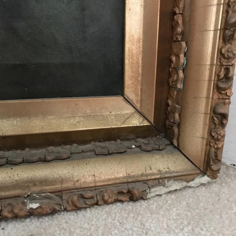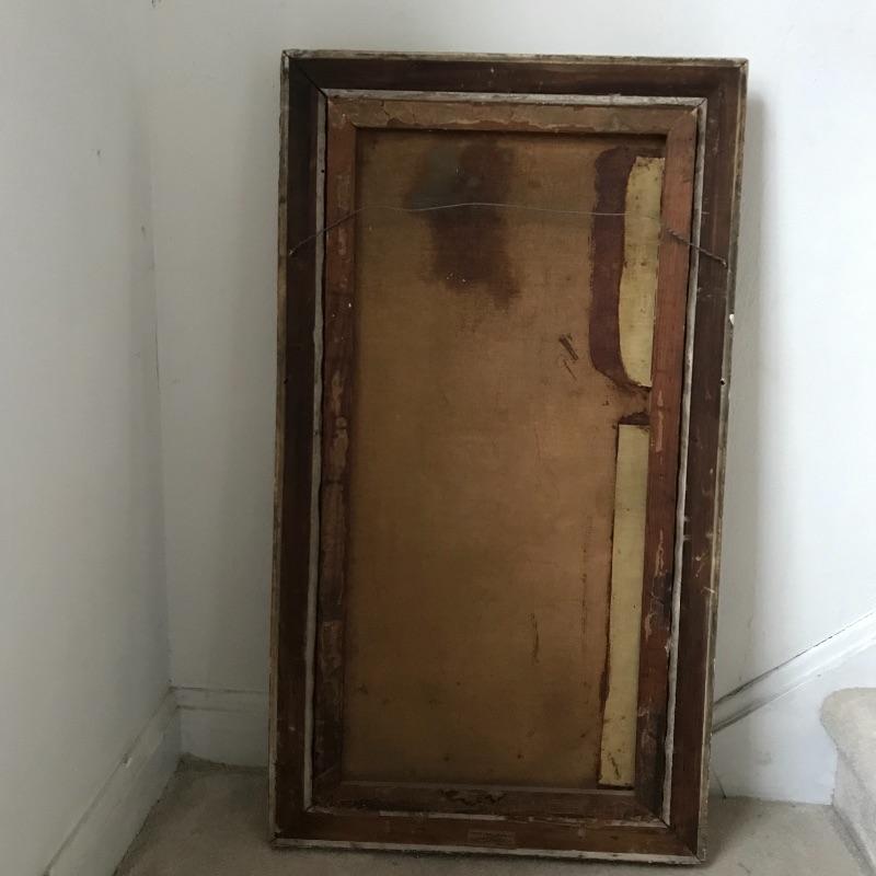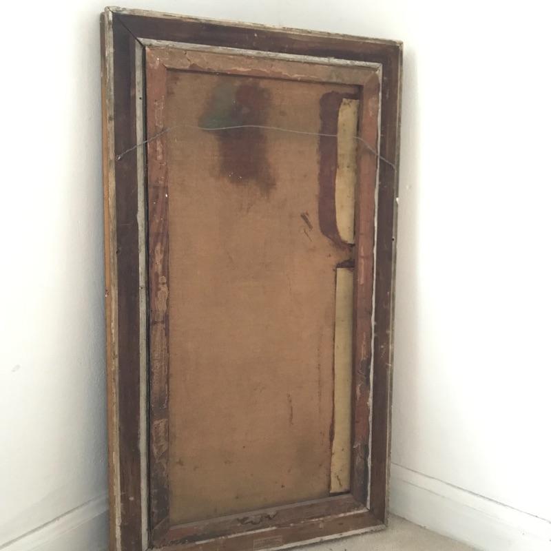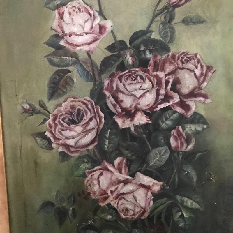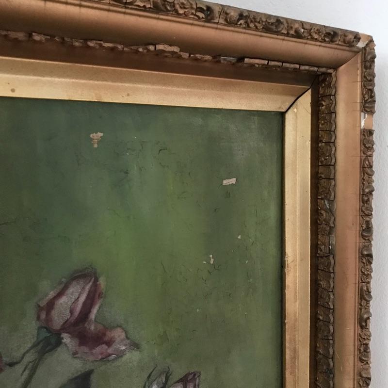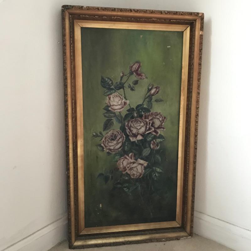Stunning dark yet bright rose painting on canvas. Albeit the art is roses, it definitely envokes emotion. The art is stretched and stapled into a vintage gold painted wood frame. Artist’s signature was not located and there are some blemishes noted in photos. Frame measures approximately 23.5” x 42”. Shipping available, please call UPS for a shipping quote prior to bidding.