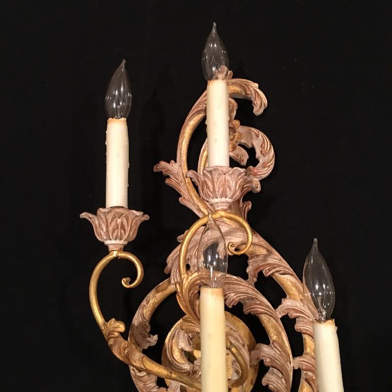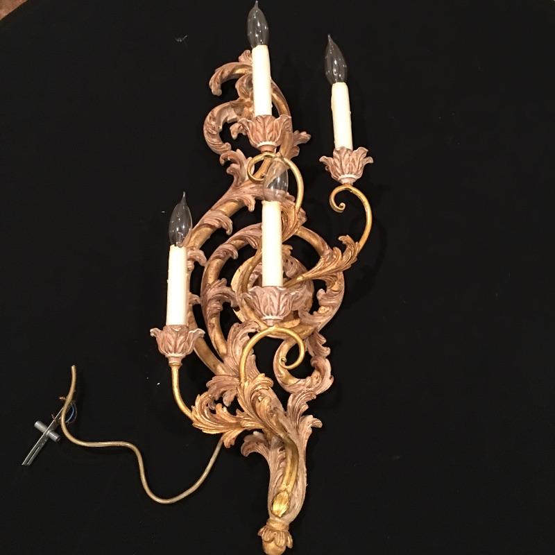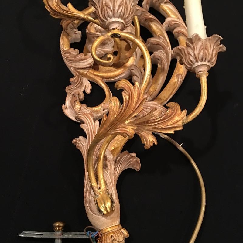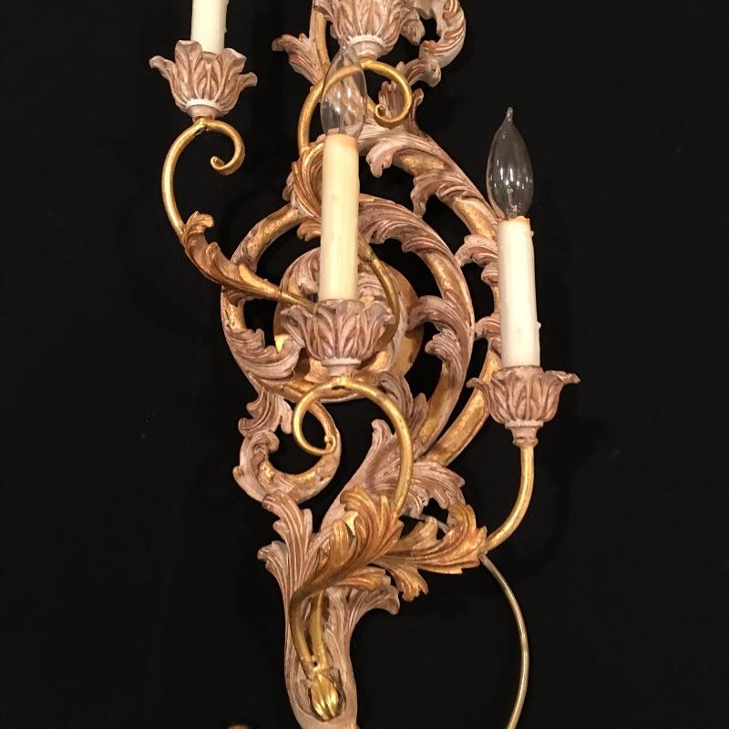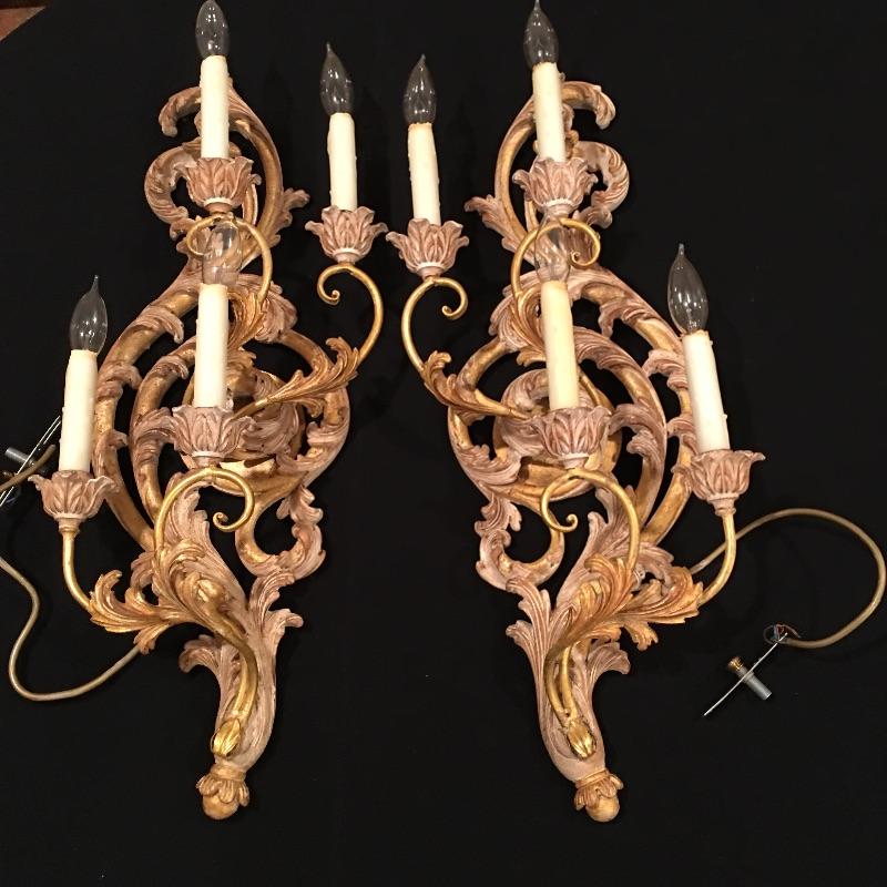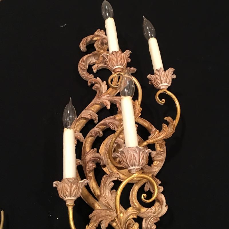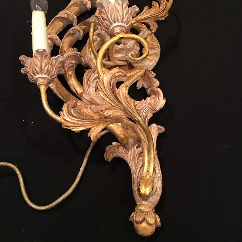 Florentine Hand carved wood sconces with gilded gold. Each sconce measures 11” x 29” x 7”.
