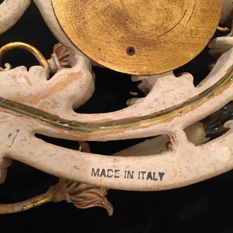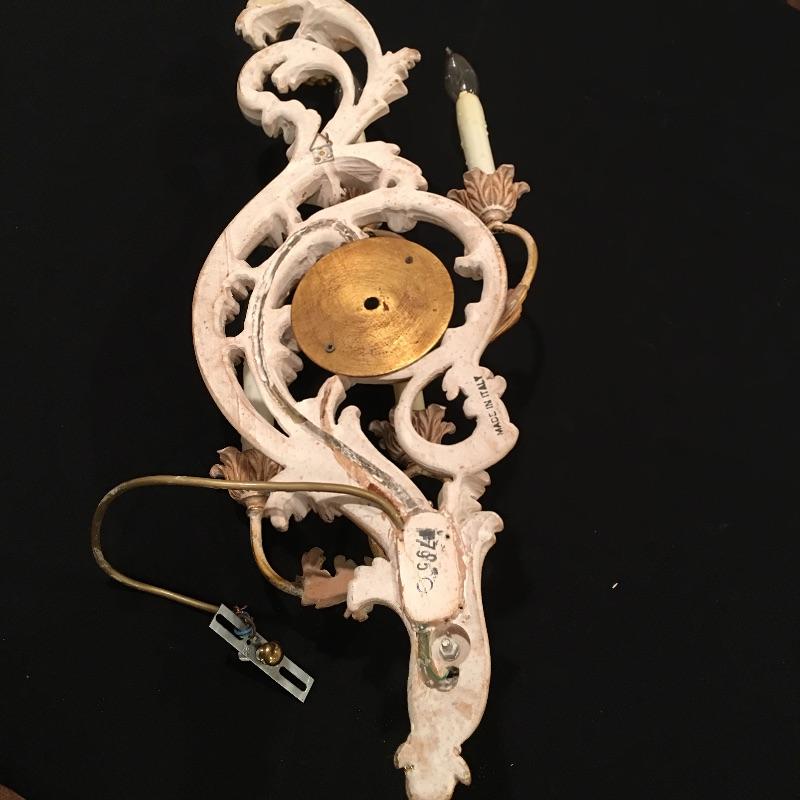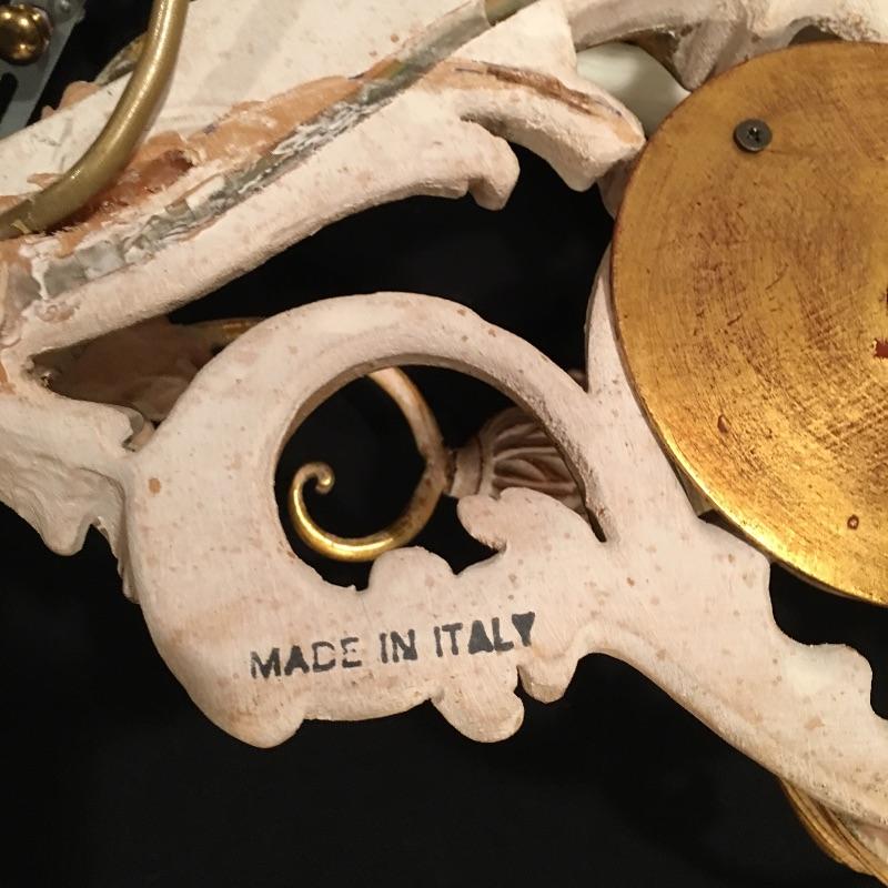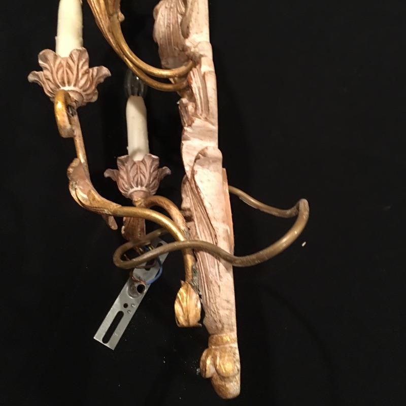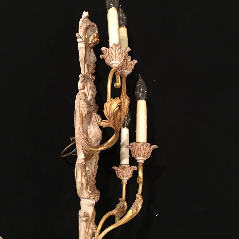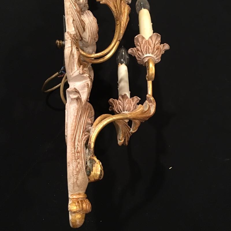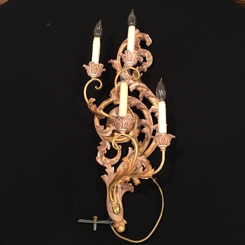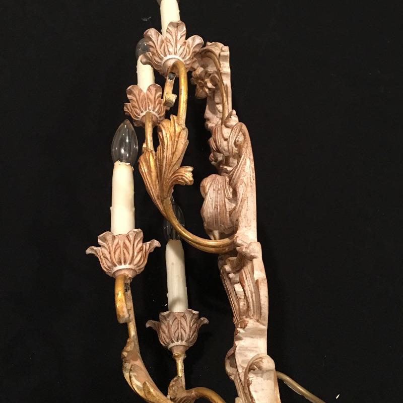 Florentine Hand carved wood sconces with gilded gold. Each sconce measures 11” x 29” x 7”.