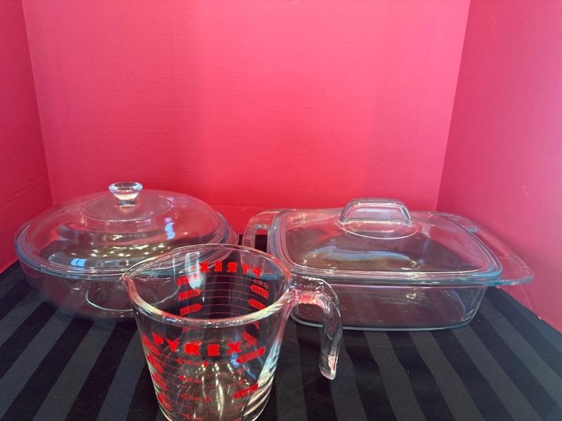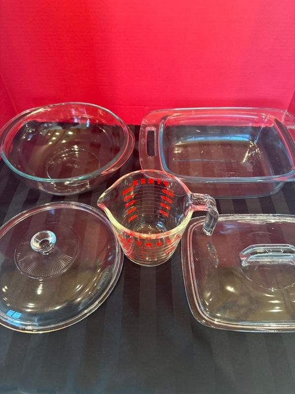 Lot 184 Pyrex Casseroles with lids 1 measuring glass cup