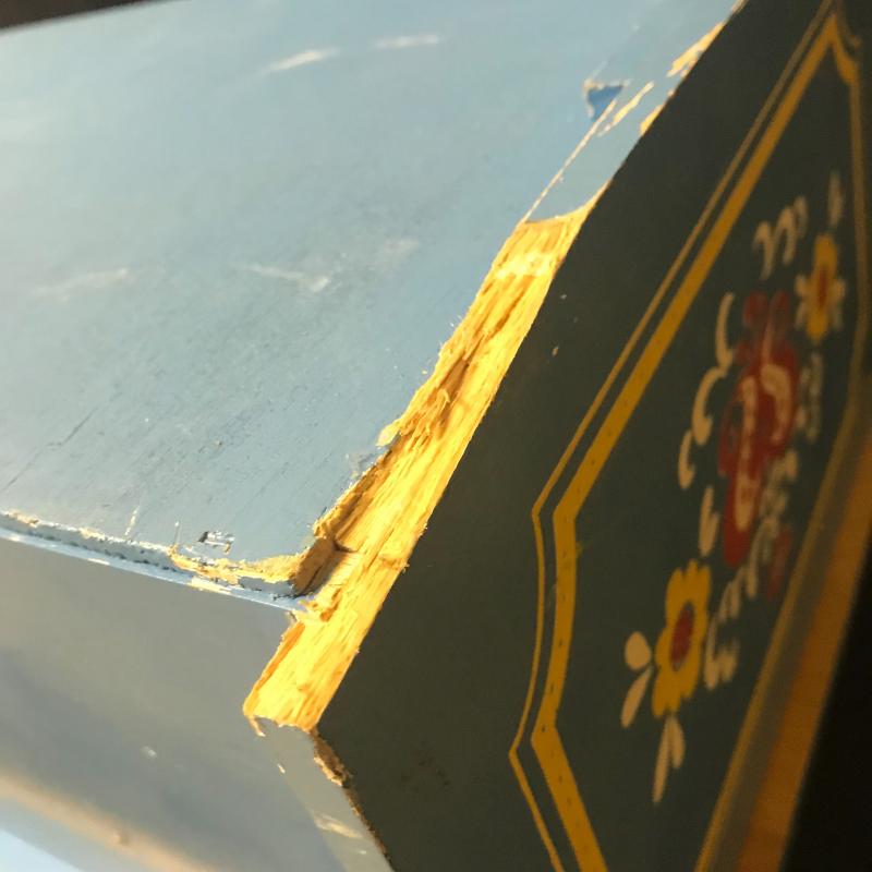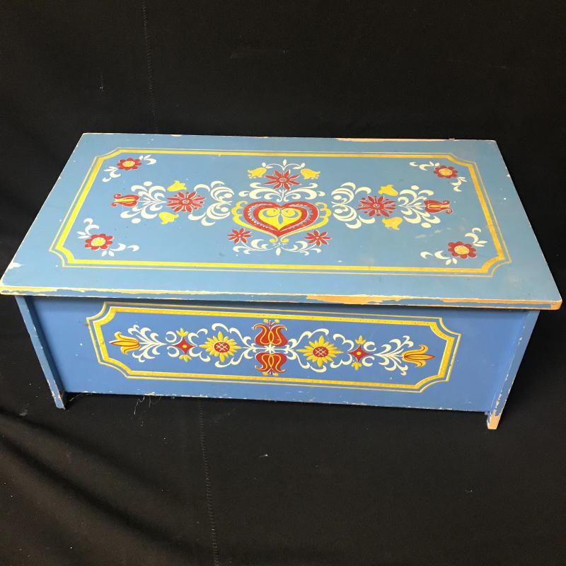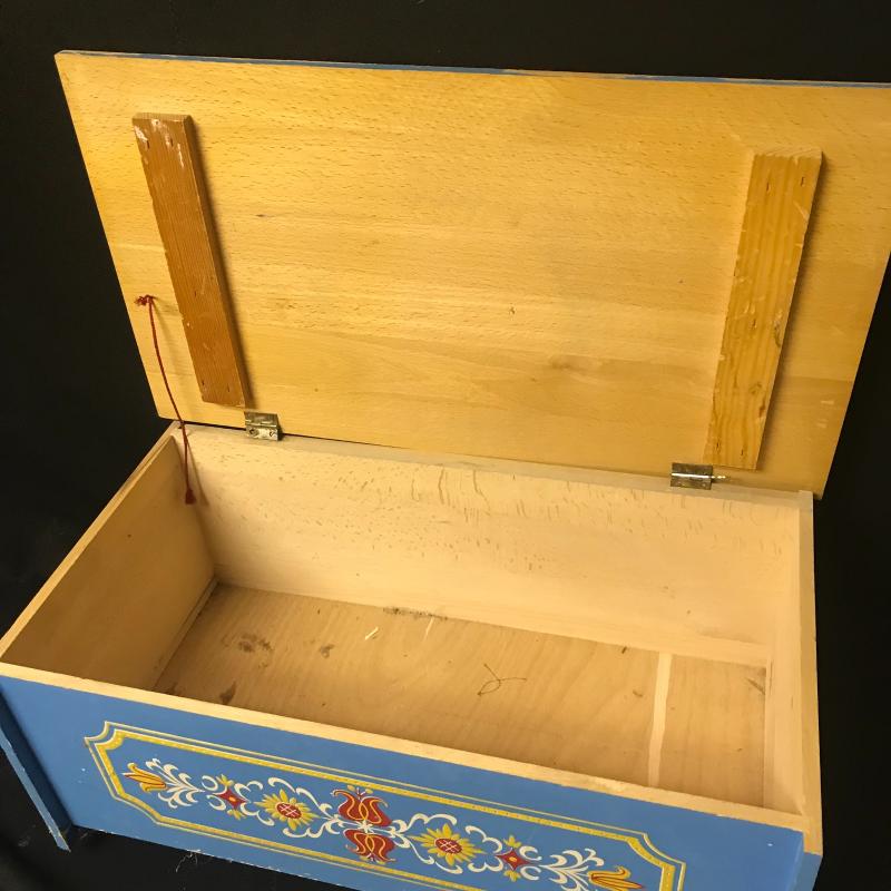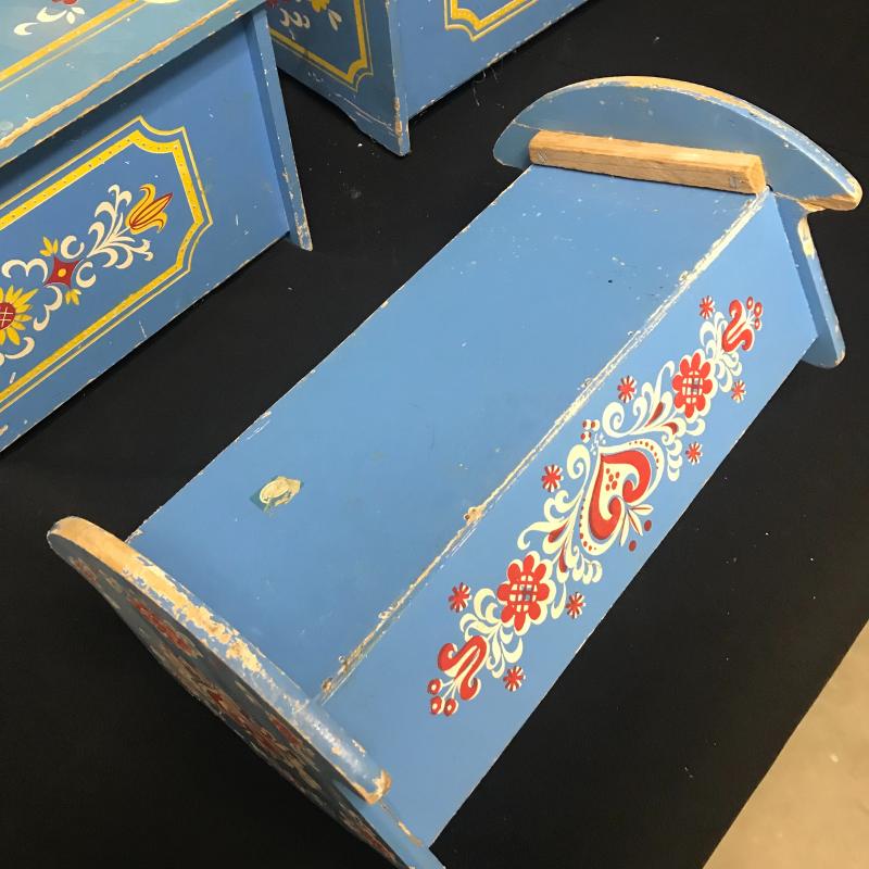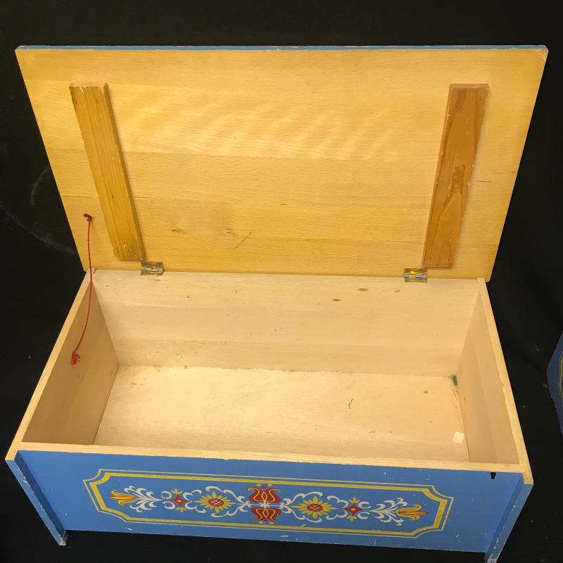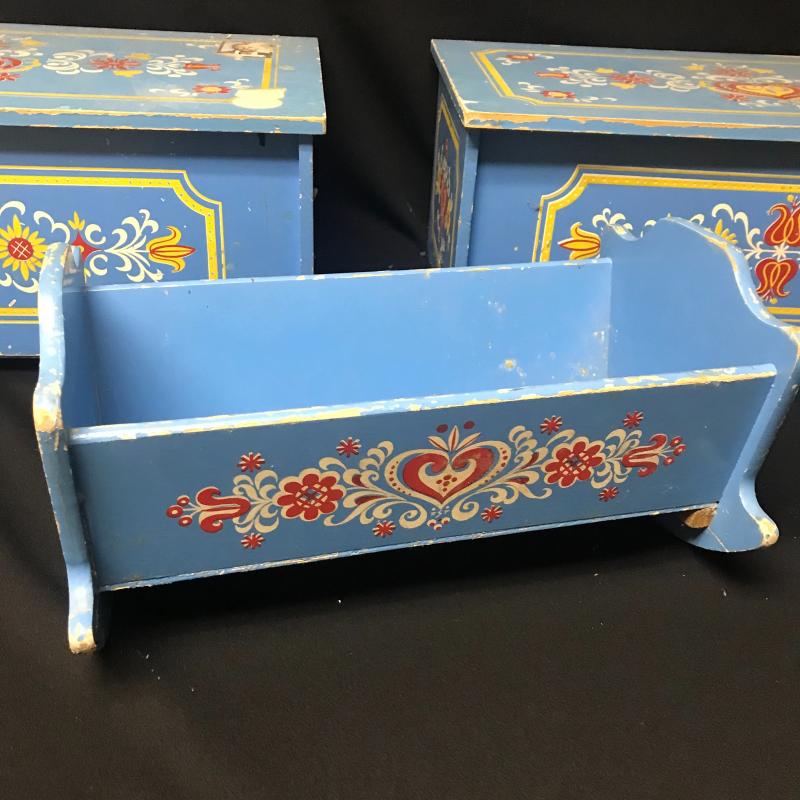 Two wood toy boxes measure 22” x12” x9” each. One has stickers on it and the other has a broken edge and foot. Matching Doll Crib is in good condition and measures 14.5” x9.5” x8”. Local pick up only.