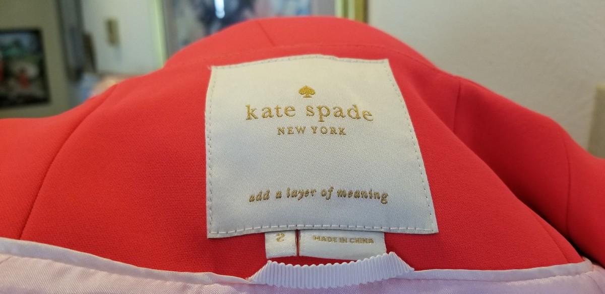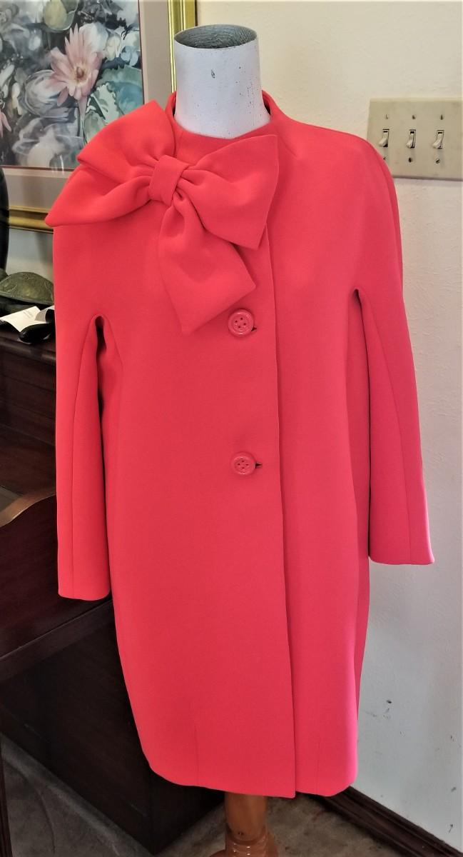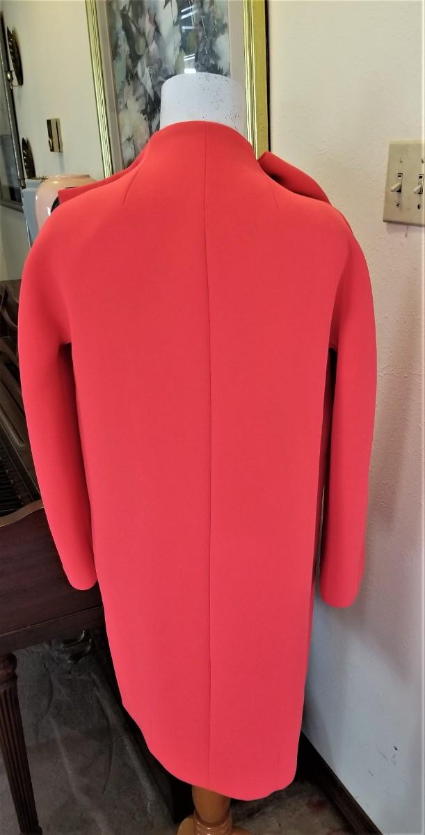 This KATE SPADE coat is simply Yummy - bright coral color with signature bow. Size 2 - I think it would fit up to a 6. 13" across at the shoulders, 34.5" long, sleeves are 21" long. I could only find one VERY SMALL spot underneath the placket - there is a photo. We have not attempted to clean. This coat was over 300.00 retail.