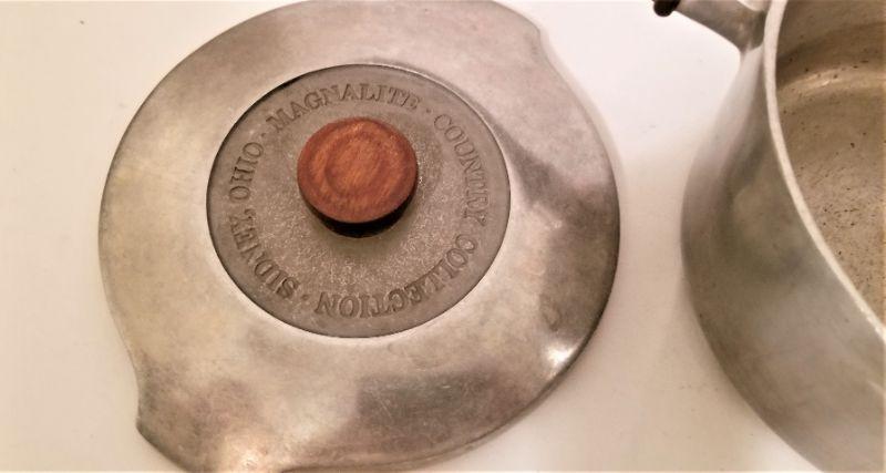 Magnalite pot with lit - wooden handle. 6" tall, Whole thing is 15" long. 9" x 8" across. Good, usable condition.