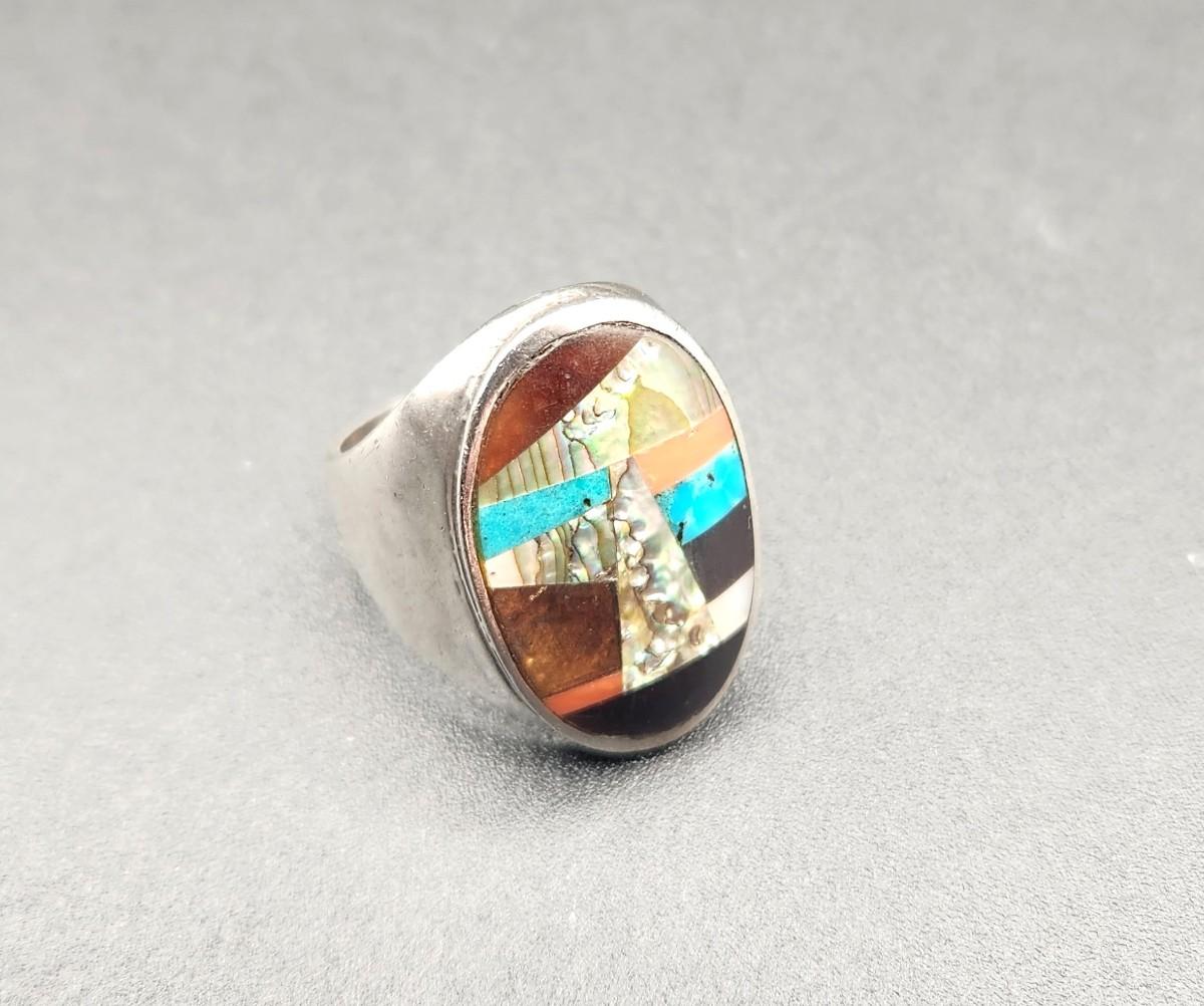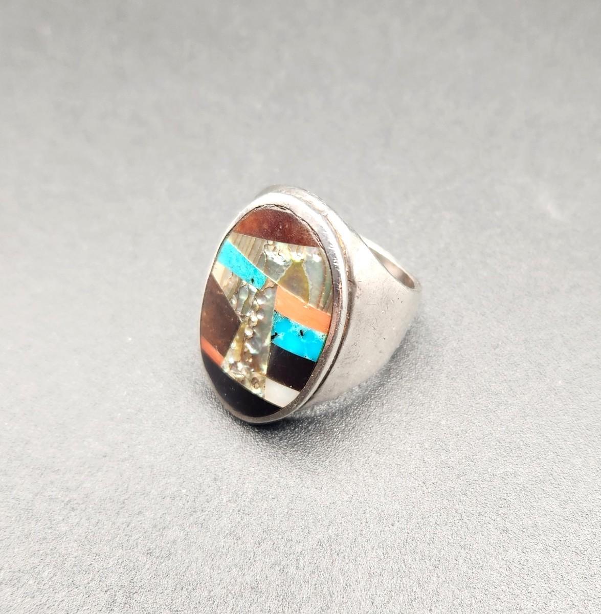 Lot #184 Men's Sterling Silver, Turquoise, and Abalone Ring, size 9