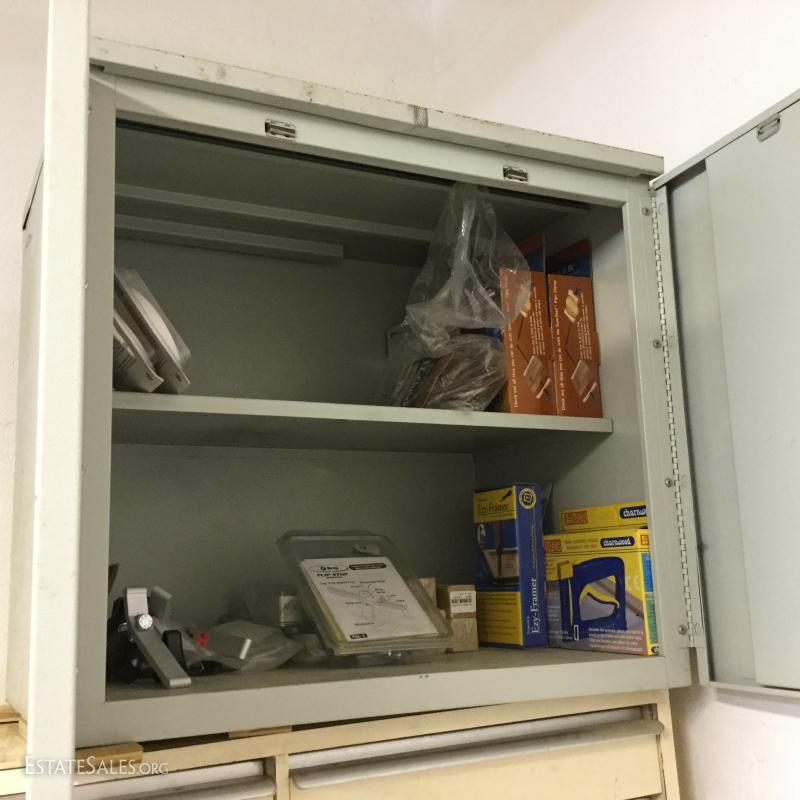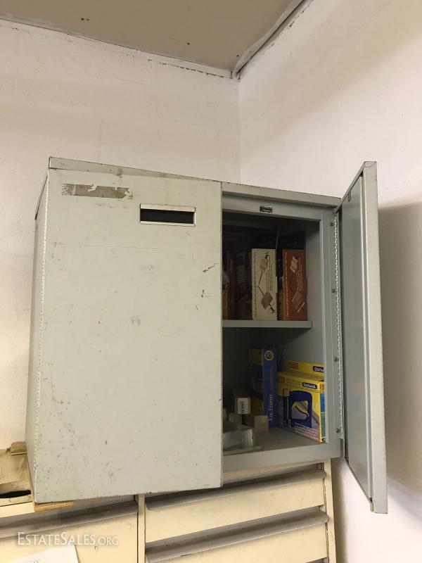 Metal Storage Cabinet is 25.5"l x 18"w x 23"h. Includes contents. See photos.