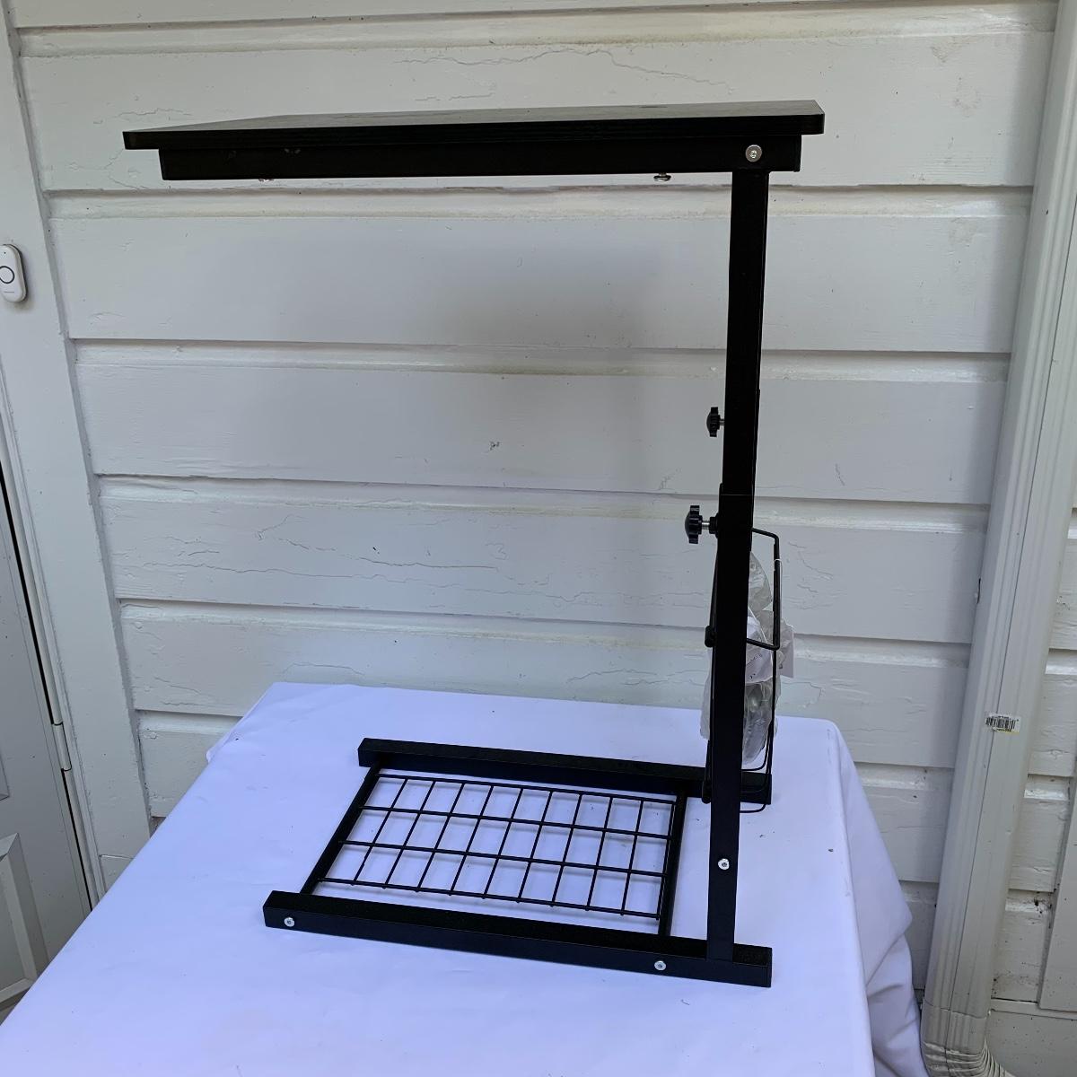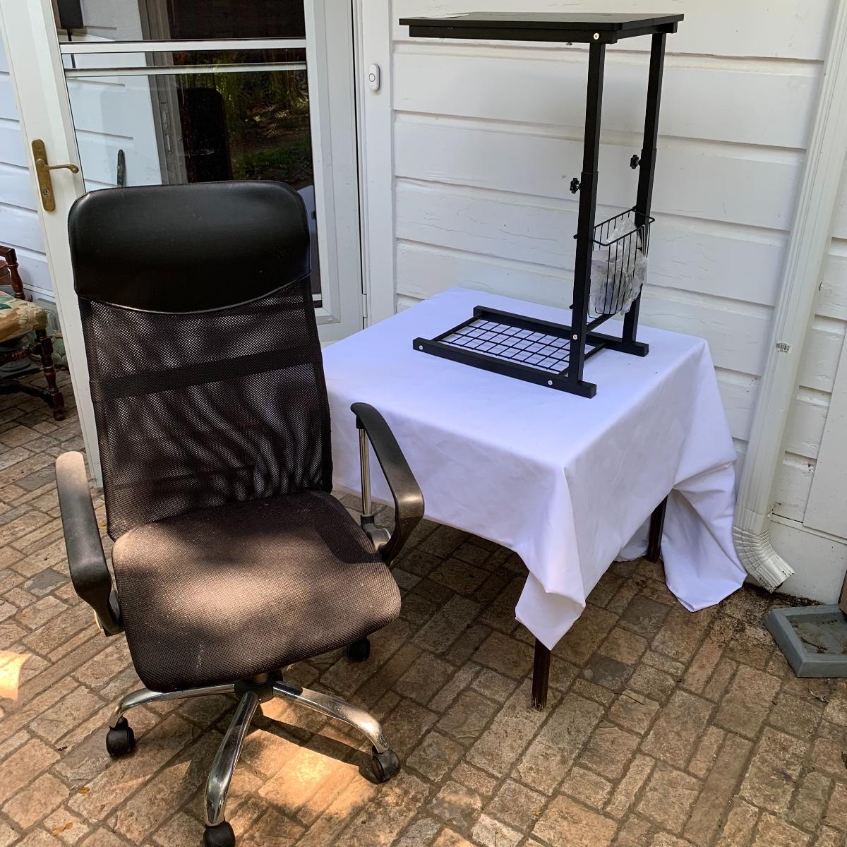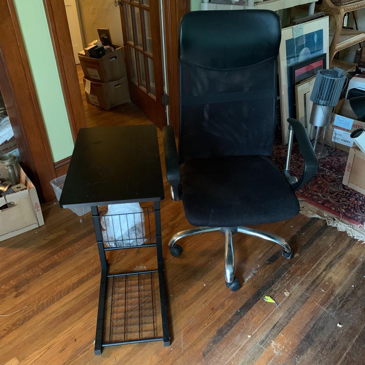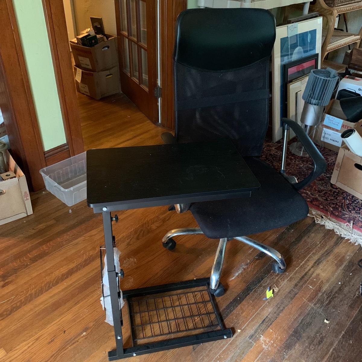 This lot includes an office chair and a small side desk. The chair is on four wheels. It has a mesh back and plastic headrest. It’s height is adjustable. At its tallest setting the seat height is 19”. At its lowest setting the seat height is 16”. It has two hard plastic armrests. The distance from the outer edge of one armrest to the other is 24.5”. At its current setting the chair measures 25” x 21” x 43”. The chair has gathered a bit of dust over the years and could benefit from a cleaning. The small desk is a Micoe brand side desk. It’s height is adjustable and it comes with four wheels that are not currently attached. An installation guide is included. This desk is great for someone who doesn’t have a lot of room for a large desk but needs a work space. If you’re sitting in the office chair you can pull the desk right over your lap to work on. And it has a convenient metal wire bast to keep things close and organized. The surface of the desk measures 12” x 20”. Local pickup only.