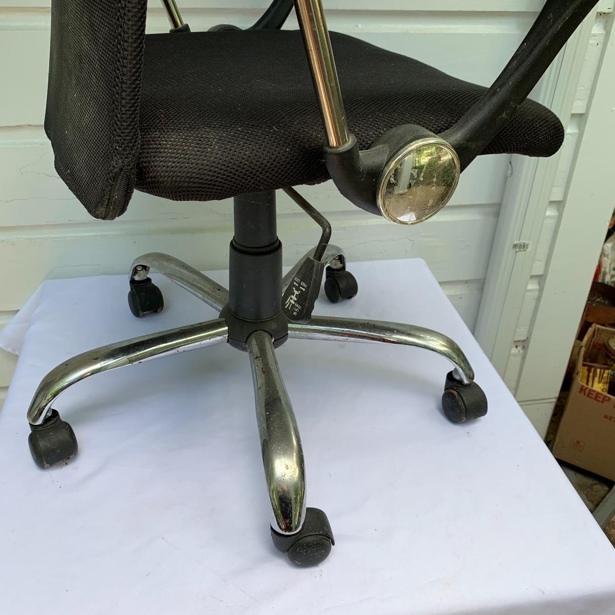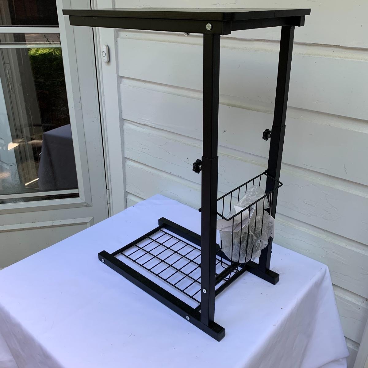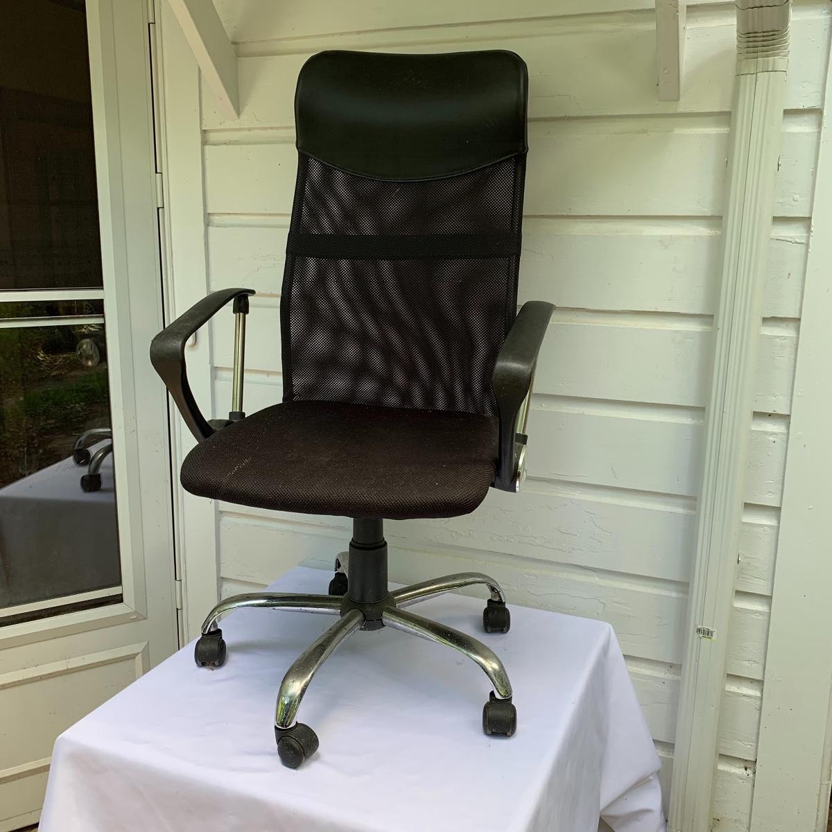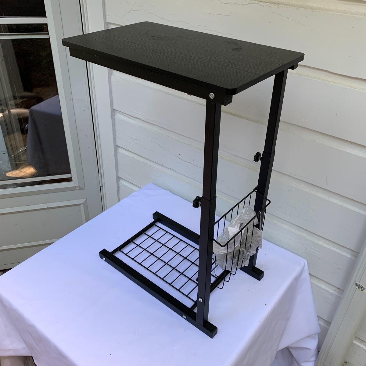 This lot includes an office chair and a small side desk. The chair is on four wheels. It has a mesh back and plastic headrest. It’s height is adjustable. At its tallest setting the seat height is 19”. At its lowest setting the seat height is 16”. It has two hard plastic armrests. The distance from the outer edge of one armrest to the other is 24.5”. At its current setting the chair measures 25” x 21” x 43”. The chair has gathered a bit of dust over the years and could benefit from a cleaning. The small desk is a Micoe brand side desk. It’s height is adjustable and it comes with four wheels that are not currently attached. An installation guide is included. This desk is great for someone who doesn’t have a lot of room for a large desk but needs a work space. If you’re sitting in the office chair you can pull the desk right over your lap to work on. And it has a convenient metal wire bast to keep things close and organized. The surface of the desk measures 12” x 20”. Local pickup only.