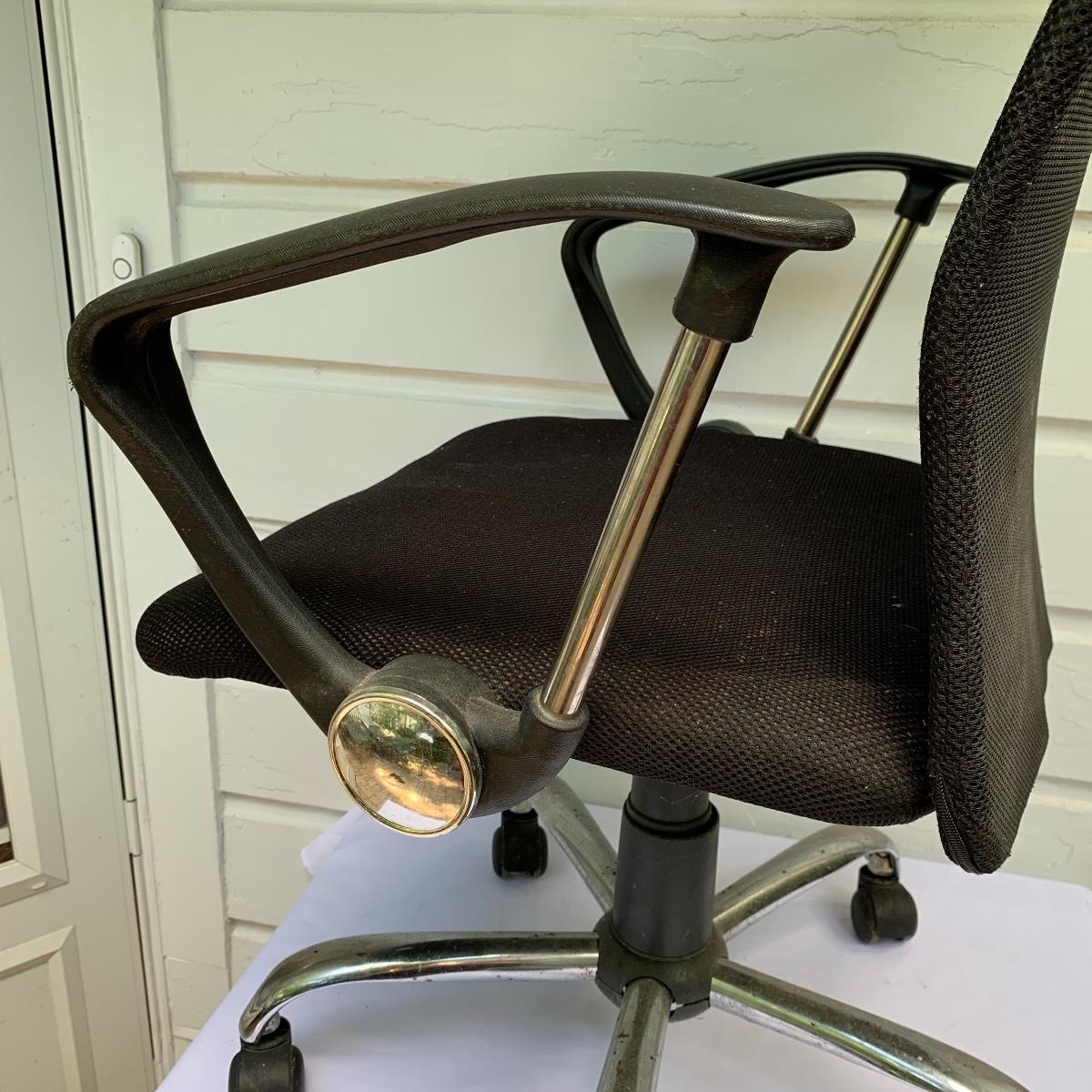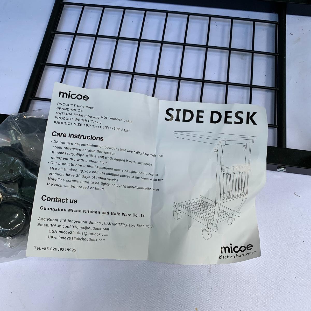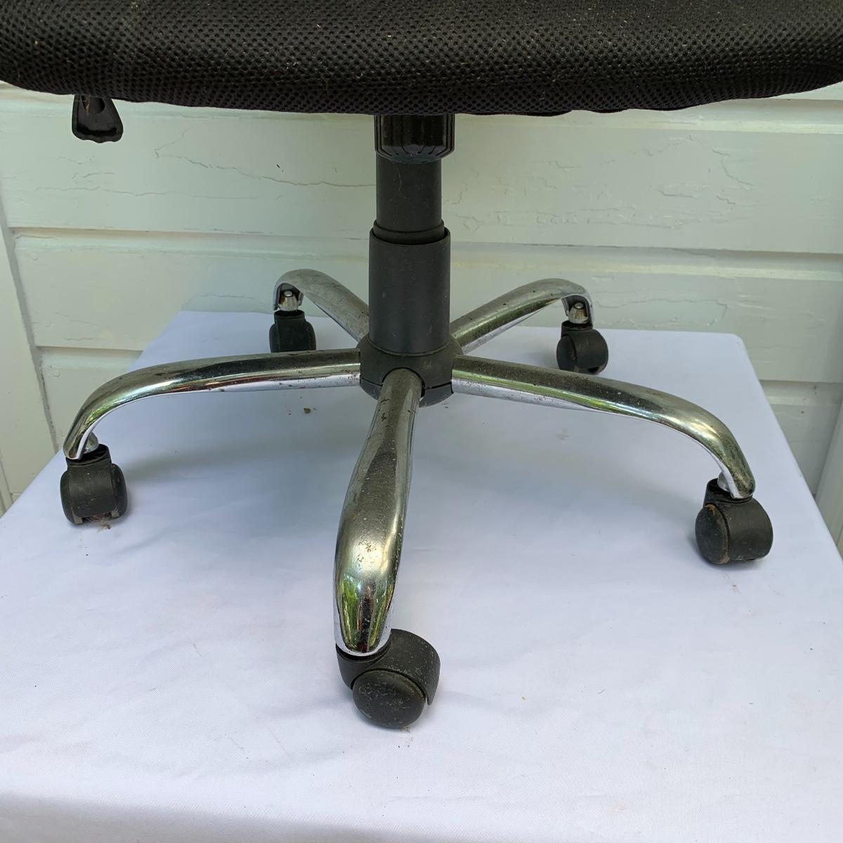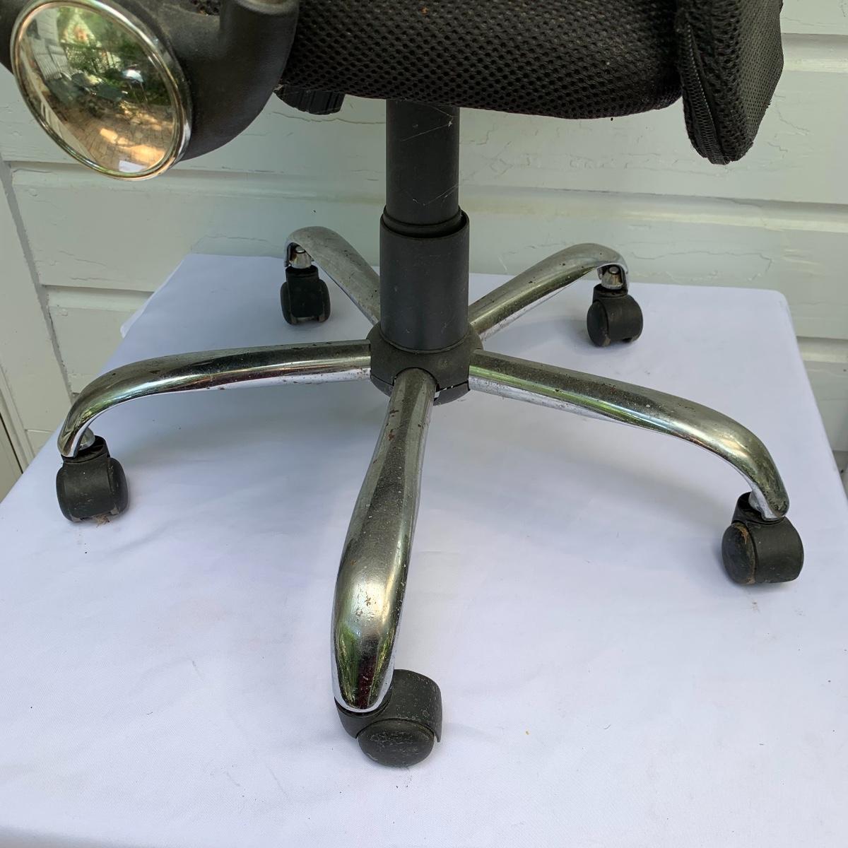 This lot includes an office chair and a small side desk. The chair is on four wheels. It has a mesh back and plastic headrest. It’s height is adjustable. At its tallest setting the seat height is 19”. At its lowest setting the seat height is 16”. It has two hard plastic armrests. The distance from the outer edge of one armrest to the other is 24.5”. At its current setting the chair measures 25” x 21” x 43”. The chair has gathered a bit of dust over the years and could benefit from a cleaning. The small desk is a Micoe brand side desk. It’s height is adjustable and it comes with four wheels that are not currently attached. An installation guide is included. This desk is great for someone who doesn’t have a lot of room for a large desk but needs a work space. If you’re sitting in the office chair you can pull the desk right over your lap to work on. And it has a convenient metal wire bast to keep things close and organized. The surface of the desk measures 12” x 20”. Local pickup only.