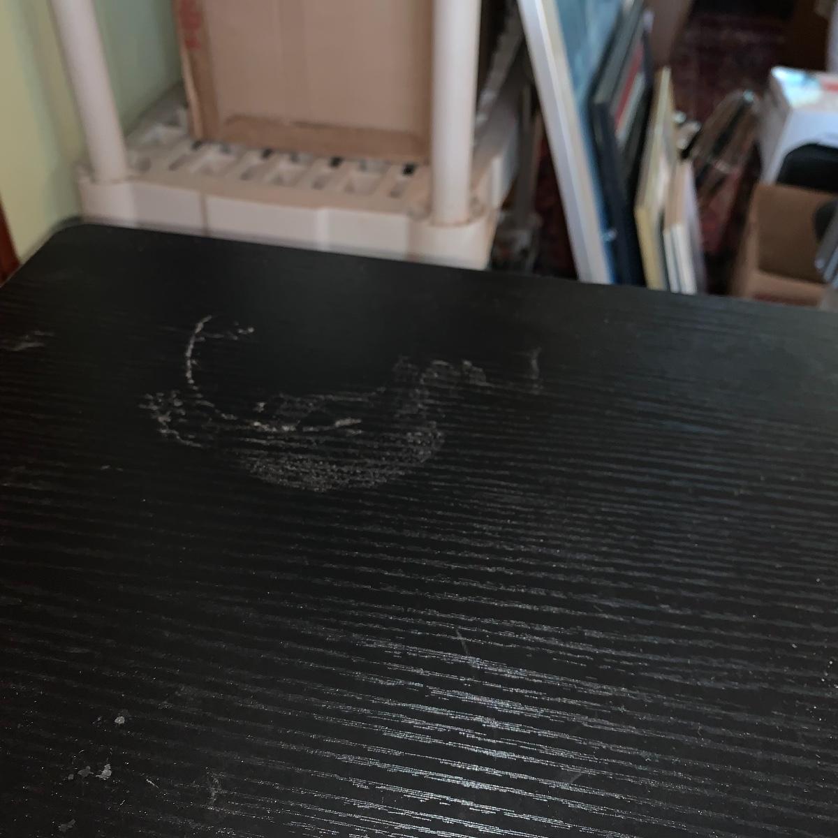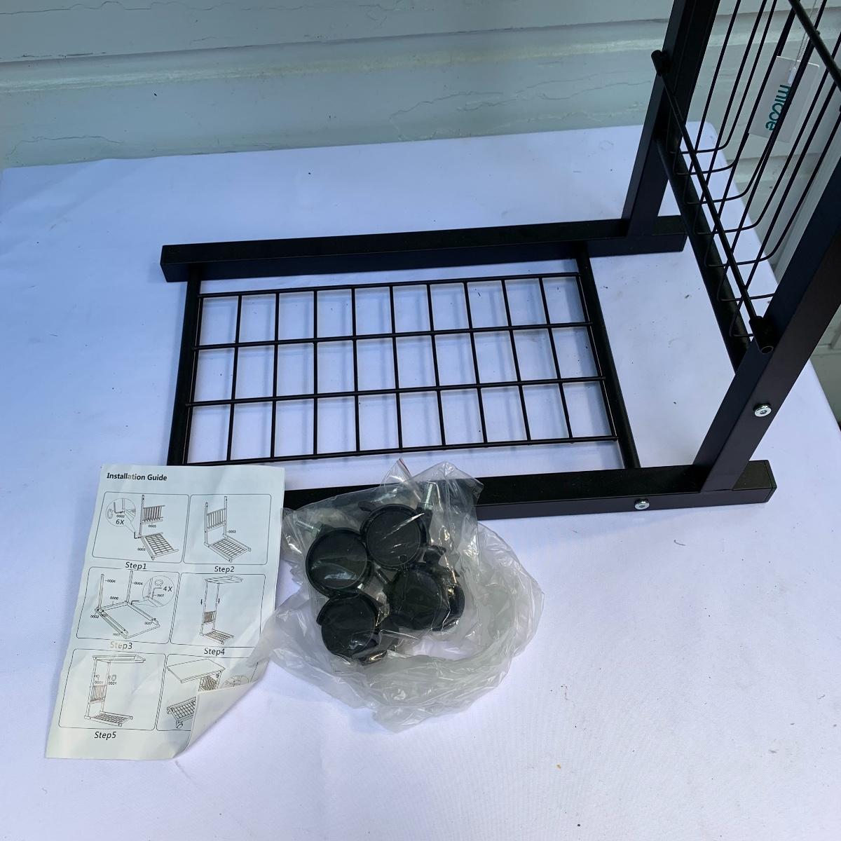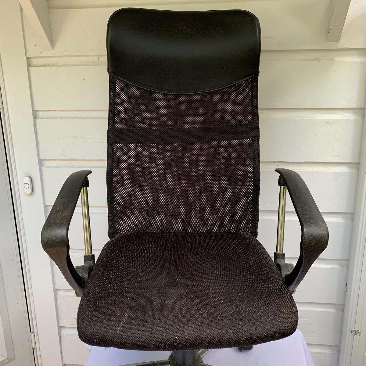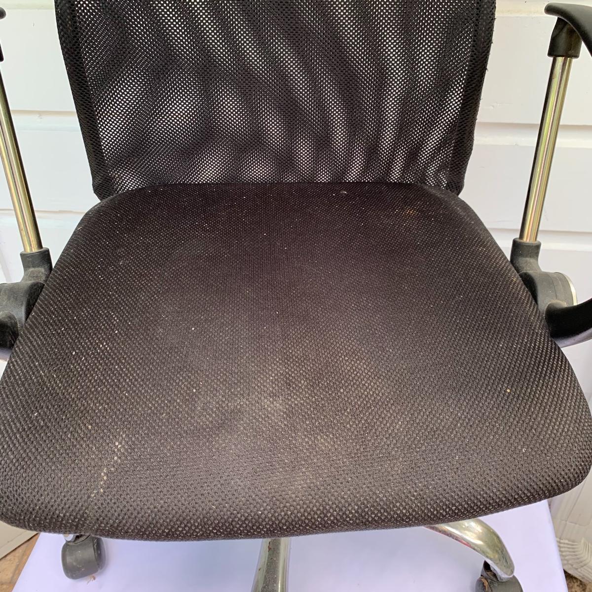 This lot includes an office chair and a small side desk. The chair is on four wheels. It has a mesh back and plastic headrest. It’s height is adjustable. At its tallest setting the seat height is 19”. At its lowest setting the seat height is 16”. It has two hard plastic armrests. The distance from the outer edge of one armrest to the other is 24.5”. At its current setting the chair measures 25” x 21” x 43”. The chair has gathered a bit of dust over the years and could benefit from a cleaning. The small desk is a Micoe brand side desk. It’s height is adjustable and it comes with four wheels that are not currently attached. An installation guide is included. This desk is great for someone who doesn’t have a lot of room for a large desk but needs a work space. If you’re sitting in the office chair you can pull the desk right over your lap to work on. And it has a convenient metal wire bast to keep things close and organized. The surface of the desk measures 12” x 20”. Local pickup only.