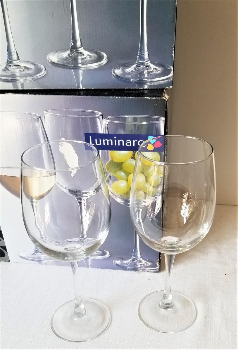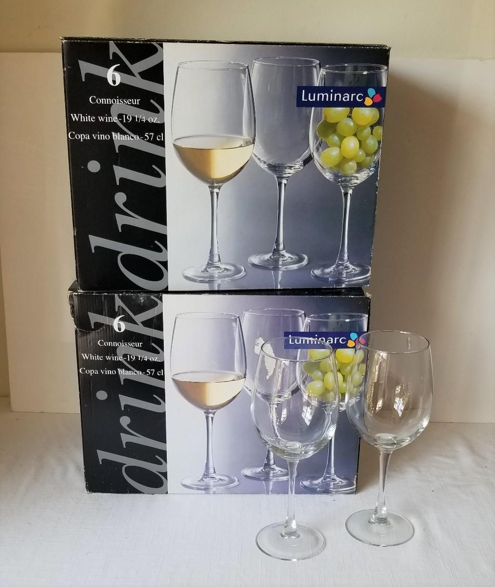 These two boxes contain a total of 12 crystal Luminarc White Wine Glasses - each holds a generous pour of 19.25 ounces - they all stand 9" tall. Good, gently used condition.