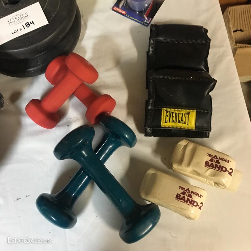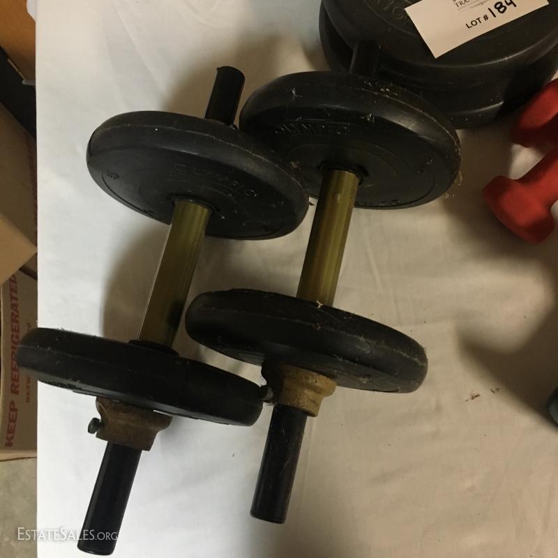 Olympic weights 4 5lb. and 2 10lb, with 3 bars.