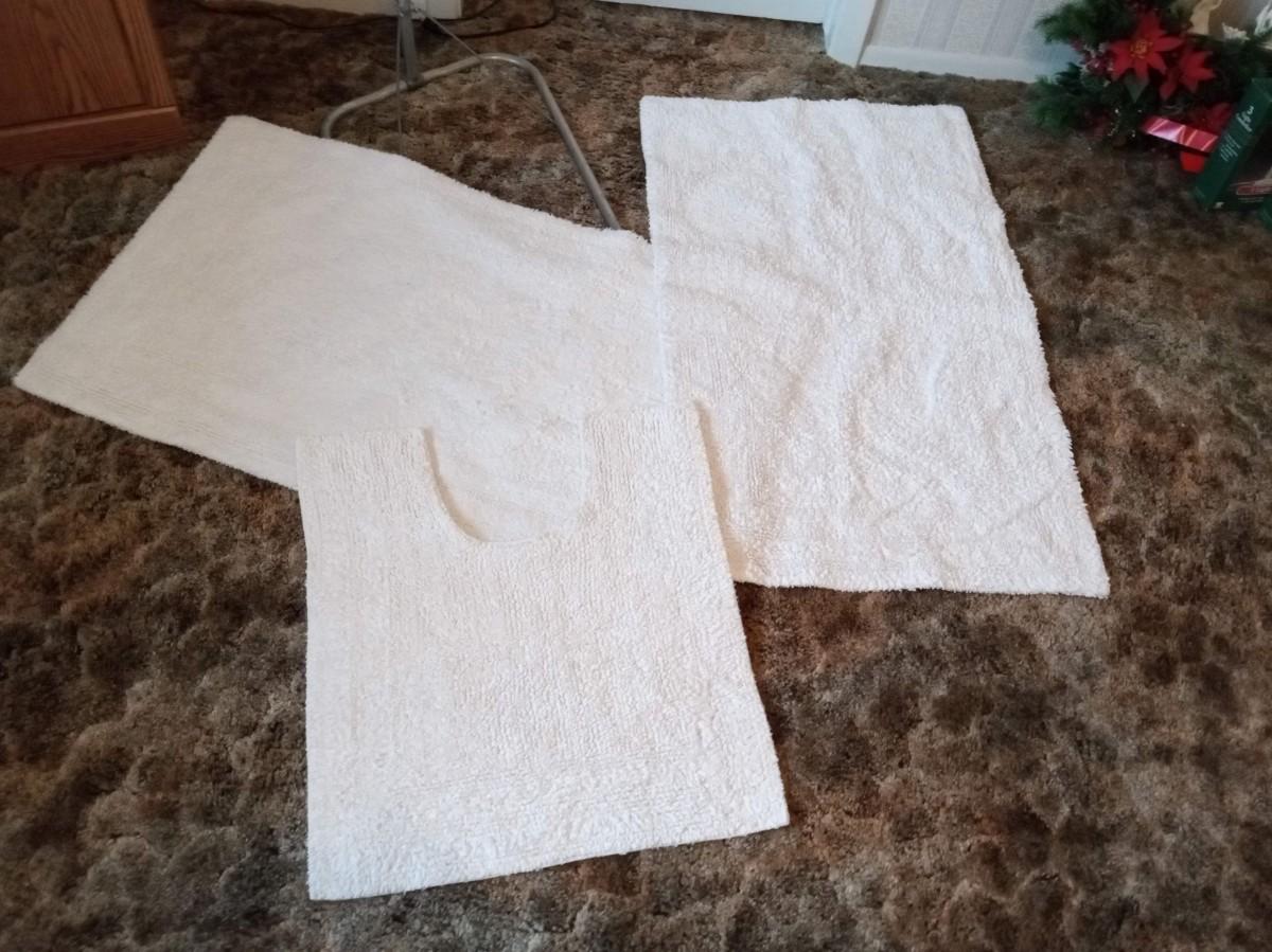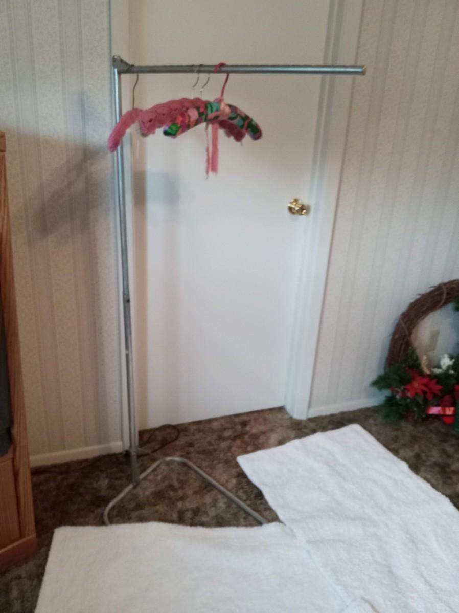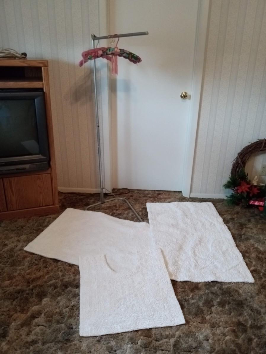 LOT 184 THREE THROW RUGS AND A FOLDABLE CLOTHES RACK