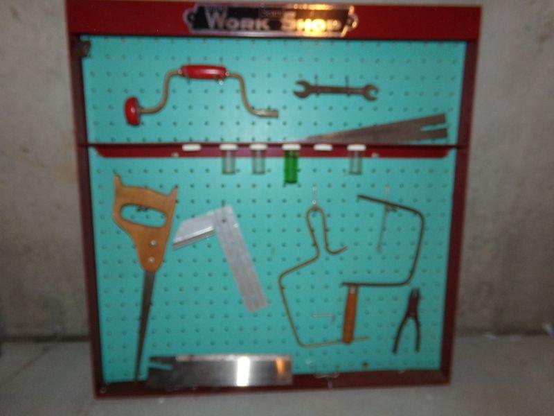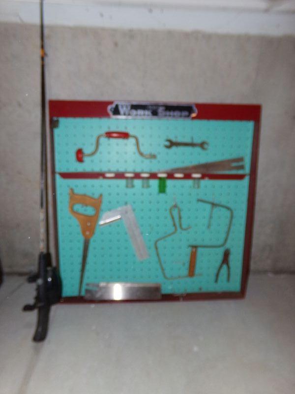 TOOLS DISPLAYED ON A PEGBOARD FOR AN OLDER KID OR BEGINNER SQUARE, HAND SAW, LEVEL AND MORE, AND FISHING POLE