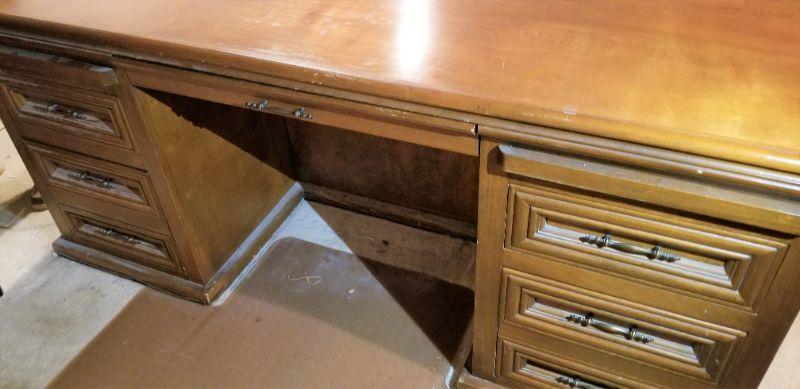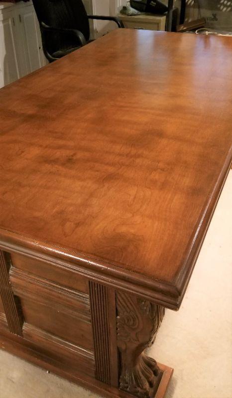 Probably the oddest item in the sale - large "executive" desk - 5 drawers - features carved lions and a long taxidermy scene (lighted) with quails in a rustic setting across the front. This baby is BIG and HEAVY. The top does come off. Anyone who purchases this is buying it WHERE IS and they have to move it with no help from us - it will likely need a professional mover. Taxidermy scene has about 7 quails and is in good condition. We found one or two places where there is a bit of scratching to the surface (on one side - pictured - minor). Top of the desk looks good. Measures 80" across, 41" deep, 31" tall. This is a big one. Absolutely no refunds for any reason - all sales final.