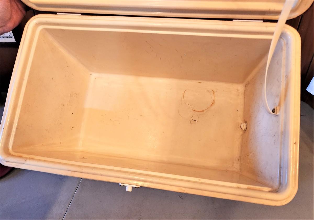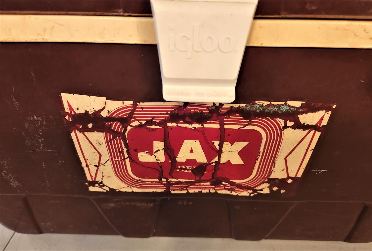 1970's vintage JAX Beer cooler by IGLOO - outside is rough, inside in pretty good vintage condition. 24" across, 15" wide, 14" tall. Note that one bit of the plastic trip at the top is missing. You also get the vintage JAX baseball cap. On this cooler please check all photos carefully.