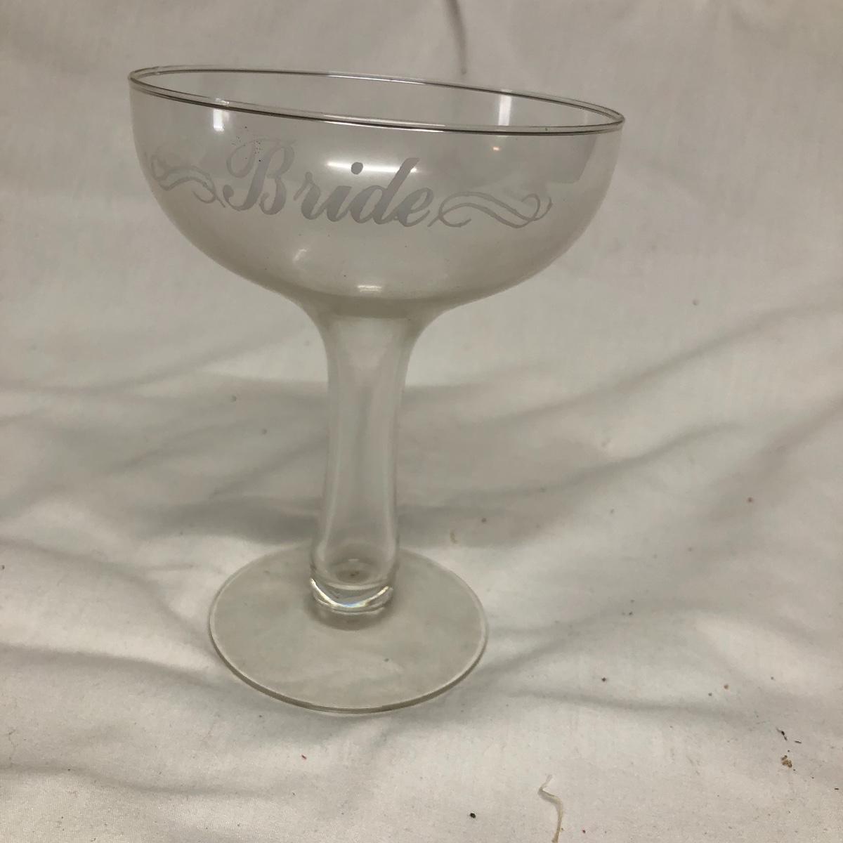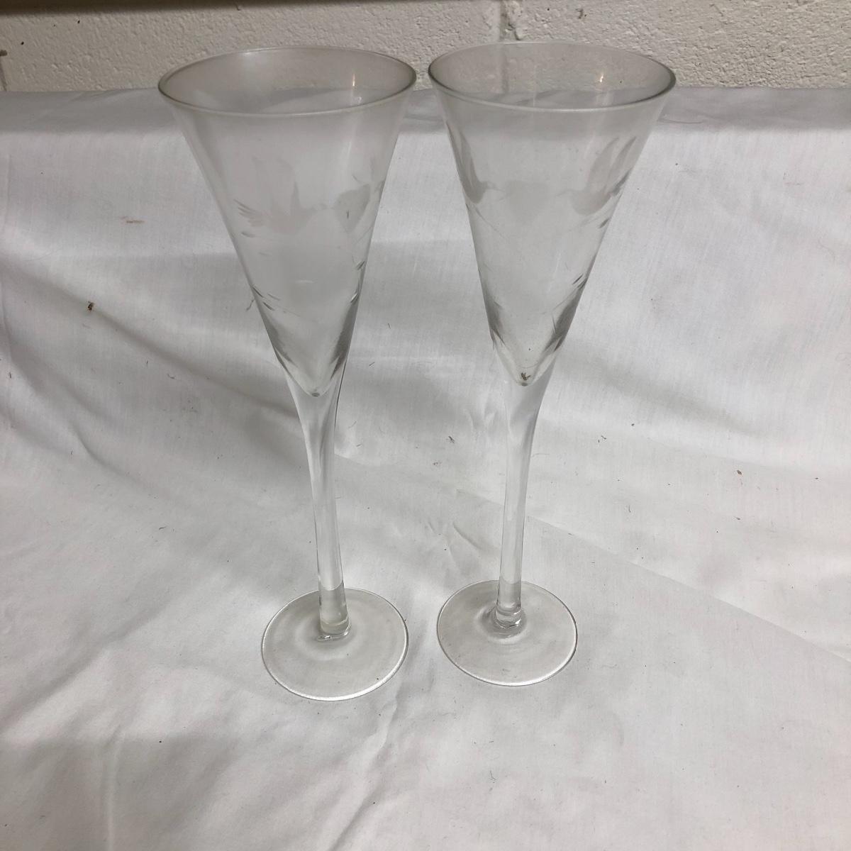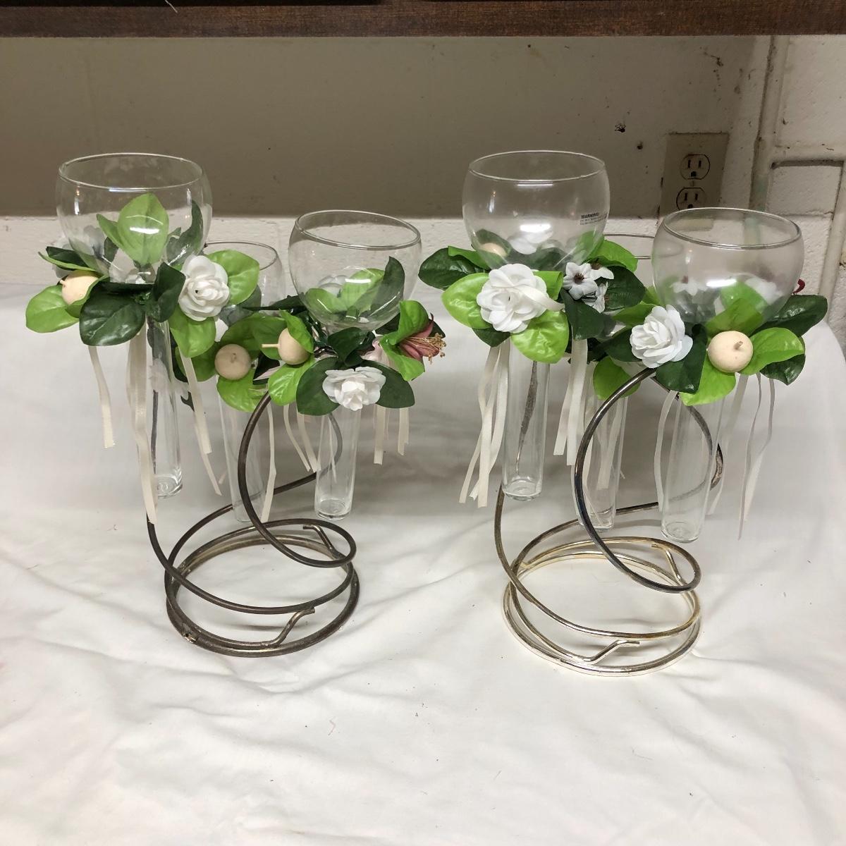 Lot includes two matching metal and glass candleholders, cake topper, two bride glasses, one groom glass, two etched glasses and two glass plates. Candleholders measure 7”D x 15” tall.
