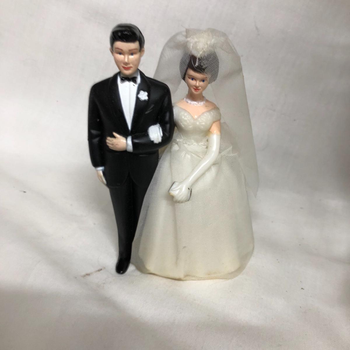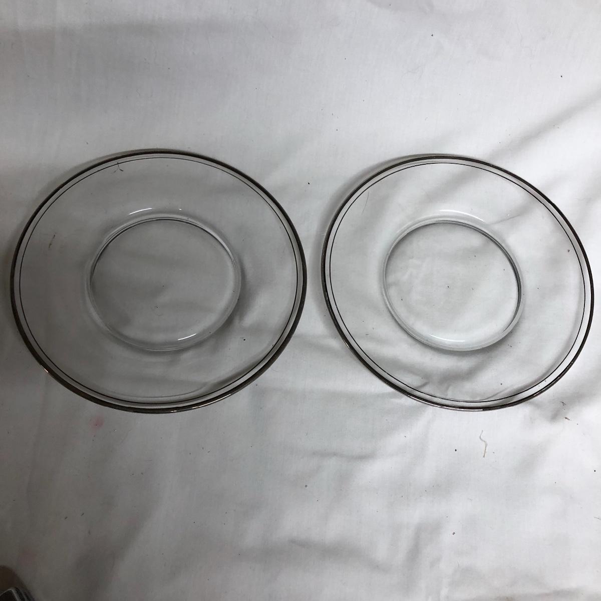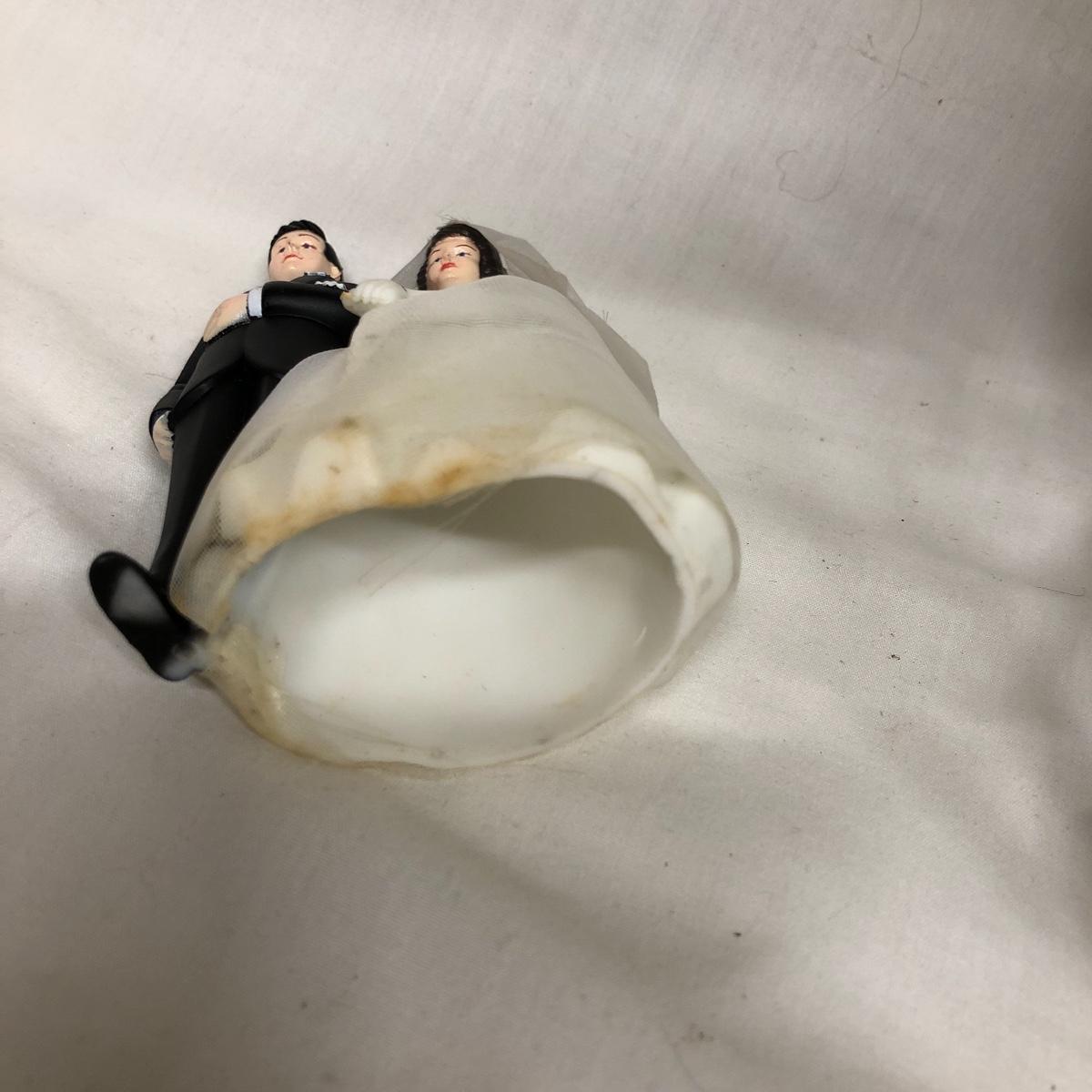 Lot includes two matching metal and glass candleholders, cake topper, two bride glasses, one groom glass, two etched glasses and two glass plates. Candleholders measure 7”D x 15” tall.