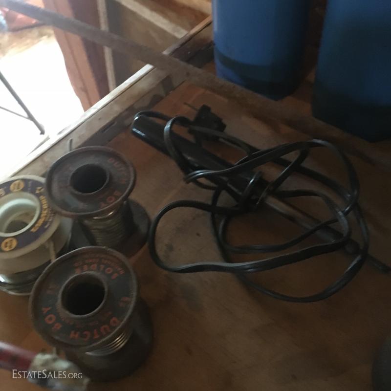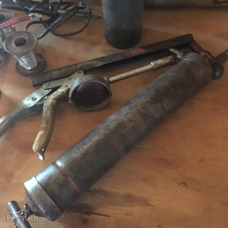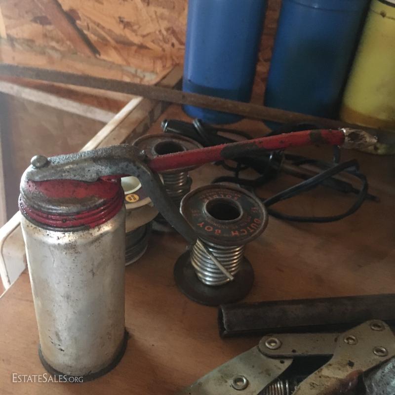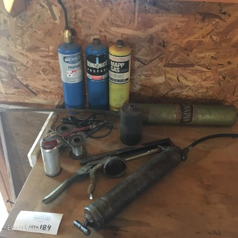 Small propane tanks (not full) and torch system, along with two greese pumps and duster and a welding/solder Dutch Boy..