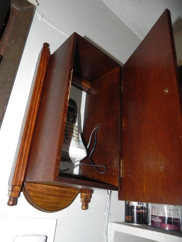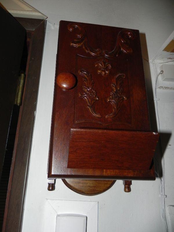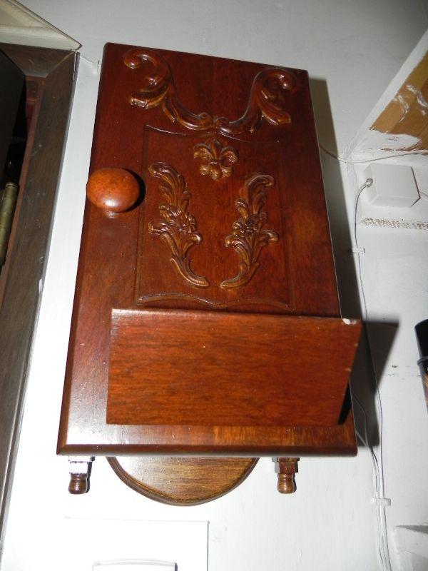 ANTIQUE BOX WITH HINGED DOOR TO COVER WALL PHONE. WHAT WILL YOU USE IT FOR?