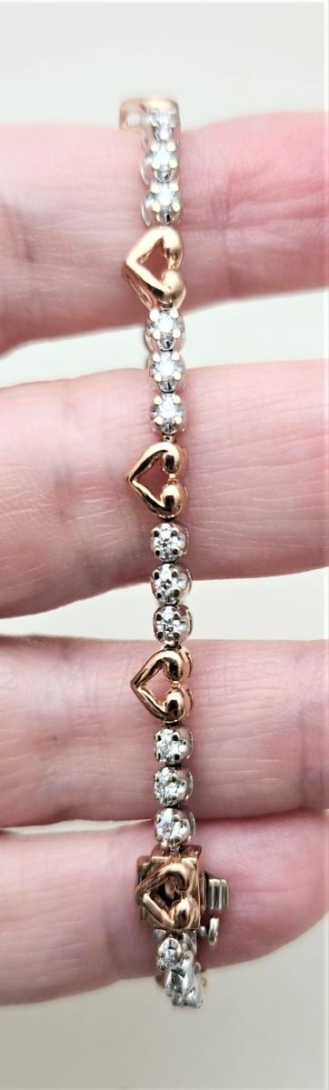 Something a little unusual - 14kt Rose and White Gold Heart Bracelet set with 33 small diamonds. 7" long, great condition. Good safety clasp. Opening bid is only a little able scrap value and will not be reduced.