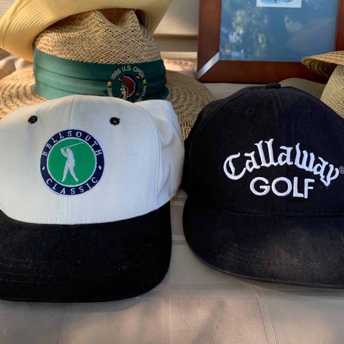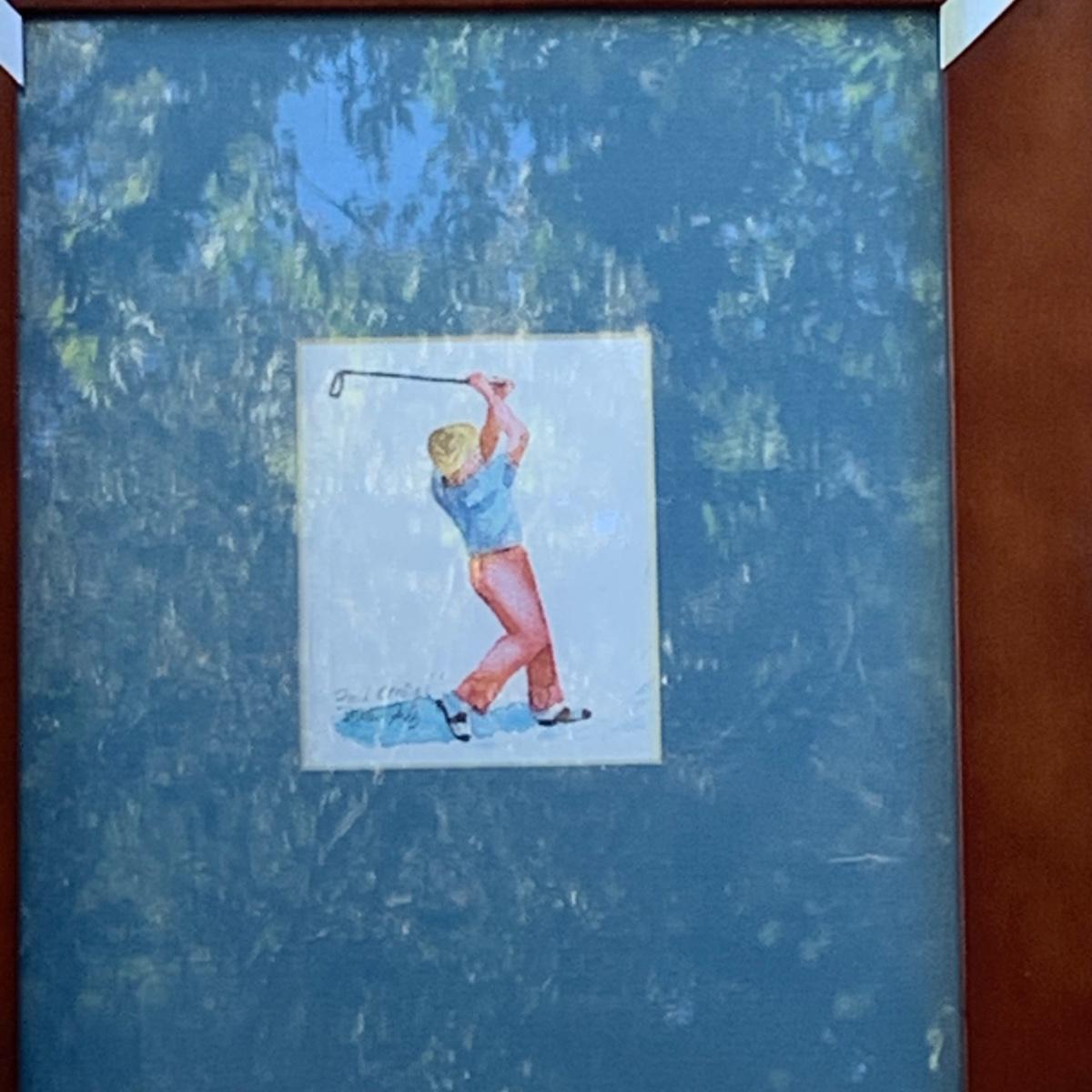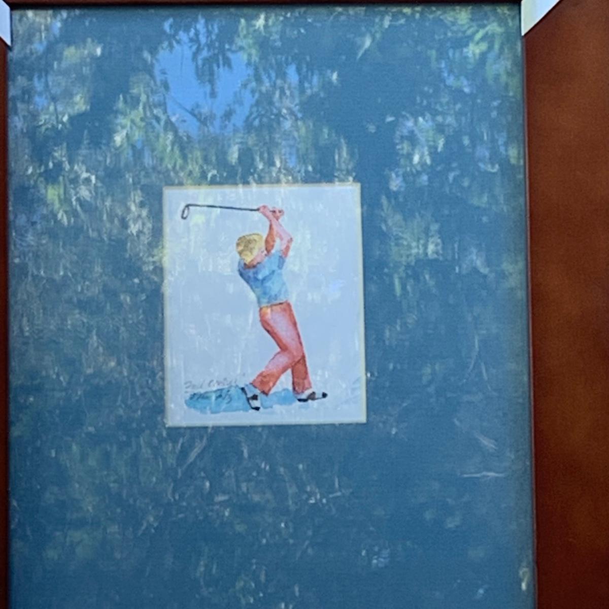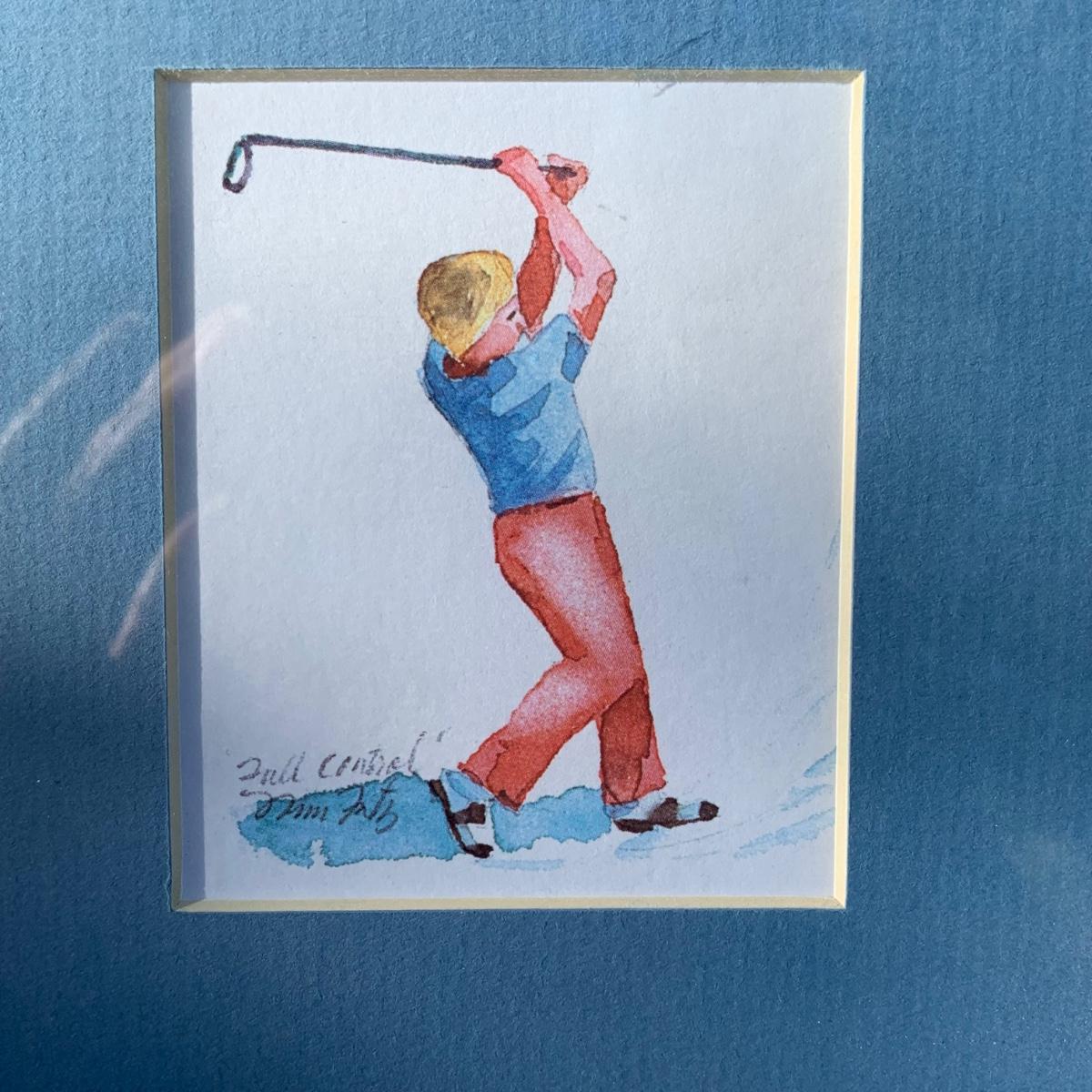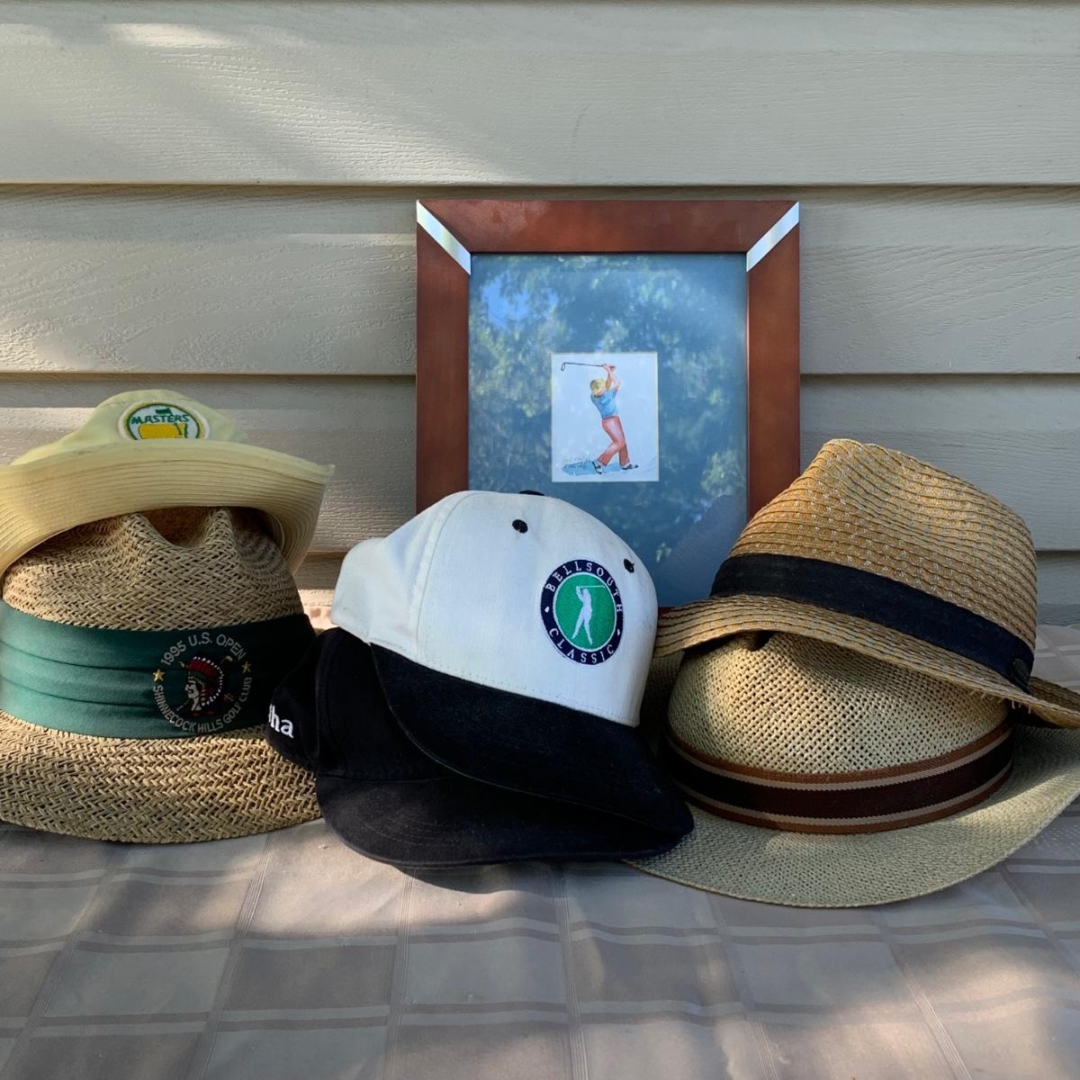 Lot 184R: Framed Watercolor "Full Control" by Nina Fritz & a Collection of Men's Golf Hats