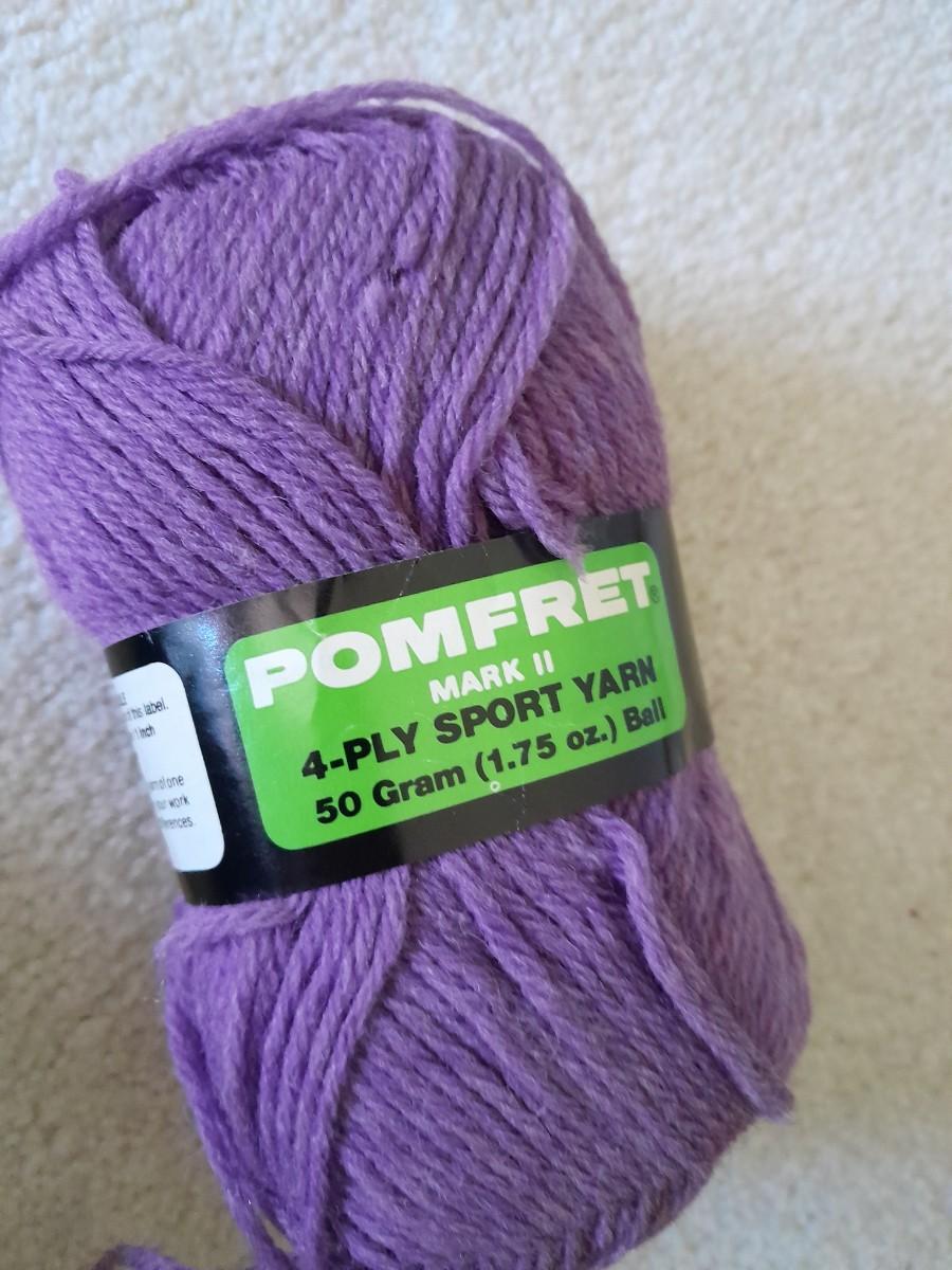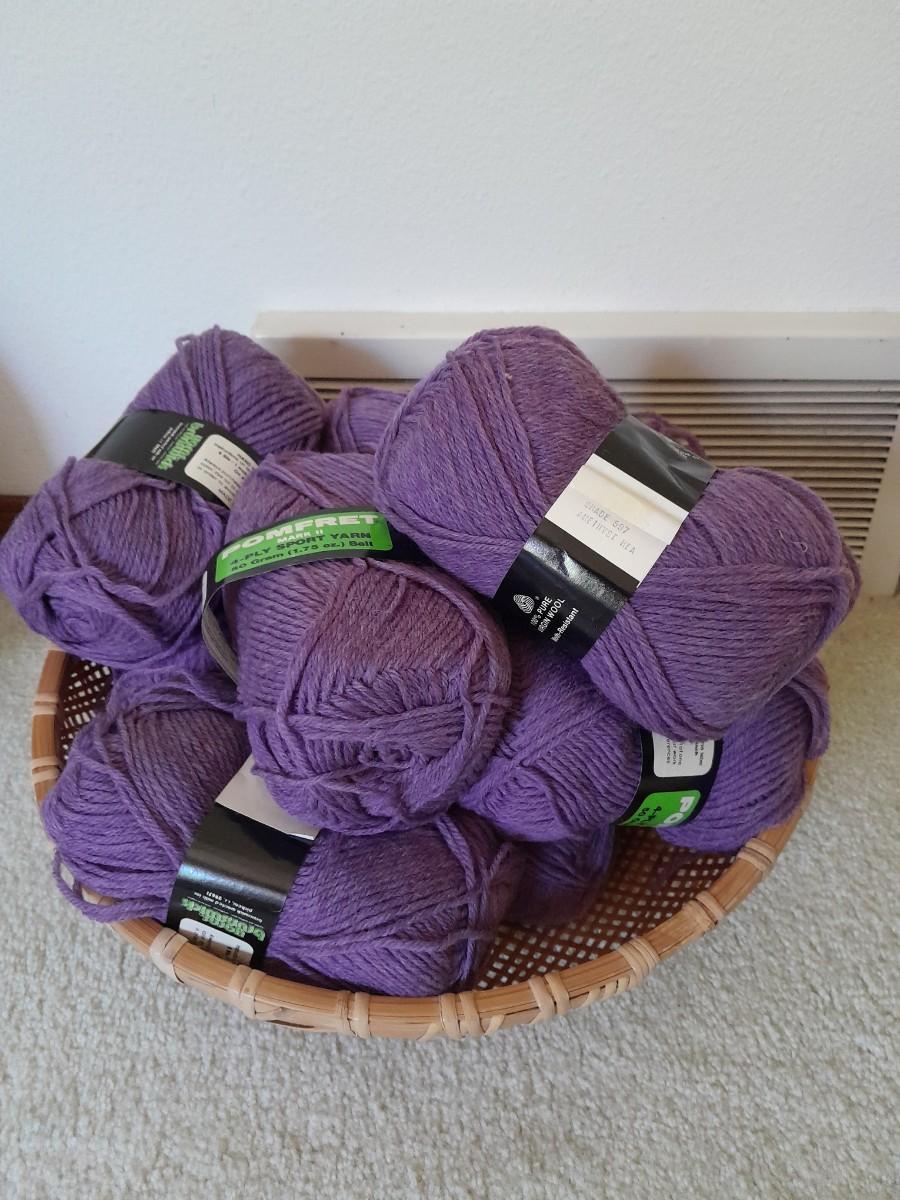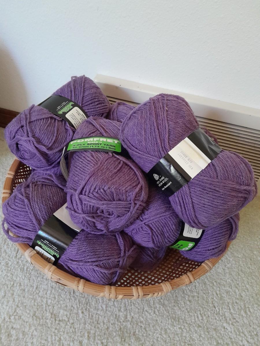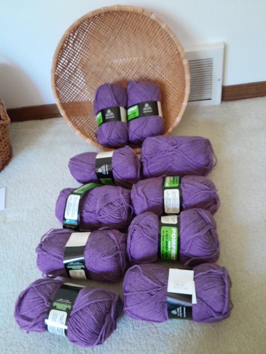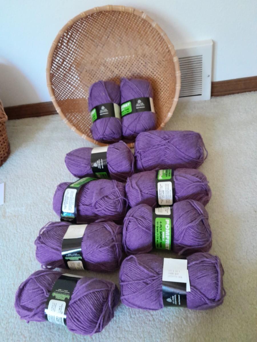 10 SKEINS OF AMETHYST POMFRET YARN IN BASKET