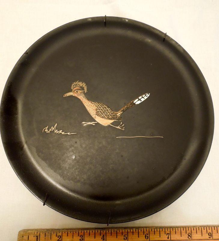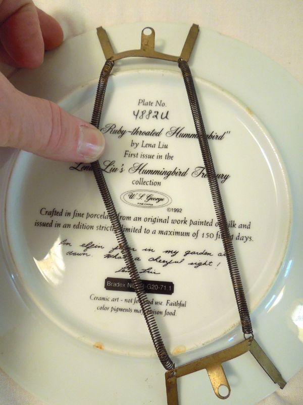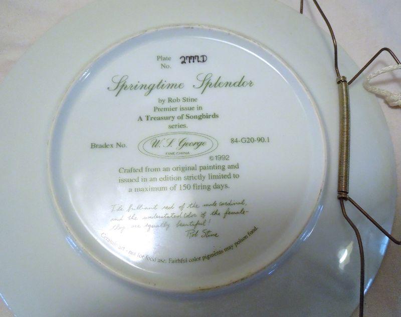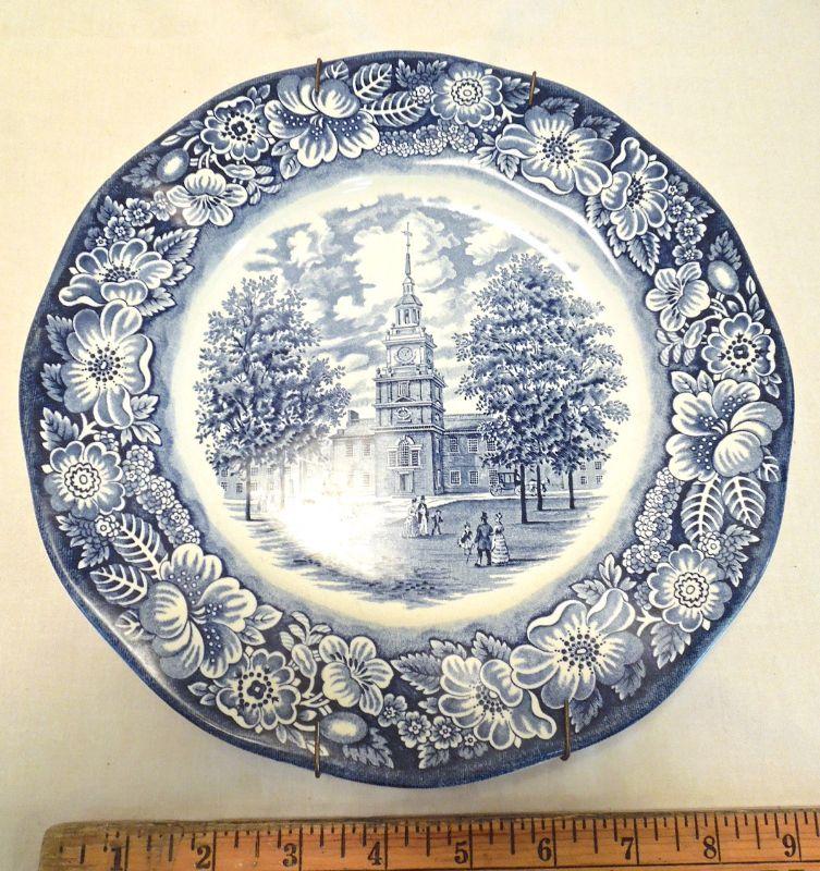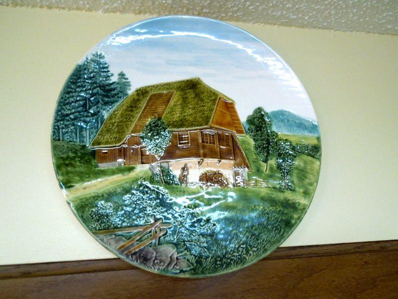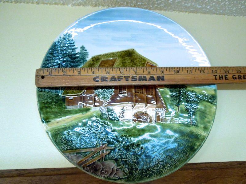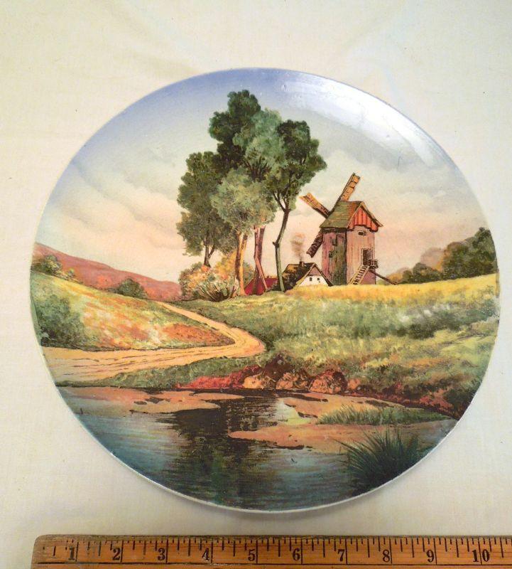 Ready to hang with plate hangers. An antique porcelain Villeroy Boch Wallerfangen 12" German windmill plate #3130 with Mercury ink stamp (1874-1909); a 13" antique German barn or lodge raised painted plate; 9" black lacquer plate from Cashmere; 2 W.L. George 1992 numbered Bradford Exchange plates of hummingbird and cardinal; a Japanese porcelain plate; two vintage George Jones and sons matching plates; an Old Canton Wedgewood plate; a vintage Courac lacquer roadrunner plate; and an ironstone "Liverty blue" Independence Hall 10" plate. No chips or cracks in plates.