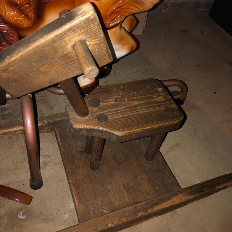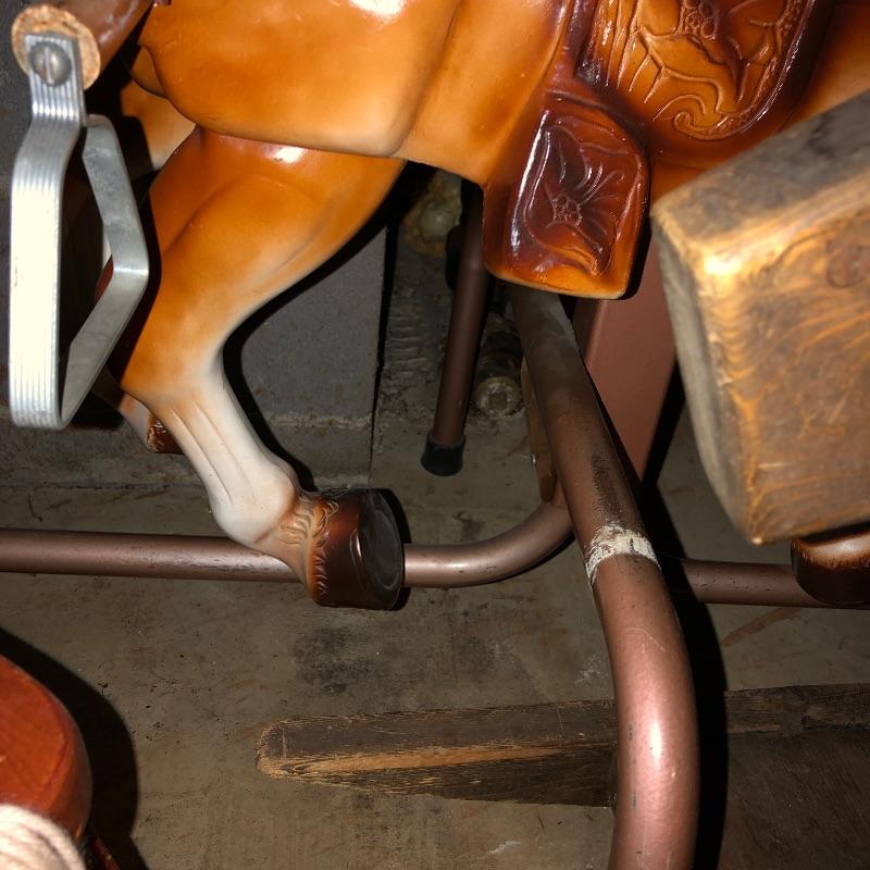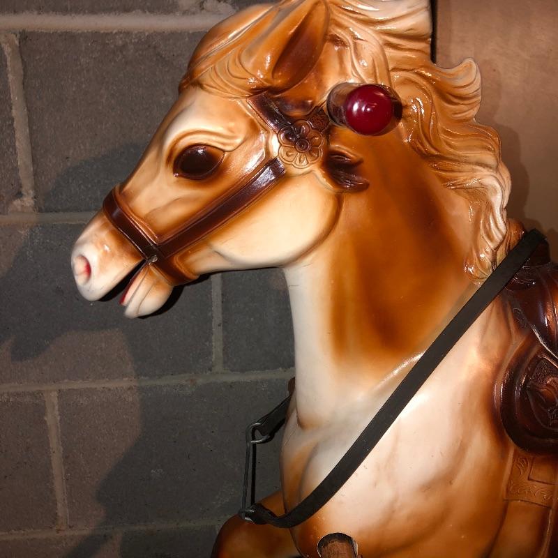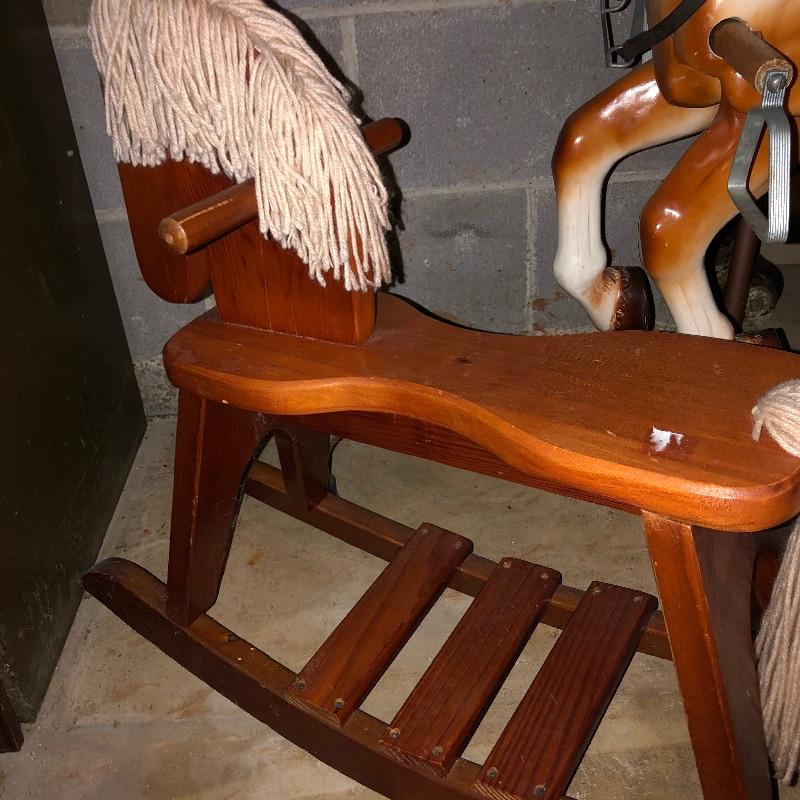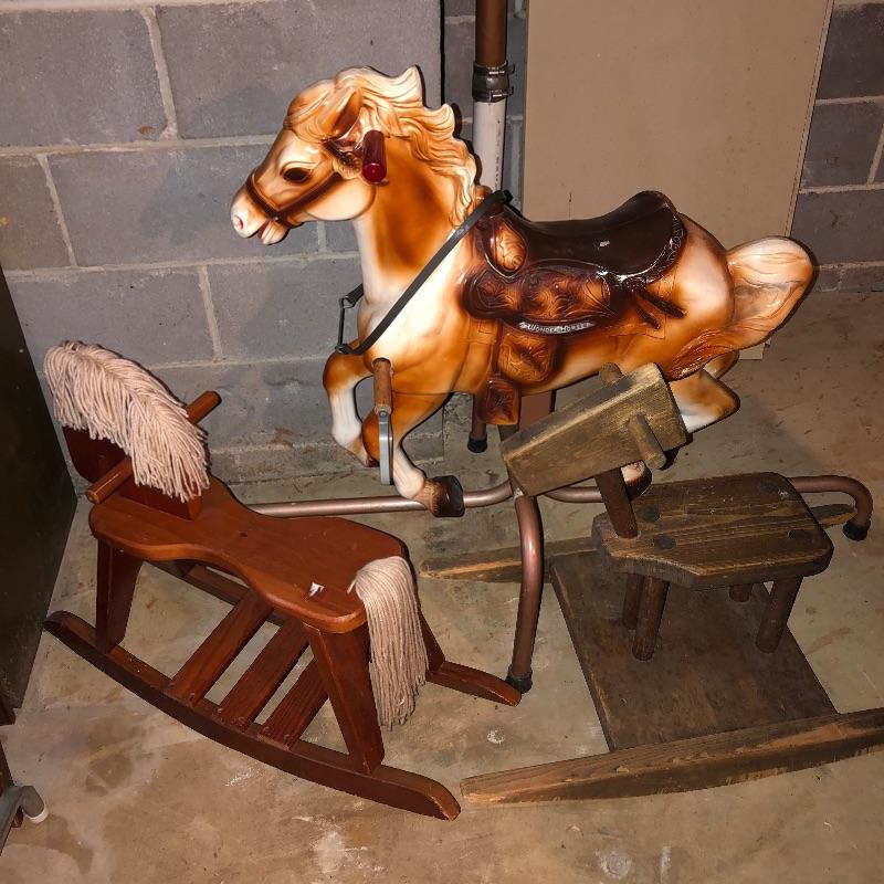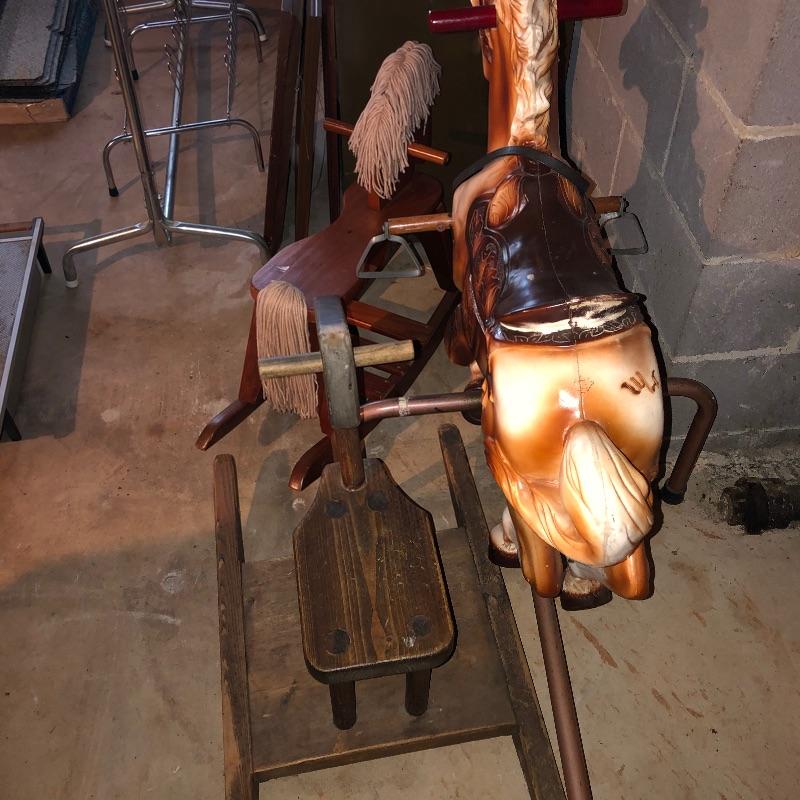 What a fun lot! Included in this lot are two smaller wooden rocking horses, and one larger plastic carousel horse marked Wonder Horse. Smallest horse is about 23in tall. The largest horse is about 35in tall.