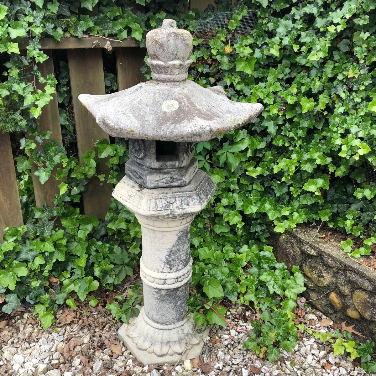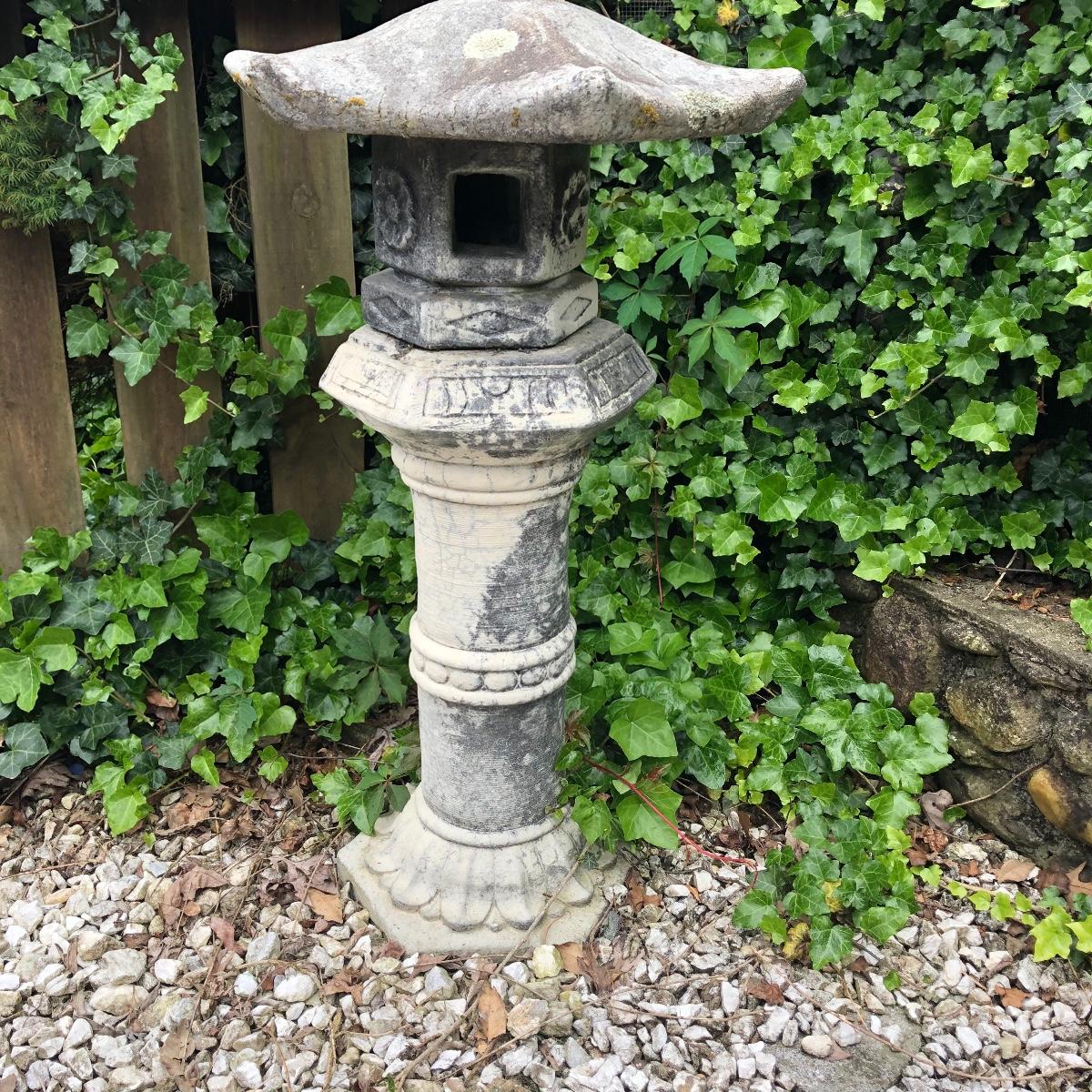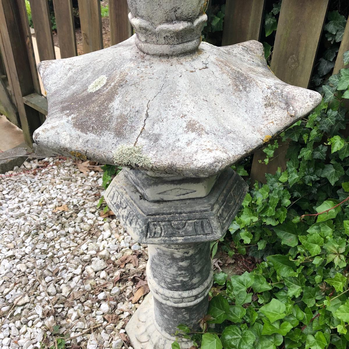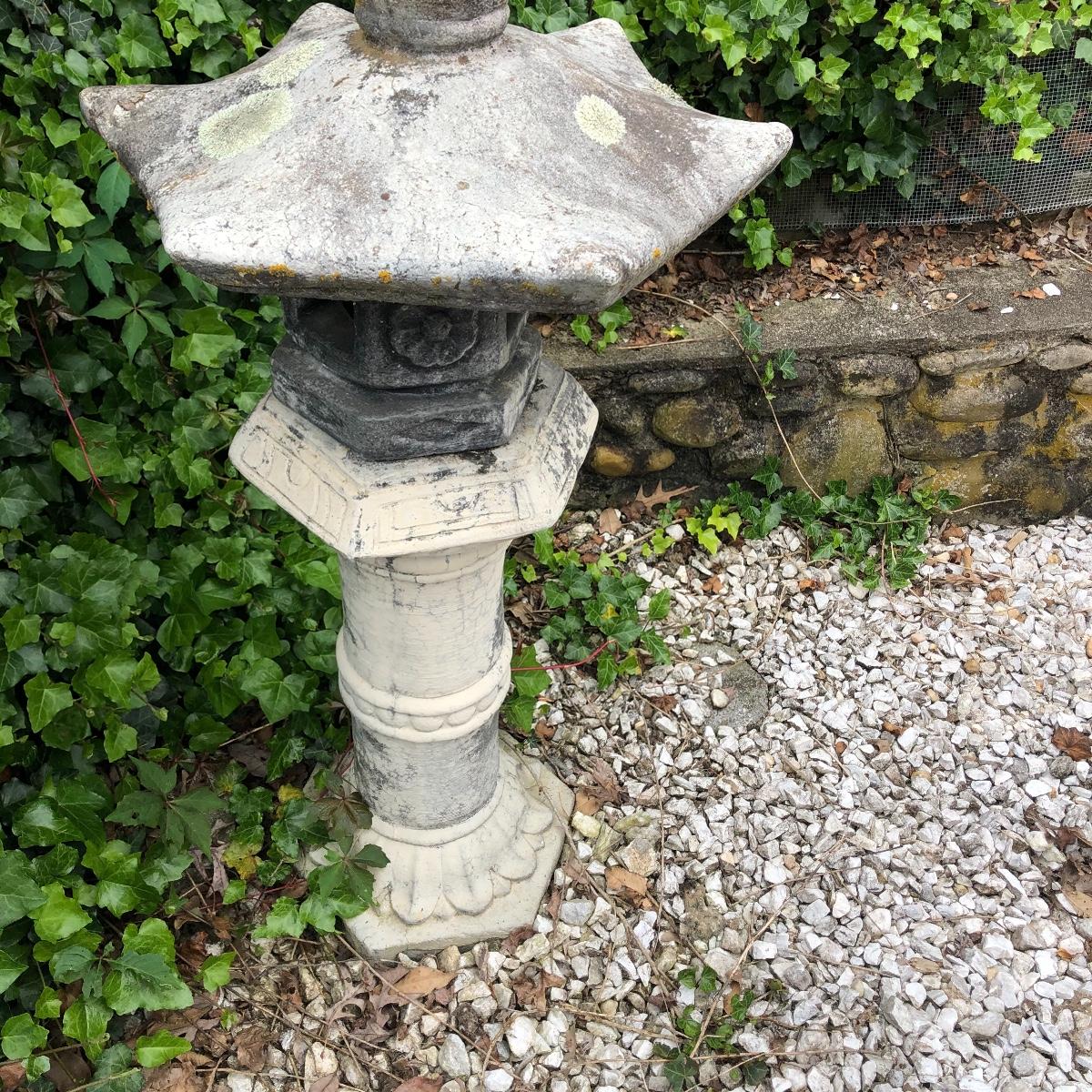Small stone pagoda on a tall pedestal. This concrete garden sculpture stands just under 4 feet high. It comes apart in a few pieces.