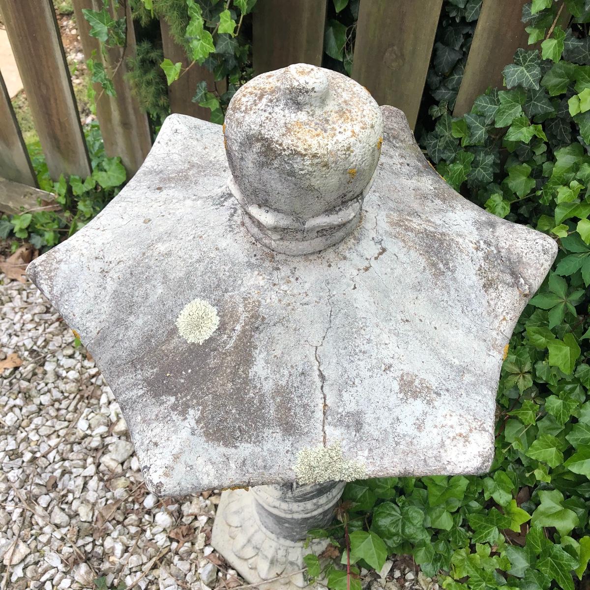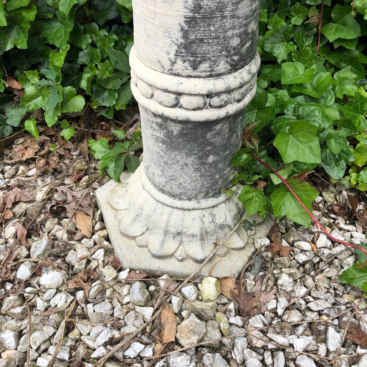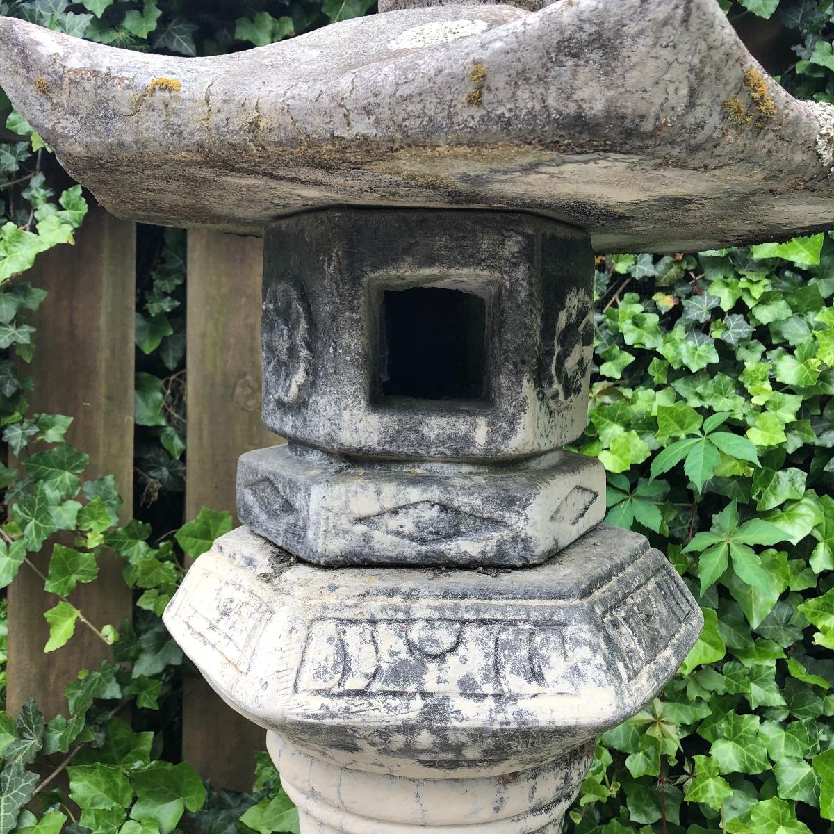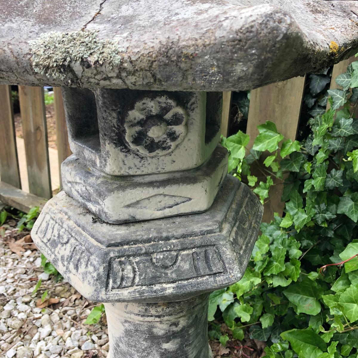 Small stone pagoda on a tall pedestal. This concrete garden sculpture stands just under 4 feet high. It comes apart in a few pieces.