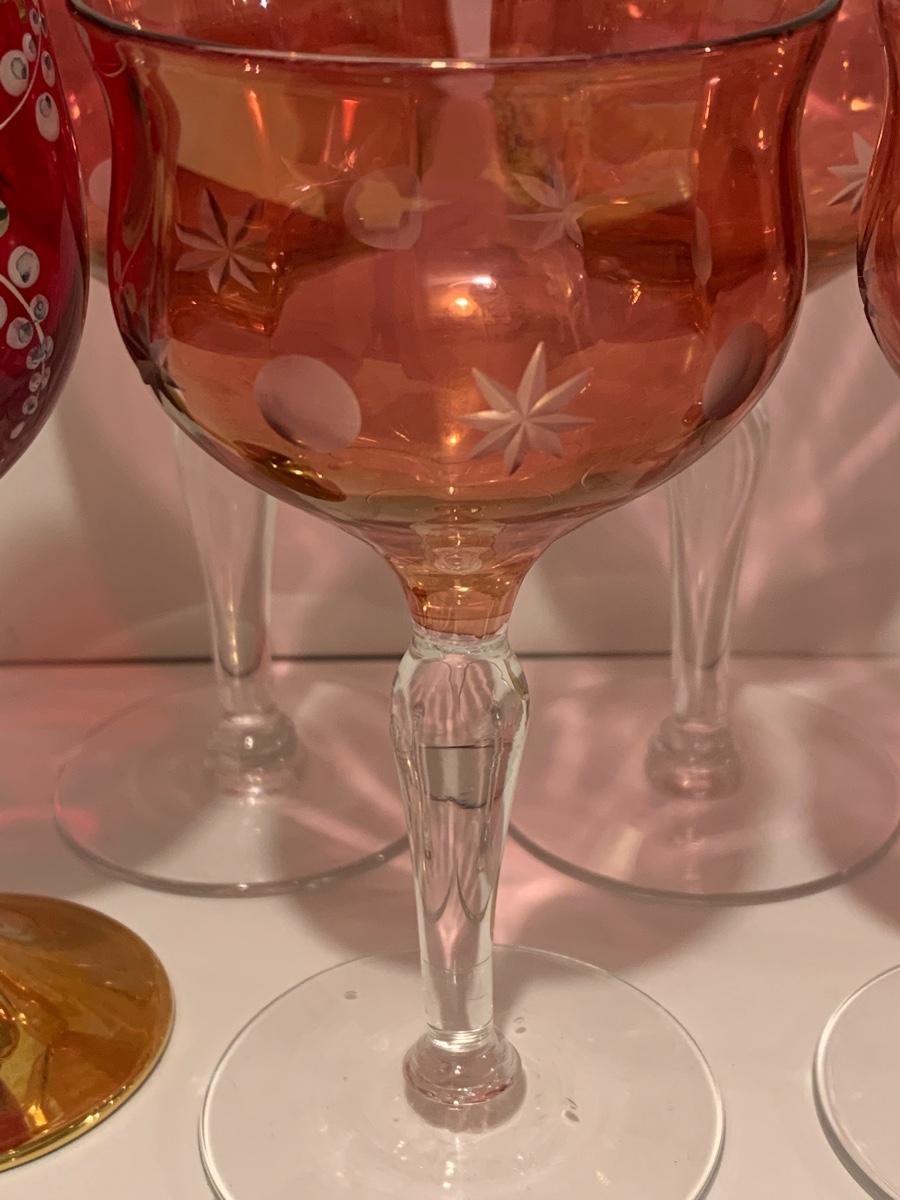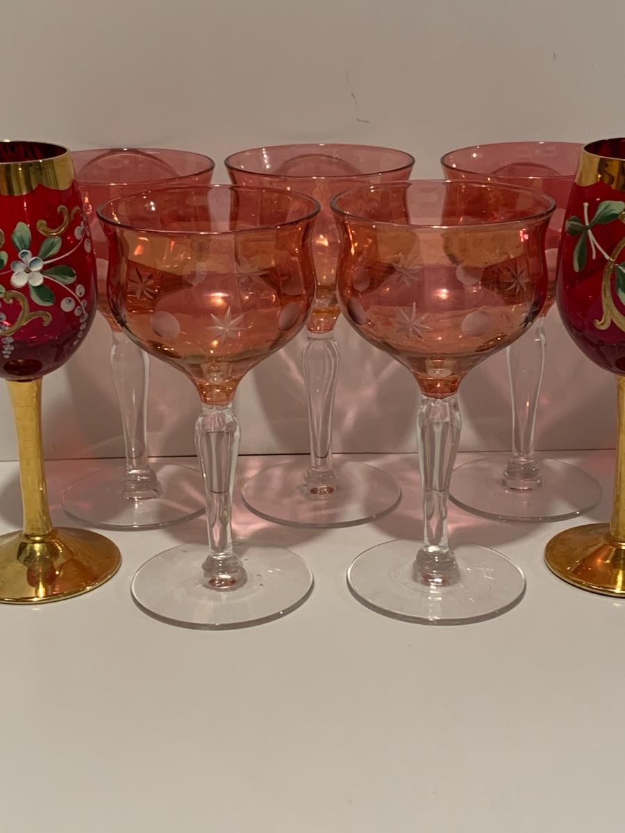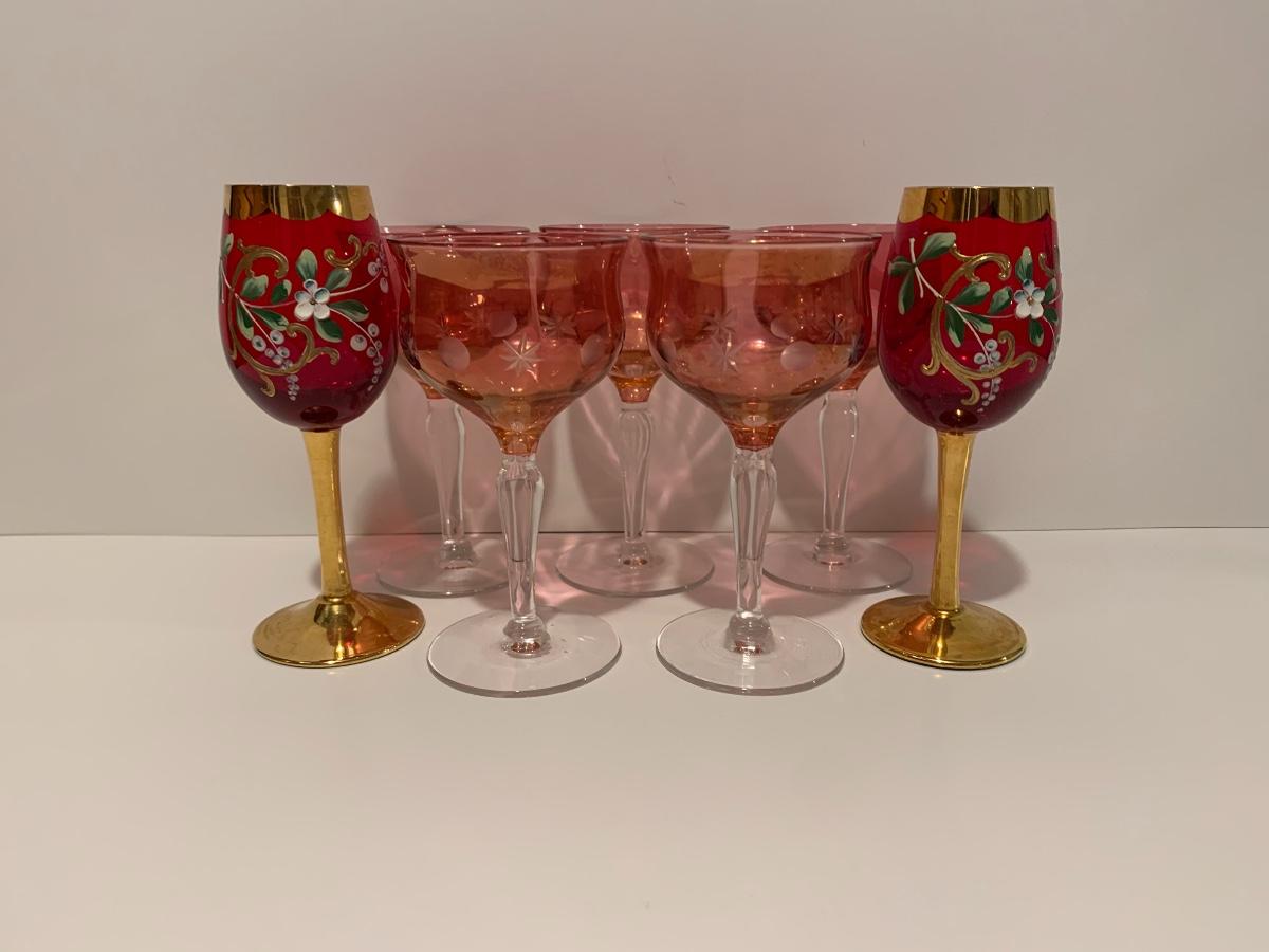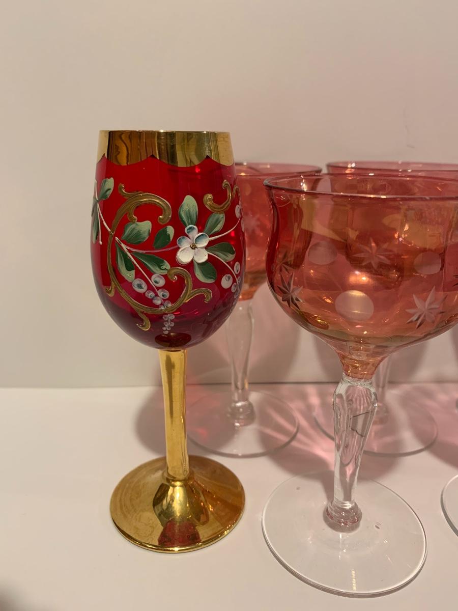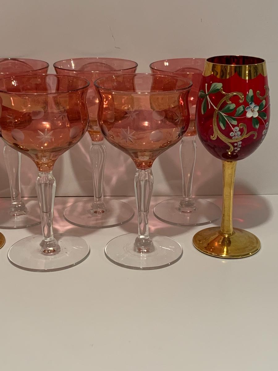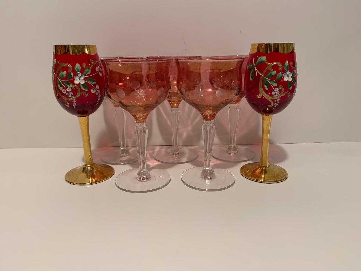Set of 2 beautiful hand painted ruby red wine glasses along with a set of 5 cranberry etched glasses.