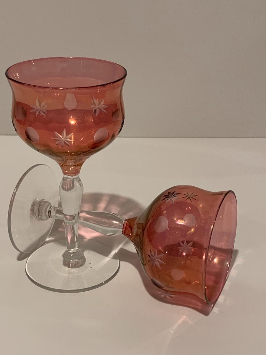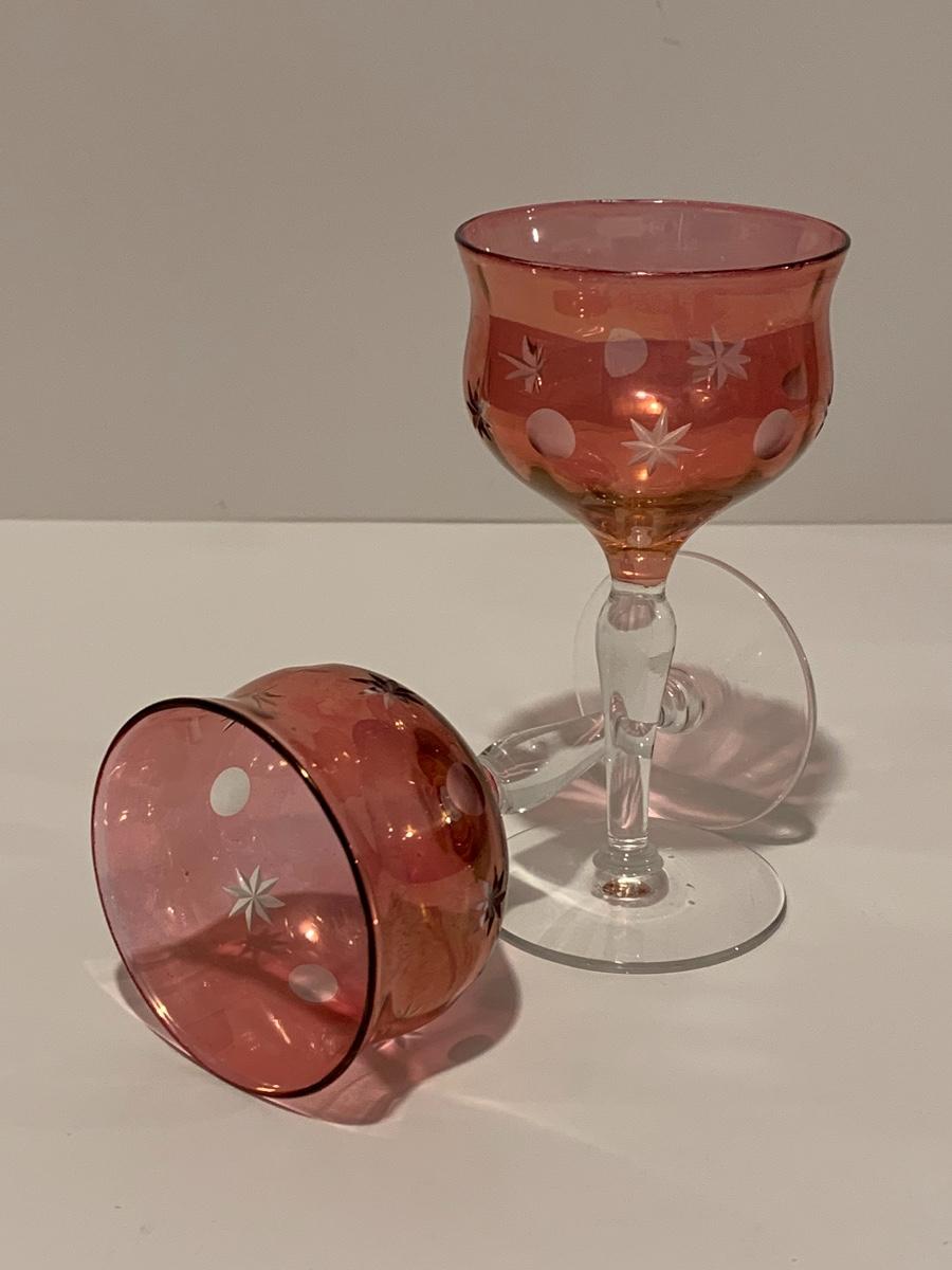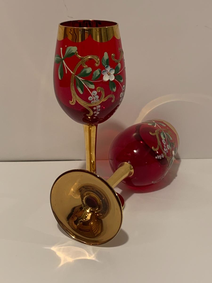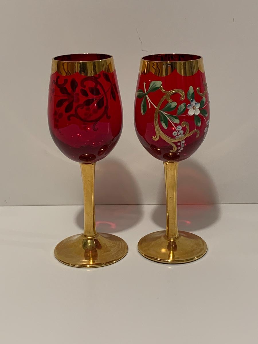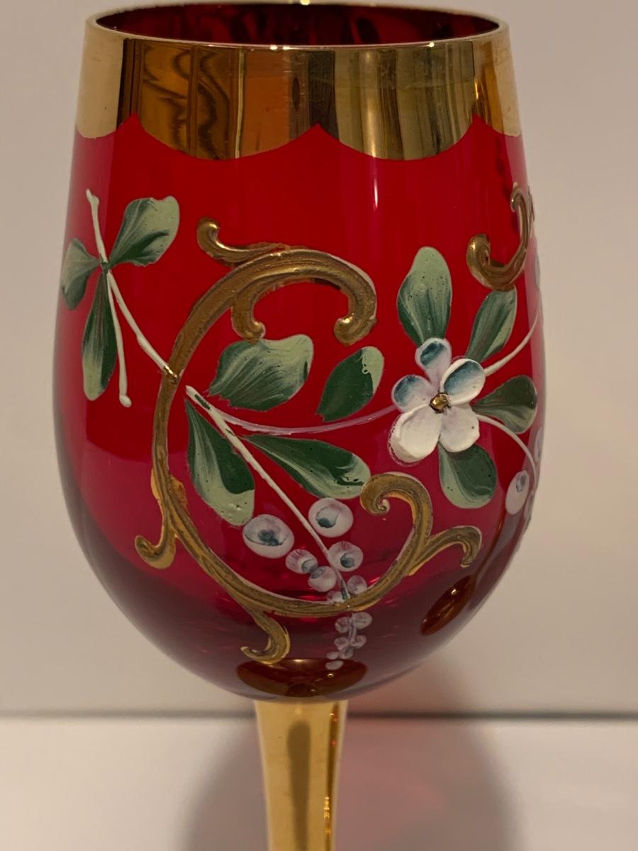 Set of 2 beautiful hand painted ruby red wine glasses along with a set of 5 cranberry etched glasses.