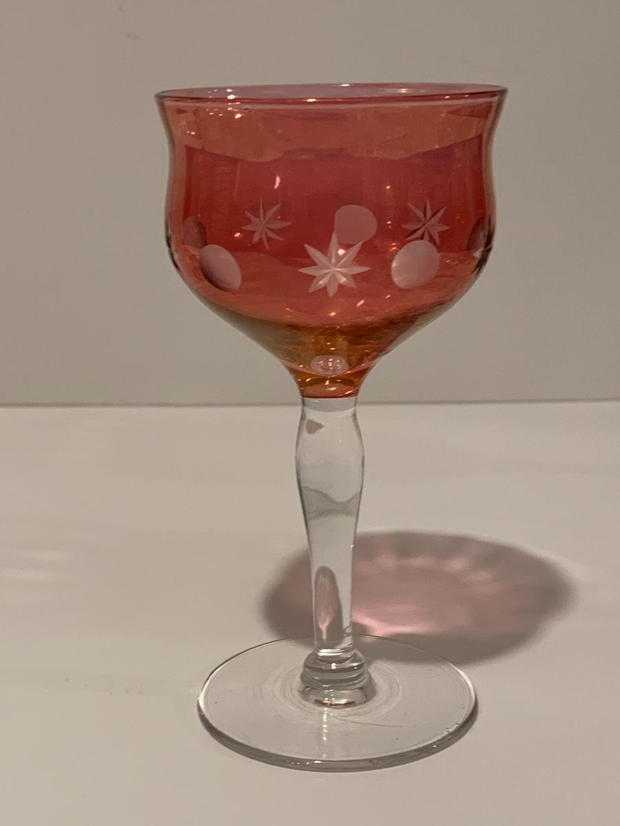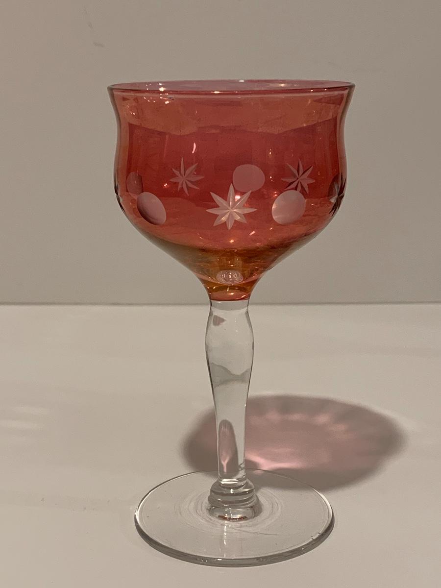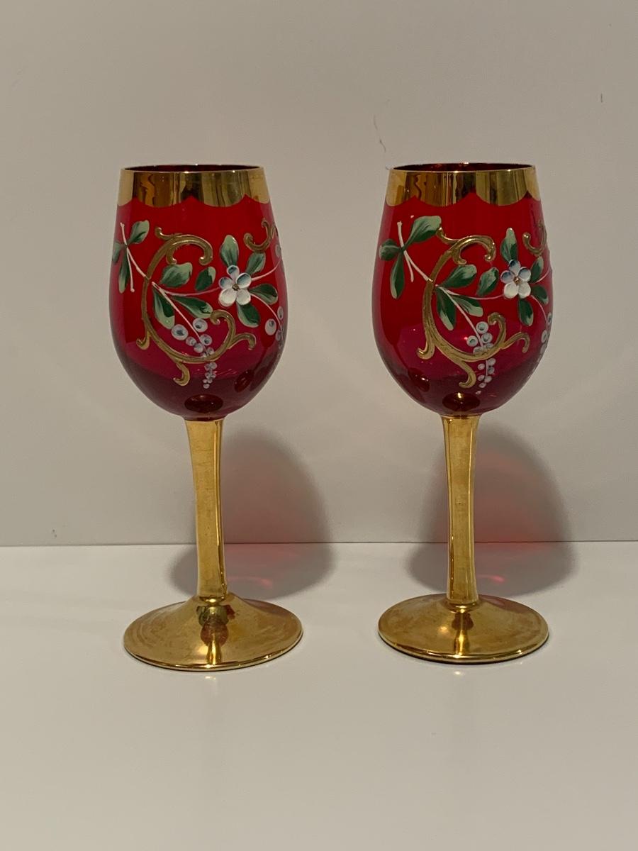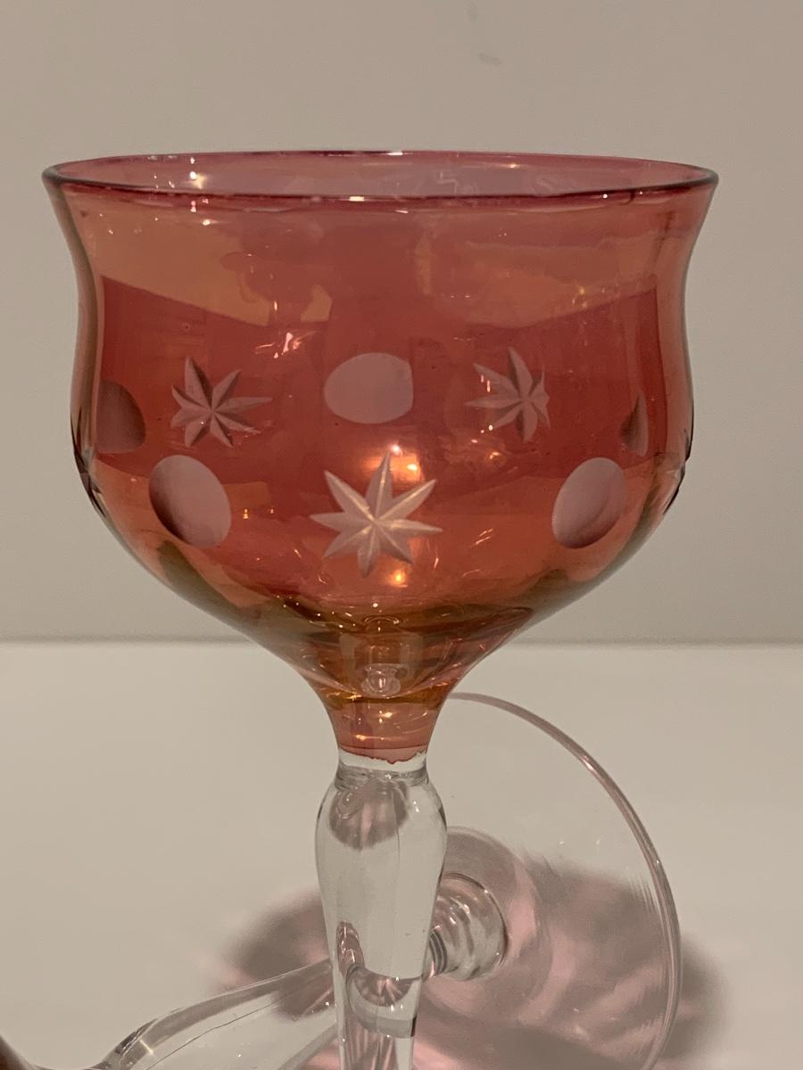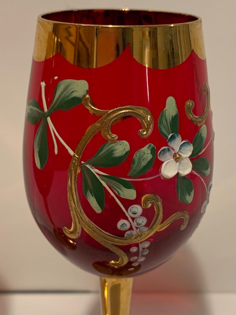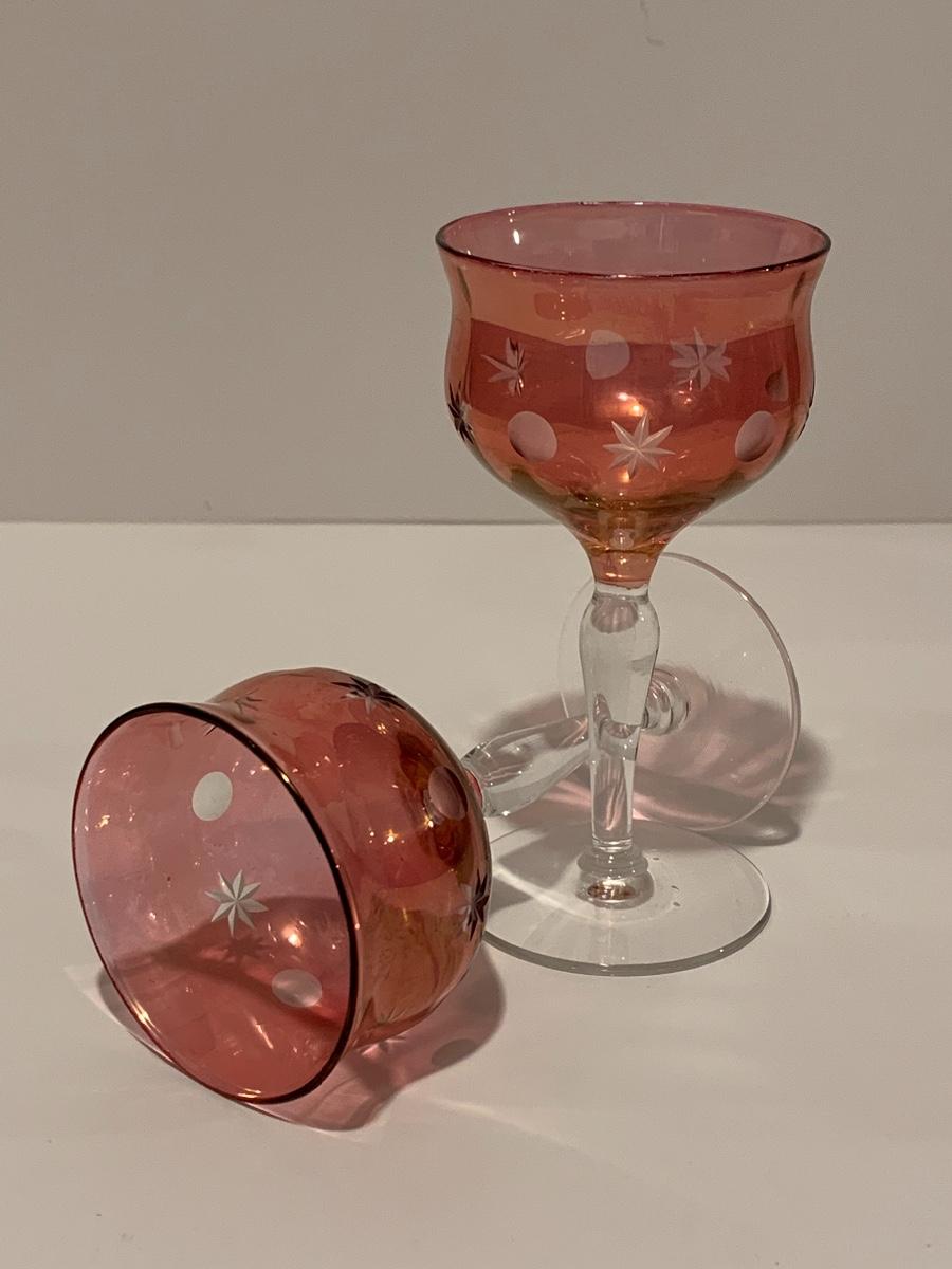 Set of 2 beautiful hand painted ruby red wine glasses along with a set of 5 cranberry etched glasses.