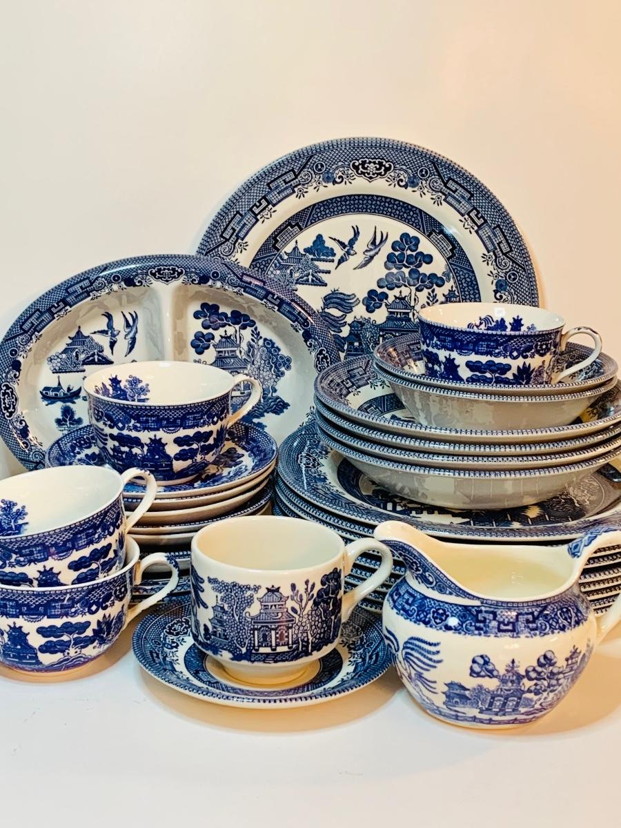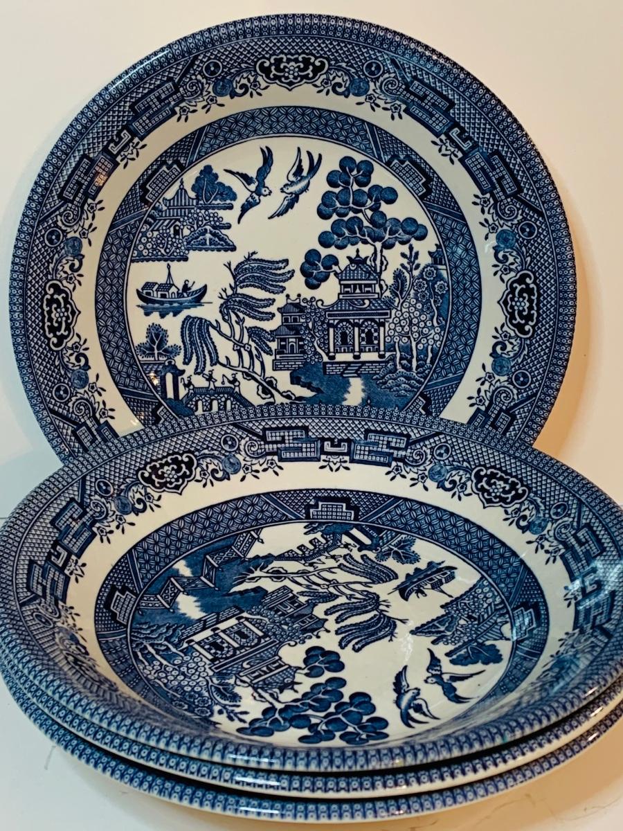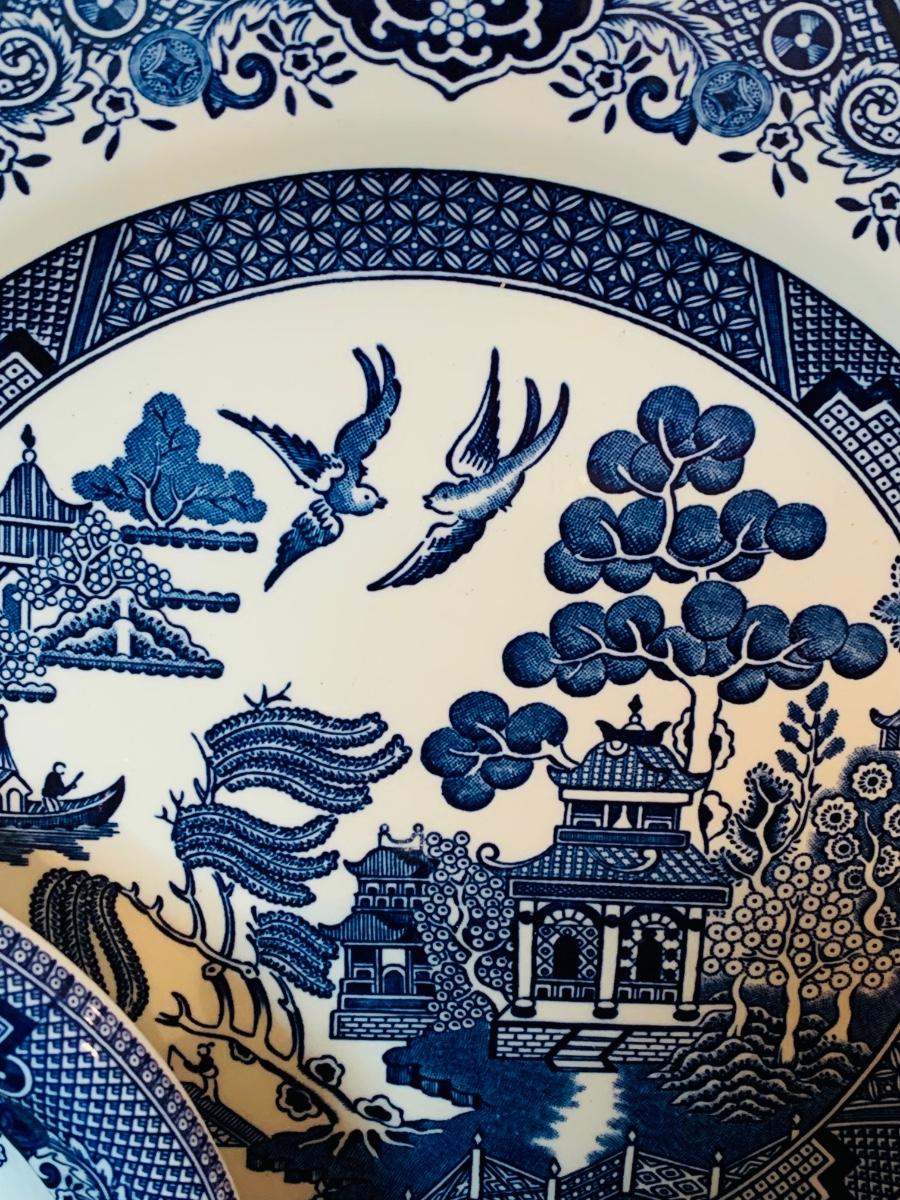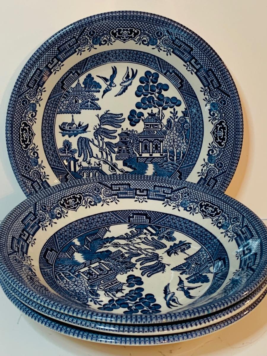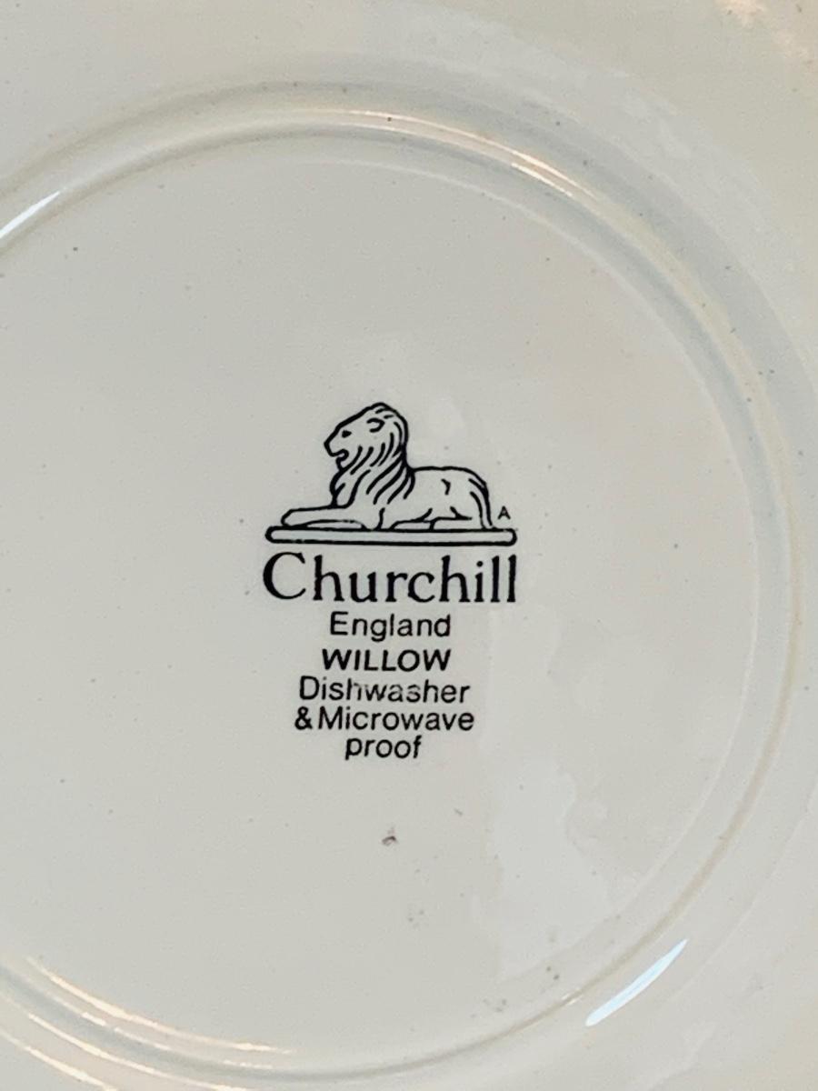 Lot 185: Vintage Mixed lot of Blue Willow Serving Pieces (Japan, and Churchill England)