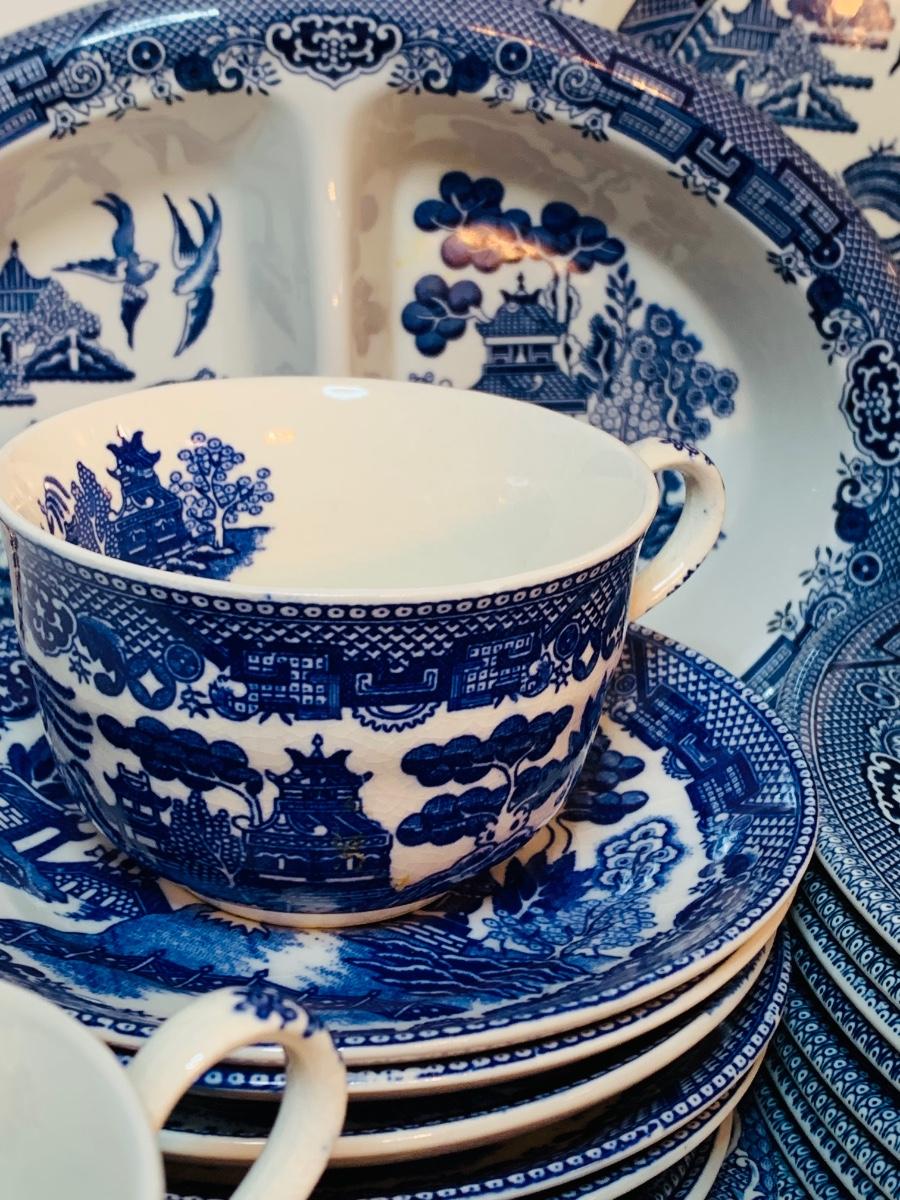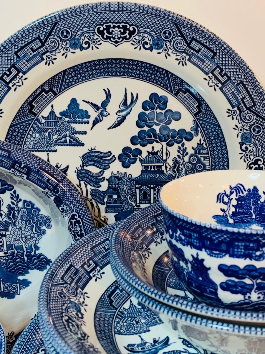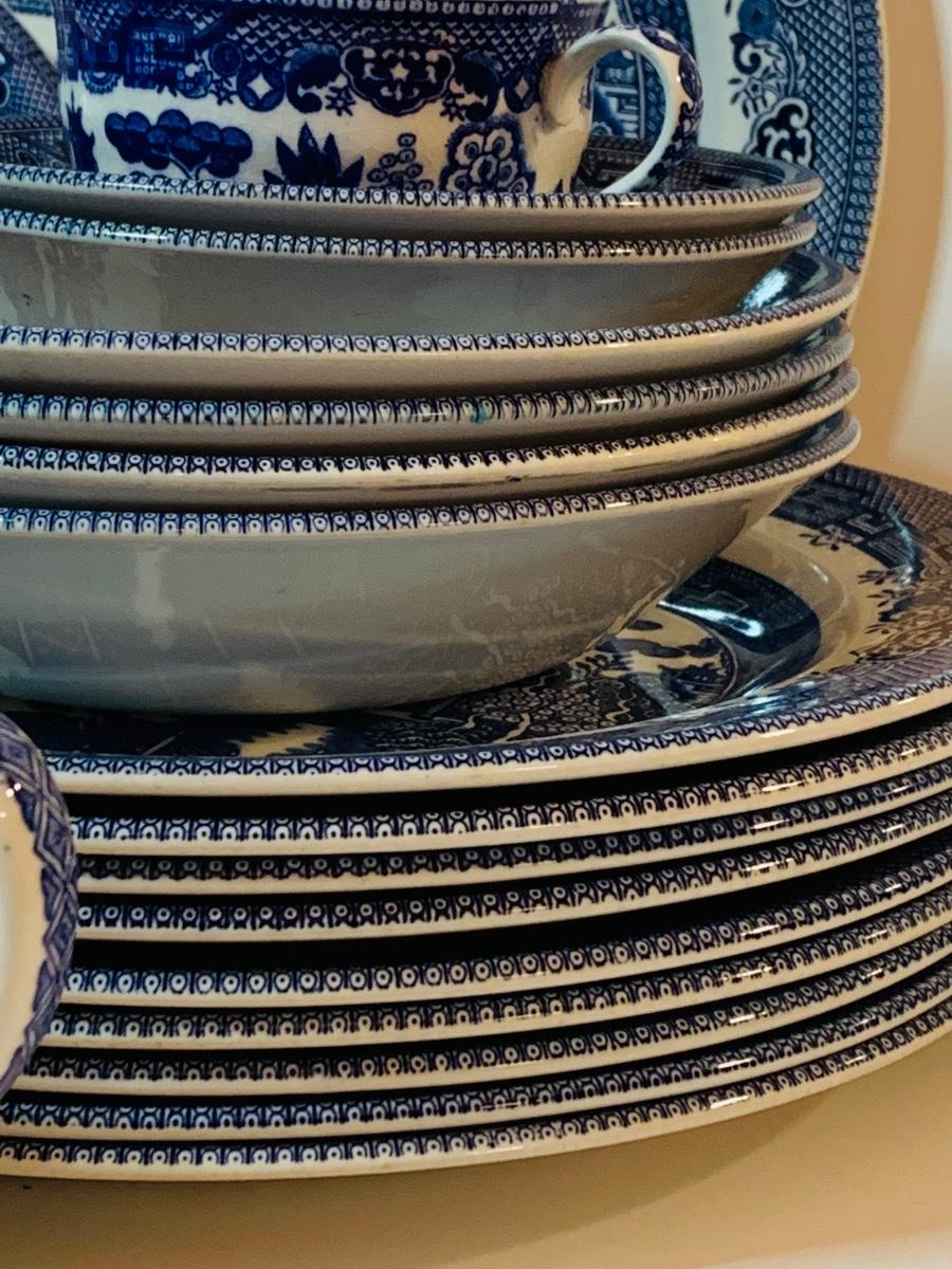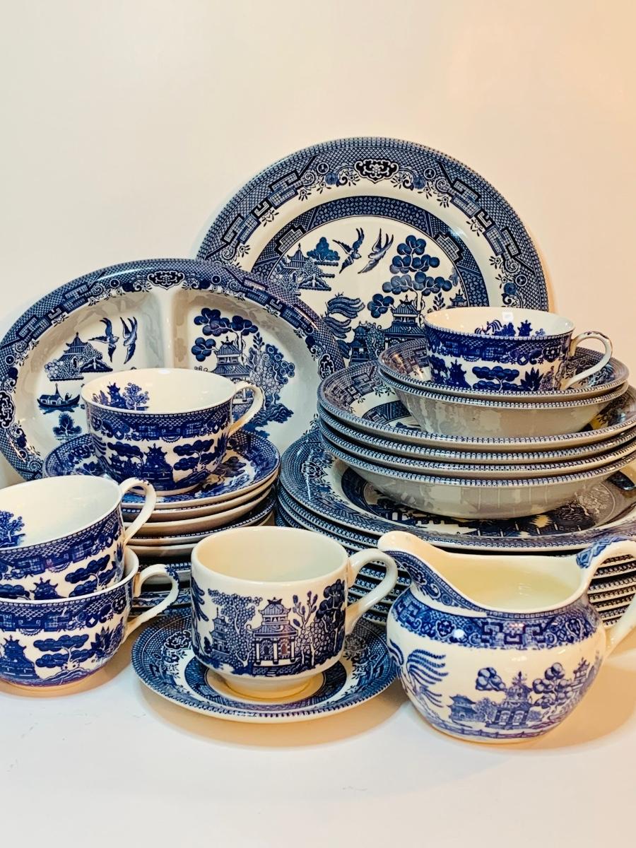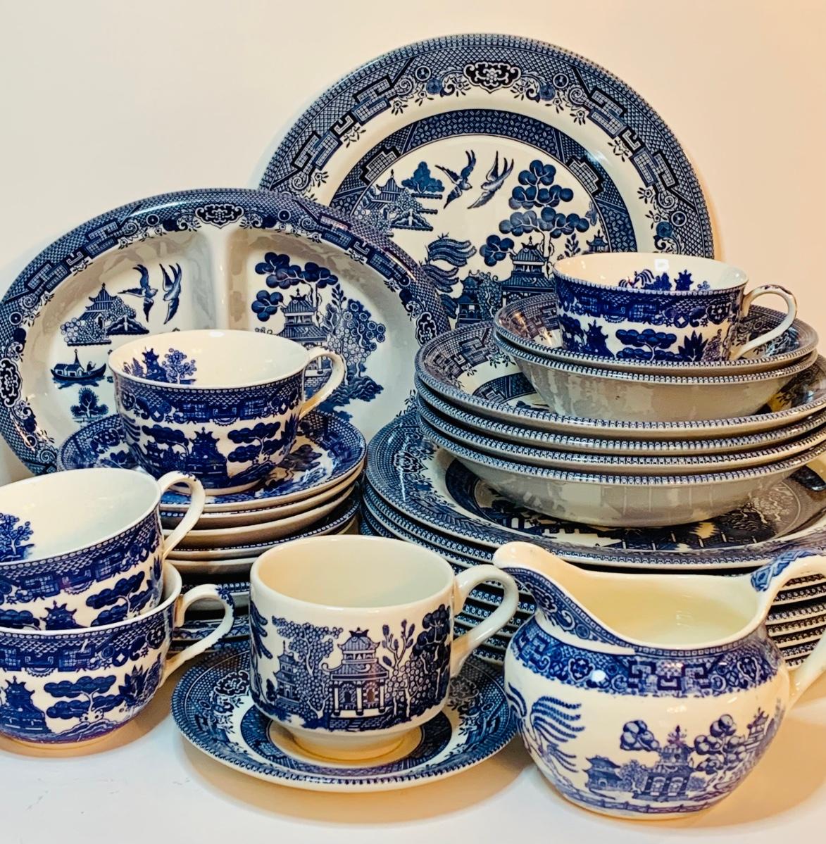 Lot 185: Vintage Mixed lot of Blue Willow Serving Pieces (Japan, and Churchill England)