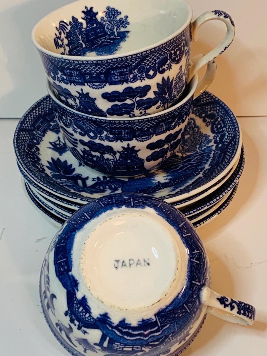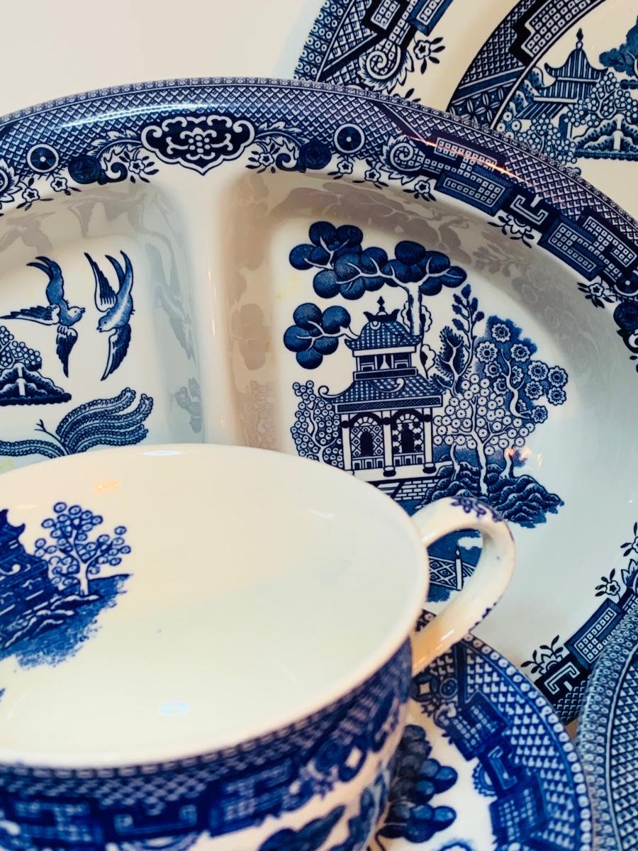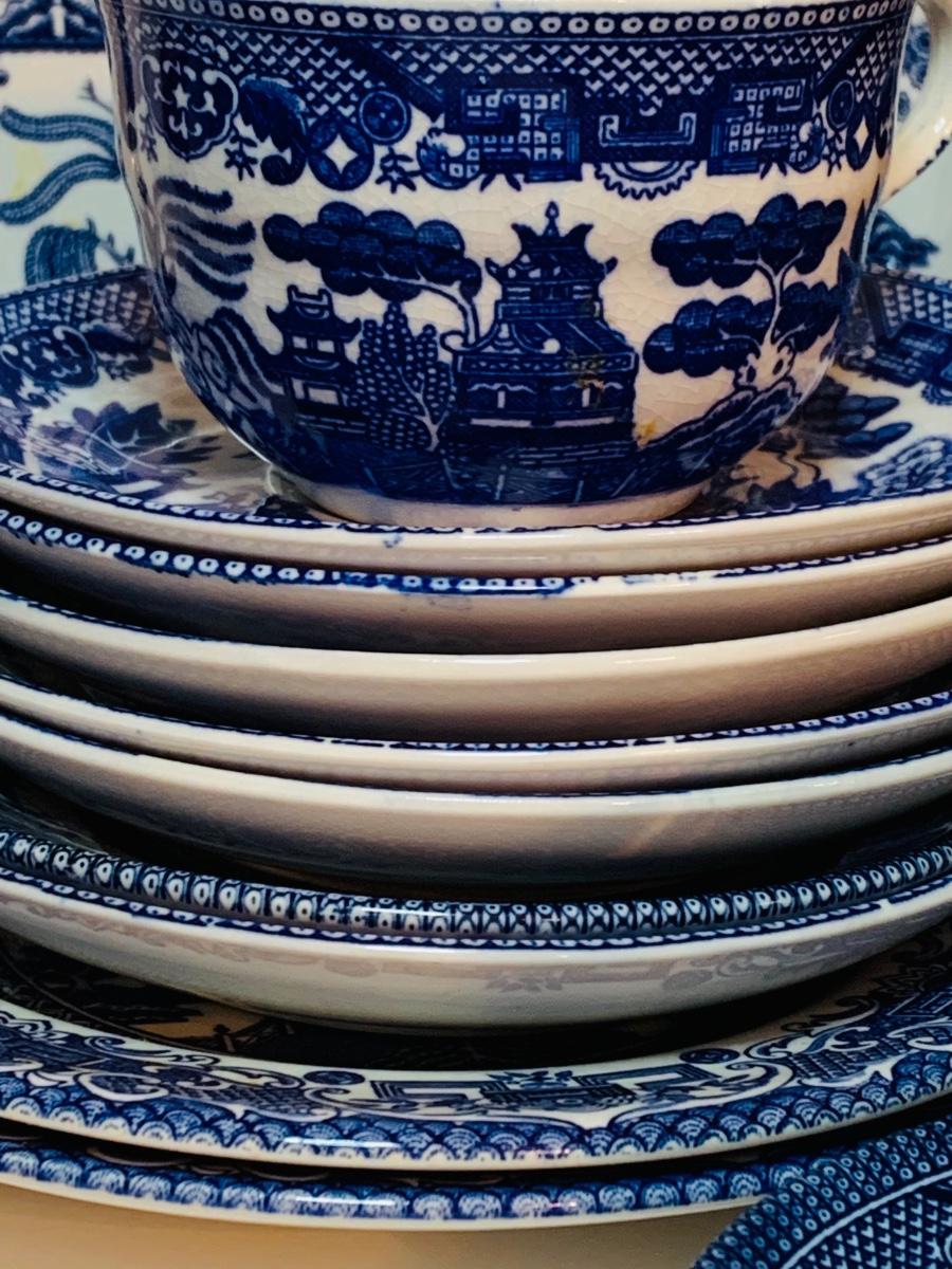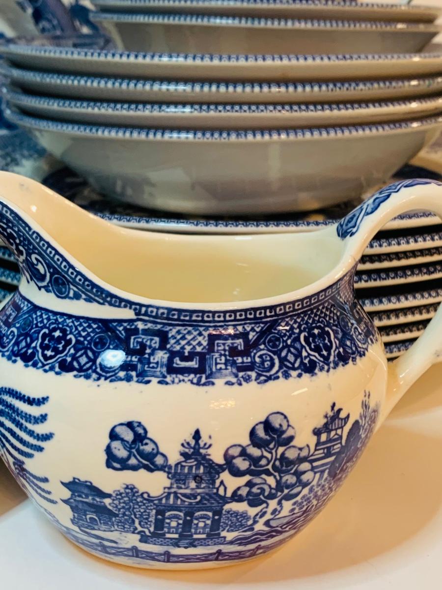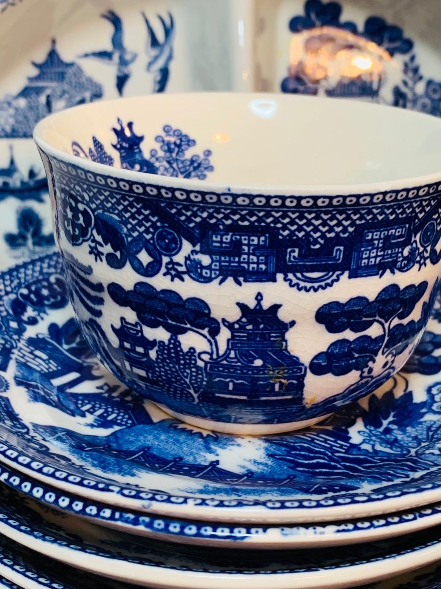 Lot 185: Vintage Mixed lot of Blue Willow Serving Pieces (Japan, and Churchill England)