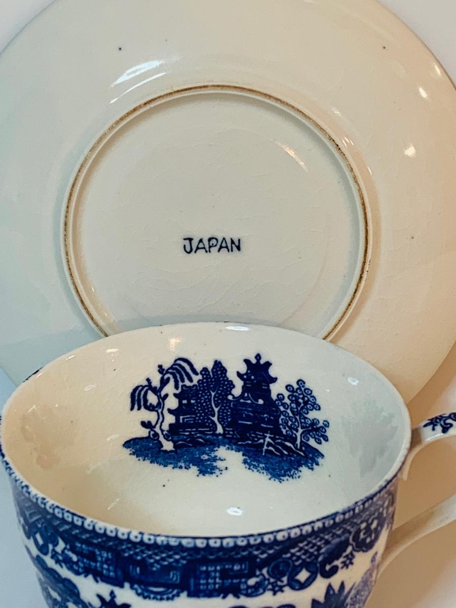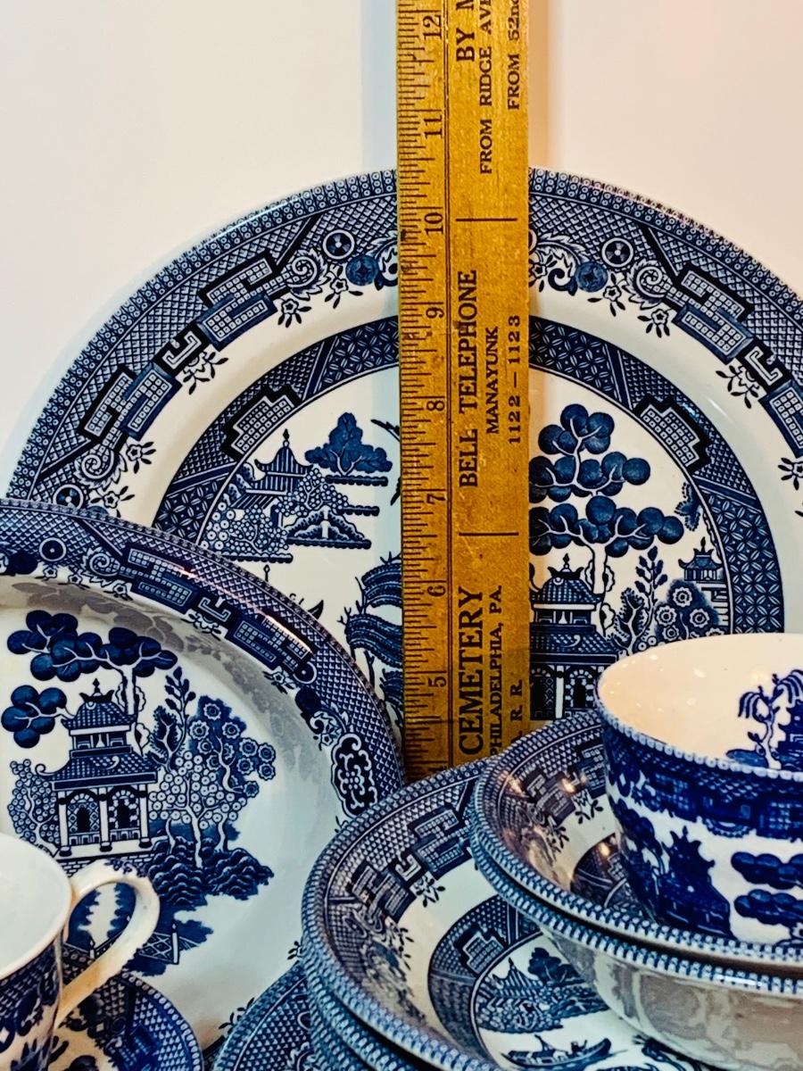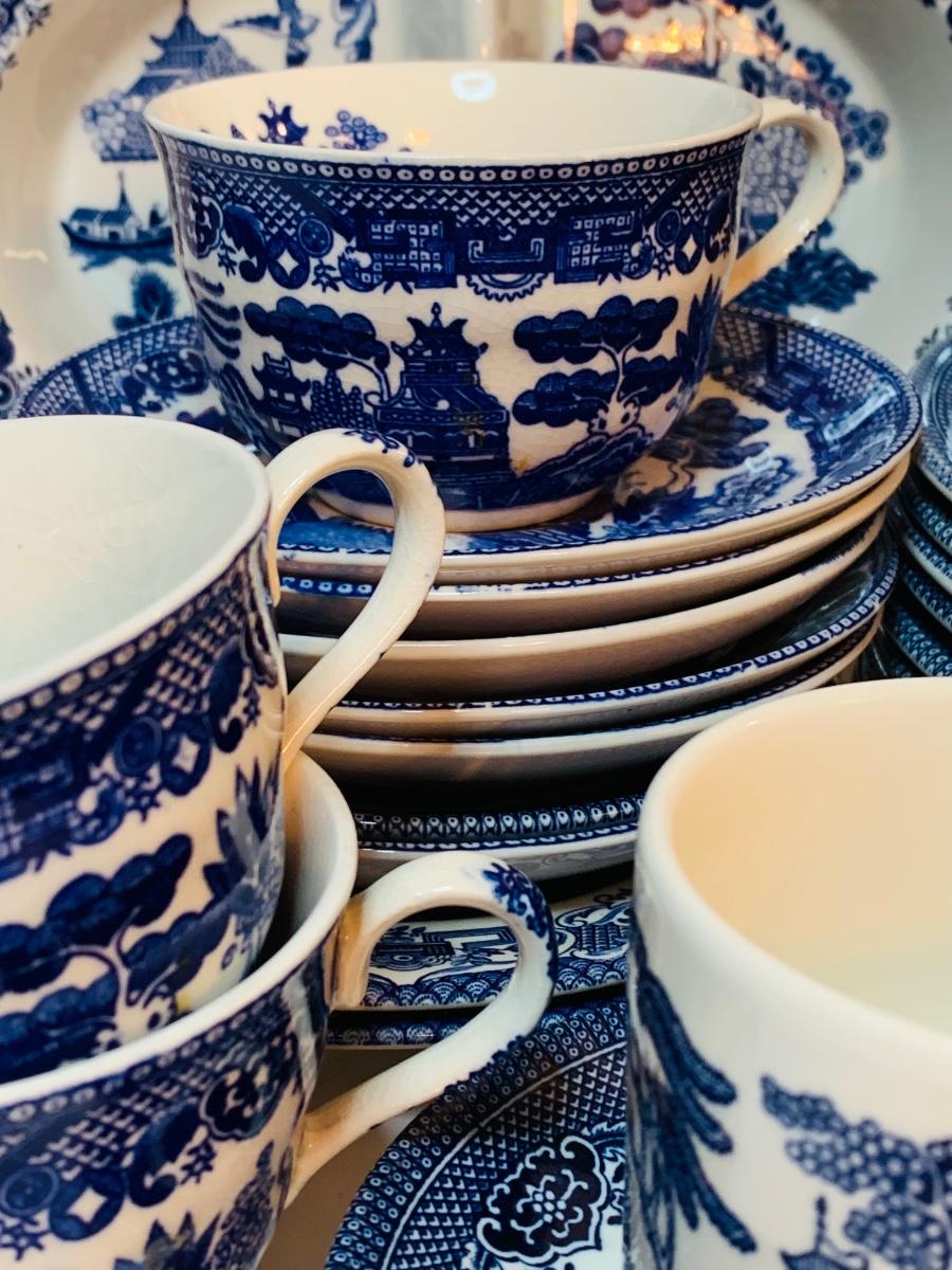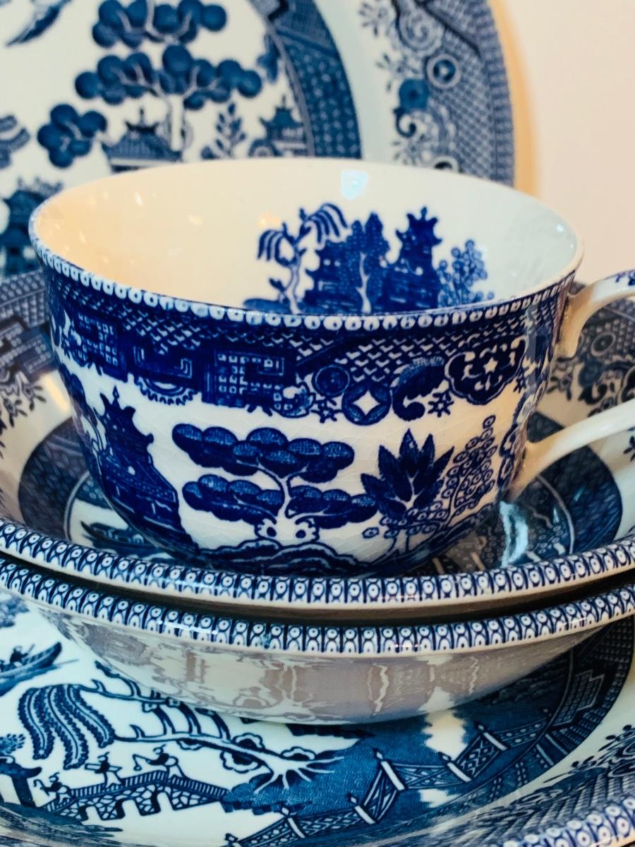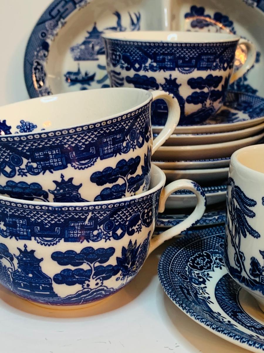 Lot 185: Vintage Mixed lot of Blue Willow Serving Pieces (Japan, and Churchill England)
