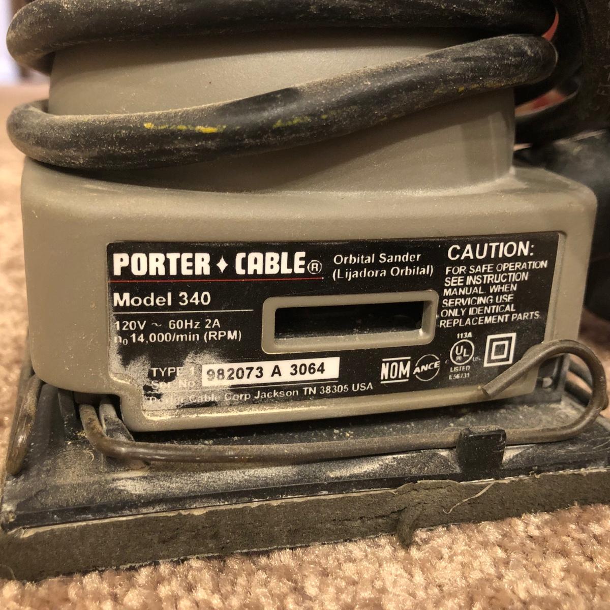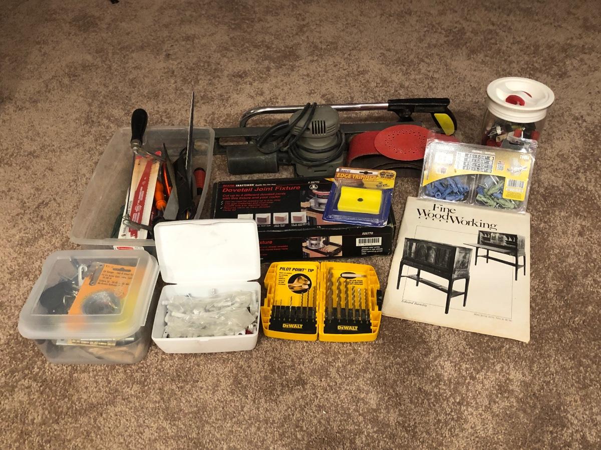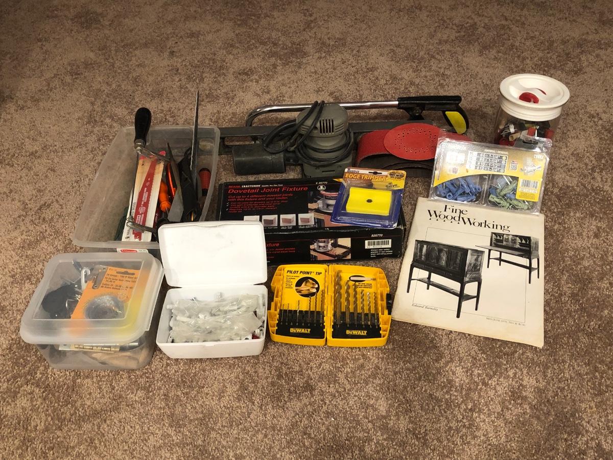 LOT 185M: Porter Cable Orbital Sander Model 340, Stanley Level, Stanley Hand Saw w/ DeWalt Blade, Sears/Craftsman Dovetail Joint Fixture in Box & More